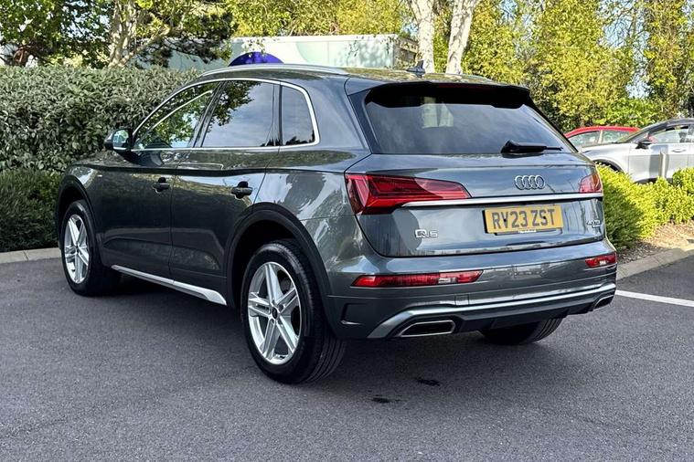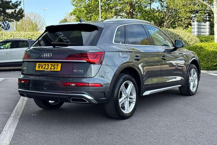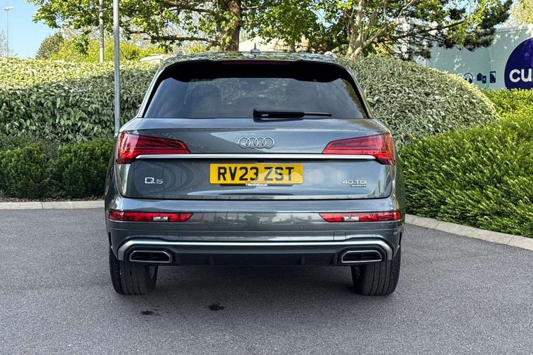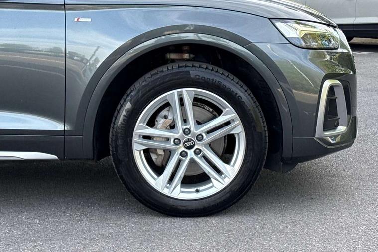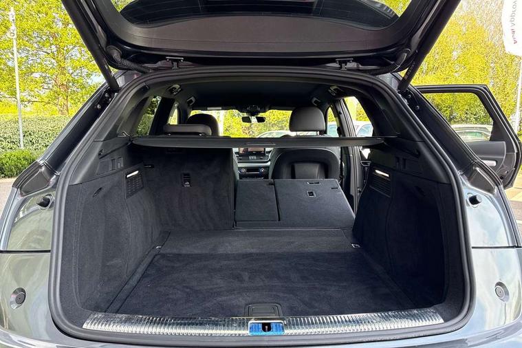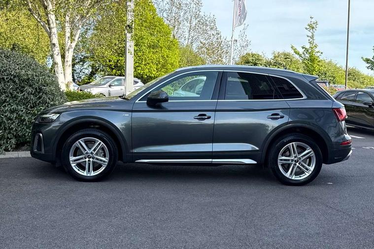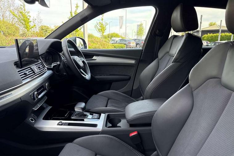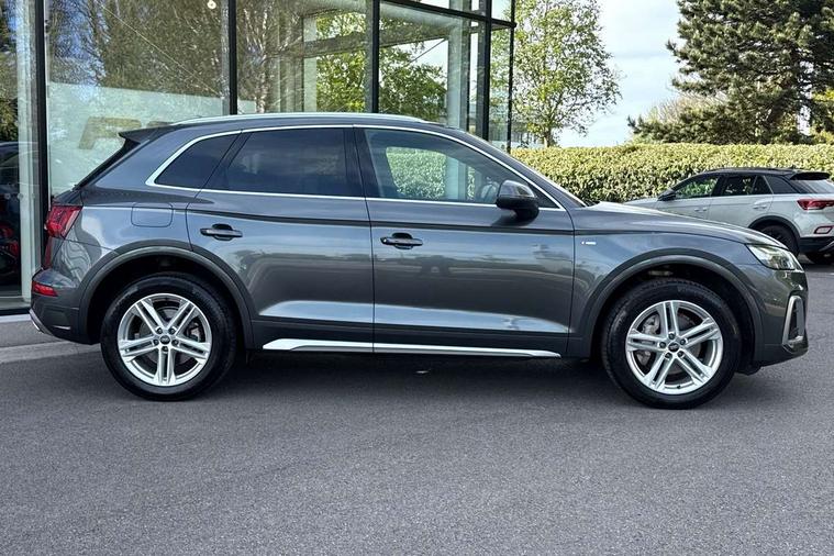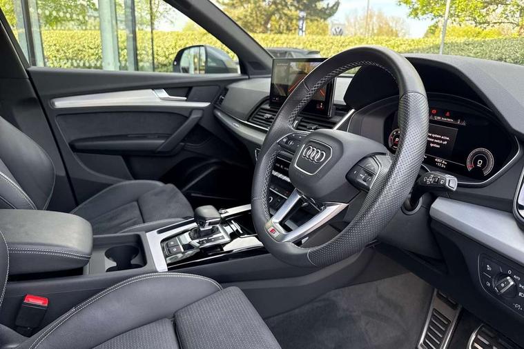 Acoustic front and rear parking sensor, Audi connect safety and service (e-call), Audi connect with Amazon Alexa Integration, Audi drive select, Audi virtual cockpit plus with 12.3" screen and three different layout designs, Audi wireless smartphone interface, Automatic start-stop system with coasting functionality and efficiency programme, Bluetooth interface, Electro - mechanical power assisted steering, MMI navigation plus with 10.1" touch screen, Power tailgate, Reversing camera, Service interval indicator, Voice control system with Audi hotword activation "Hey Audi", Diesel particulate filter, Quattro on demand, S line sports suspension, 2 x USB charging port with aux input socket, 8 loudspeakers, DAB Digital radio, Acoustic windscreen, Aluminium roof rails, Audi matrix LED headlights with dynamic front and rear indicators, Auto dimming door mirrors, Auto dimming frameless rear view mirror, Automatic headlight adjustment, Automatic headlights and windscreen wipers, Body colour bumpers, Body colour door mirrors, Body colour rear diffuser with matt aluminium silver surrounds, Body colour underbody protection, Chrome plated exhaust trims, Daytime running lights, Door sills in Selenite silver, Electric adjustable/heated/folding door mirrors, Front air inlet surrounds in aluminium, Front and rear electric windows, Front radiator grille in honeycomb design, Headlight washers, High level LED brake light, Lower bumpers painted in contrast Manhattan grey, Rear chrome trim strip below lights, Rear privacy glass and rear side windows, Rear side wing doors, Rear wiper, Roof bars, S Line badges on the front wings, S Line front and rear bumpers, S Line rear spoiler, S Line side skirts, 3 rear headrests, 3 spoke leather multifunction steering wheel with S badging perforated leather grips, 40:20:40 split folding 3 rear bench seat in 2nd row with rear centre armrest, Black cloth headlining, Comfort front centre armrest, Contrast stitching on seats, steering wheel and gear lever gaiter, Deluxe 3 zone electronic climate control, Front/rear floor mats, Gear lever in black leather, Heated front seats, Height adjustable front head restraints, Height/reach adjustable steering column, Illuminated door sill trims with S logo, Luggage compartment cover, Manual seat adjustment with 4-way electric lumbar support, Removable luggage compartment floor, Single front passenger seat, Stainless steel pedals, Sunvisors with vanity mirrors, High gloss pack - Q5, LED interior light pack - Q5, 3 point seatbelts on all seats, 6 airbags - Driver, front passenger, curtain and side airbags, Electrically operated child locks on rear doors, Electromechanical parking brake, Electronic stabilisation control including ABS, ASR and EDL, First aid kit with warning triangle and vests, Front passenger airbag deactivation, Hill descent control, Hill hold assist, ISOFIX child seat mounting for front passenger seat and ISOFIX child seat mounting with Top Tether for outer rear seats, Multi collision brake assist, Pop-up bonnet for pedestrian protection, Pre sense city, Seat belt force limiter, Seatbelt monitoring, Tyre pressure warning, Anti theft alarm, Anti-theft wheel bolts, Keyless Go access/ignition system, Remote central locking, Air vents inserts and centre console in gloss black, Matt brushed aluminium inlays,