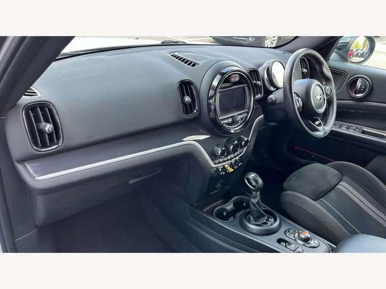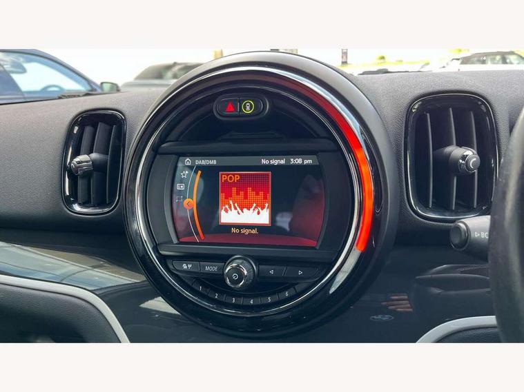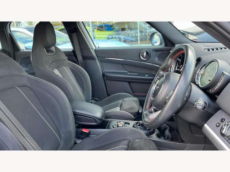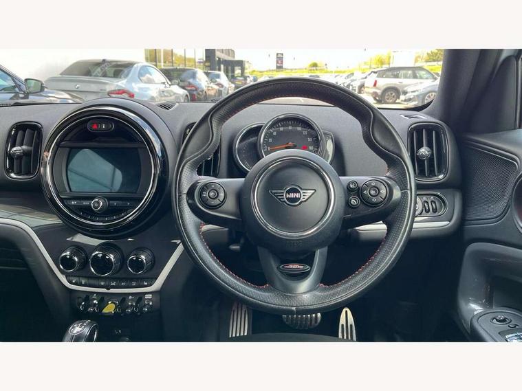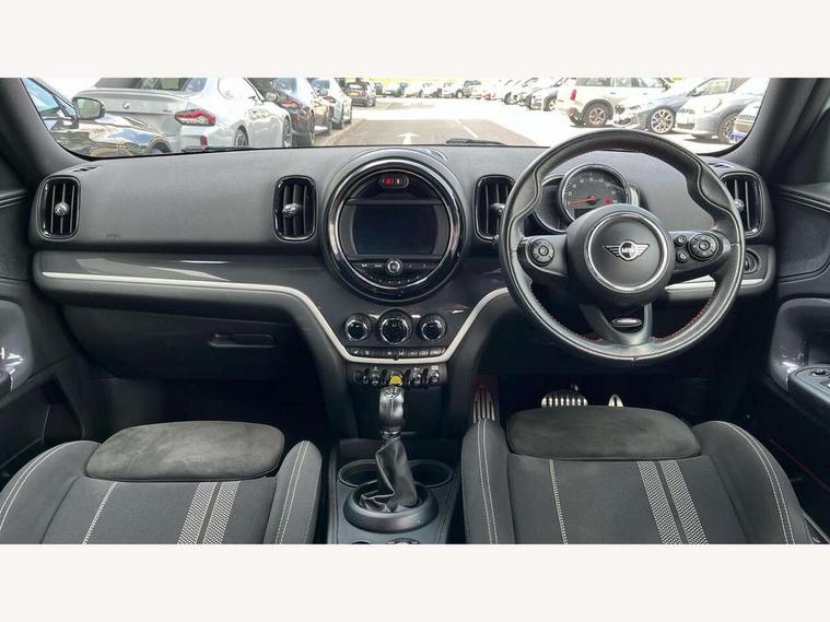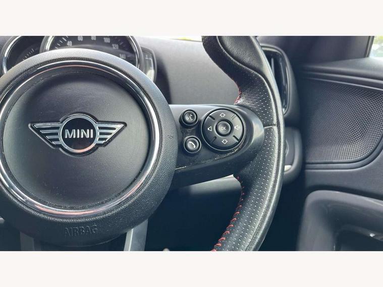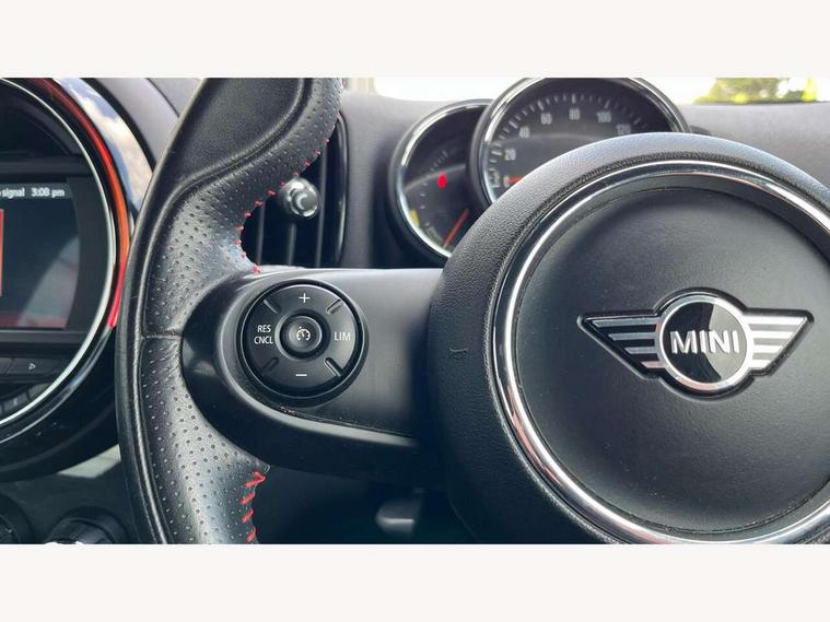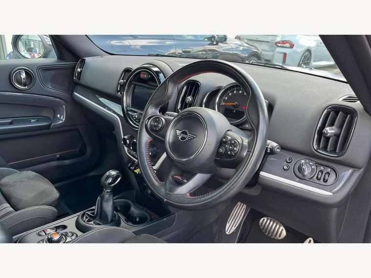 Active Guard incl speed limiting and lane departure functions with auto steering, and front collision warning with brake intervention, Automatic start/stop function with brake energy recuperation, eDrive button, Electro-mechanical speed dependant steering assistance, Instrument cluster, Mini E-call, MINI TeleServices, On board computer, Rear parking distance control, Automatic transmission, Charging flap on front left lower A-panel, Double Vanos system, Fully variable valve control, High precision injection, Performance Control, FM tuner and DAB digital radio, Bonnet scoop, Chrome border honeycomb structure radiator grille with S badge, Chrome fuel filler cap, Day time driving lights, Dynamic brake lights, Electric windows, Heated rear window, Heated windscreen washer jets, John Cooper Works - aerodynamic kit (front and rear apron, spoiler), front and rear sport bumpers and part-painted side sills with door sill finishers, John Cooper Works Logo, John Cooper Works rear spoiler, Metal door sill strips with Cooper S imprint, Model logo, Model logo on Tailgate, Rain sensor with auto headlights, Rear fog lights, Rear window wiper, Side scuttle panel with integrated indicator, Split rear doors, Sun/heat protection glass, Twin exhaust tailpipe, White indicator lenses, 12V Accessory socket in centre console, 360L luggage compartment capacity, 4 lashing eyes in luggage compartment, 40:20:40 split folding rear seats, Anthracite headlining with grab handles and clothes hooks, Charging cable, Chrome interior highlights, Colour line - Carbon black, Cupholders, English handbook, Front headrests, Glove compartment, Height and length steering column adjustment, Isofix rear child seat preparation, John Cooper Works perforated leather steering wheel with contrast stitching in chilli red and John Cooper Works logo, Leather gearshift lever and handbrake gaiters, LED reading lights, vanity mirror lights, front foot well light and spotlight on front seats, Manual air conditioning, Mechanical seat adjustment, driver seat height adjust, forward/back and front seats backrest, Multifunction steering wheel, Passenger seat height adjuster, Rear headrests, Storage compartments in doors, Sunvisors with vanity mirrors, Excitement pack - Countryman, Navigation pack - Countryman, 2 tone horn, 3 point seatbelts on all seats, 6 Airbags - front, side, head and seat belt tensioners, Anti-lock braking system (ABS), DSC - Dynamic Stability Control, Electronic handbrake, Front and rear disc brakes, Hill start assist, Tyre pressure monitoring system, Alarm system with tilt sensor, monitoring doors, bonnet interior and tailgate, Auto drive away locking, Deadlocking function, Electronic vehicle immobiliser, Locking wheel bolts, Start/stop toggle with keyless go, Tool kit,
