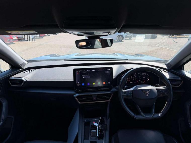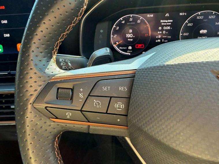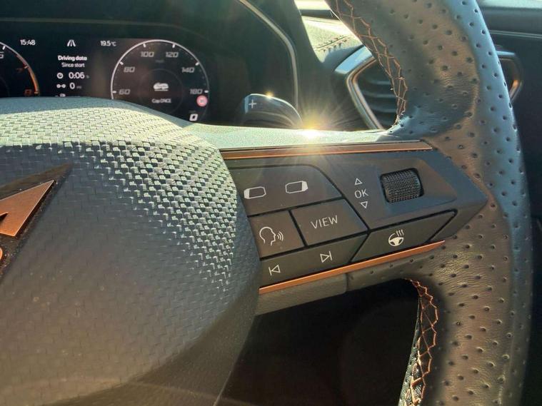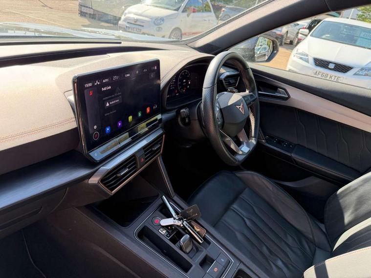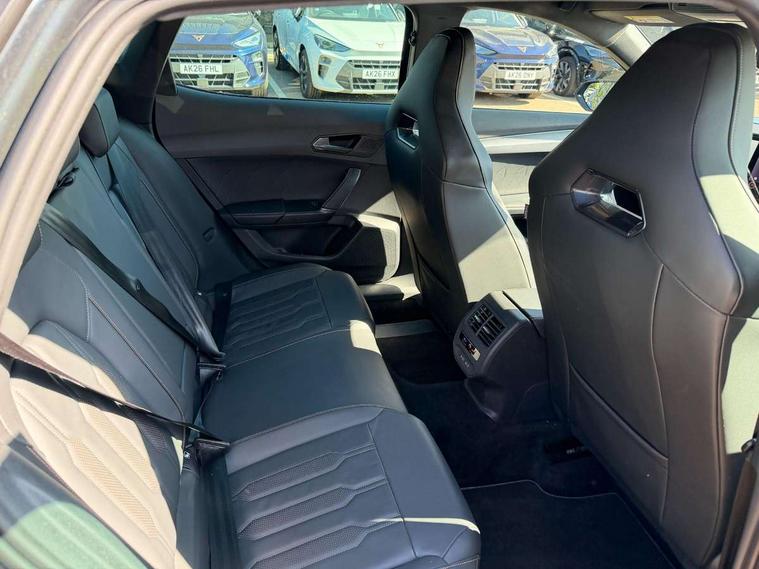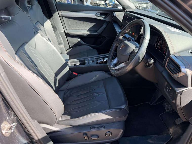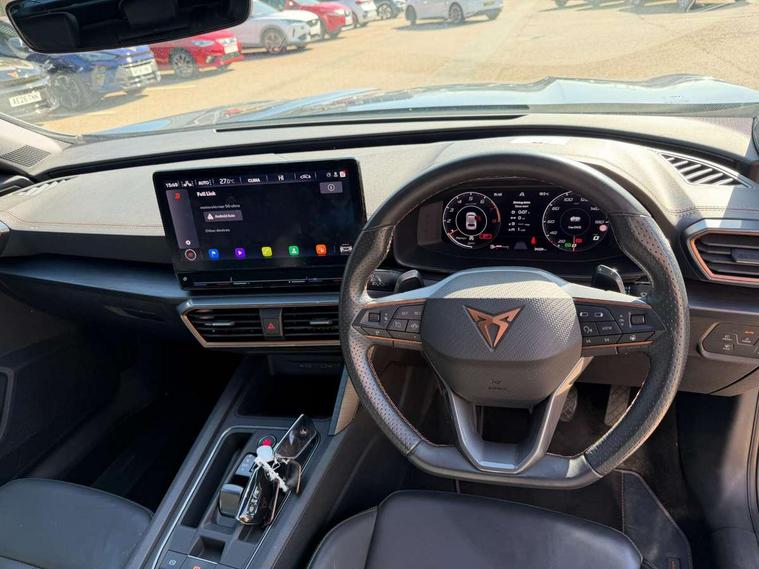 Digital cockpit and configurable dashboard, Driver alert system, Driving profile selection, Forward collision warning with automatic braking, Lane assist, Navigation system with 12'' Touchscreen Display, Park assist (inc front/rear parking sensors), PAS, Predictive adaptive cruise control with speed limiter, Rear view camera, RPM, trip computer, outside temp gauge, instrument light brightness, low fuel warning light, lights on reminder, gearshift indicator, Service interval indicator, Start/stop system with regenerative braking, Voice control system, Wireless apple carplay, Wireless phone charger, Electronic locking differential and dynamic traction support, Standard suspension, 2 front and 2 rear USB type C sockets, Auxiliary input socket, DAB radio, Auto dimming rear view mirror, Body colour door handles, Body coloured bumpers, Dark grey wing mirror, Daytime running light with automatic headlight control and coming home feature, Dynamic headlight range control, Electric front/rear windows, Electrically adjustable heated and folding door mirrors with memory function, Front fog lamps with cornering function, Gloss black roof rails and window surrounds, LED Headlights, LED Taillights with dynamic indicator, Rain sensing wipers, Rear diffuser with black simulated exhaust pipes, Rear side wing doors, Rear wash/wipe, Third brake light, Tinted rear windows, Welcome lights, 12v power supply in centre console, 12V socket, 12v socket in loadspace, 2 front and 2 rear reading lights, 230V socket, 3 seat bench in 2nd row, 60/40 split rear bench seat with armrest and mechanical seat release, Black headlining, Dust/pollen filter, Front and rear head restraints, Front centre armrest, Height/reach adjust steering wheel, Illuminated interior front door sills, Illuminated sunvisor with mirror, Isofix, Leather multi function heated steering wheel with gear shift paddles, Luggage tie-down hooks, Single front passenger seat, Three zone climate control with control panel in rear, Variable luggage/load compartment floor, Wraparound lighting, Genuine Nappa leather Pack - Cupra, 3 point seatbelts on all rear seats, ABS, Brake control system - ESC and brake booster, Child proof door locks, Driver and front passenger airbags with front passenger airbag de-activation, Electronic parking brake, Front and rear disc brakes, Front side curtain airbags, Hill hold control, Public e-call, Seat belt reminder for front and rear seats, Tyre pressure monitoring system, Anti theft alarm system, Keyless entry and start system (KESSY), Locking wheel bolts, Copper and aluminium interior detailing, 19" 'Exclusive' machined sport matte black and silver alloy wheels,
