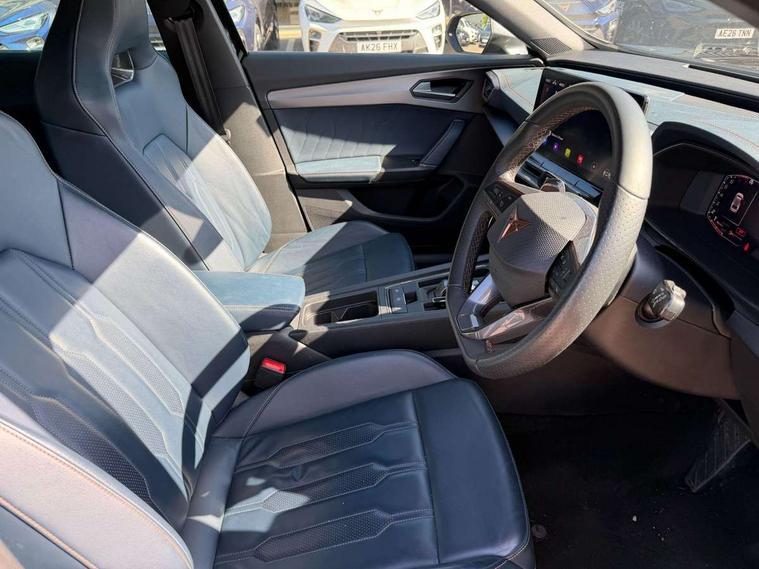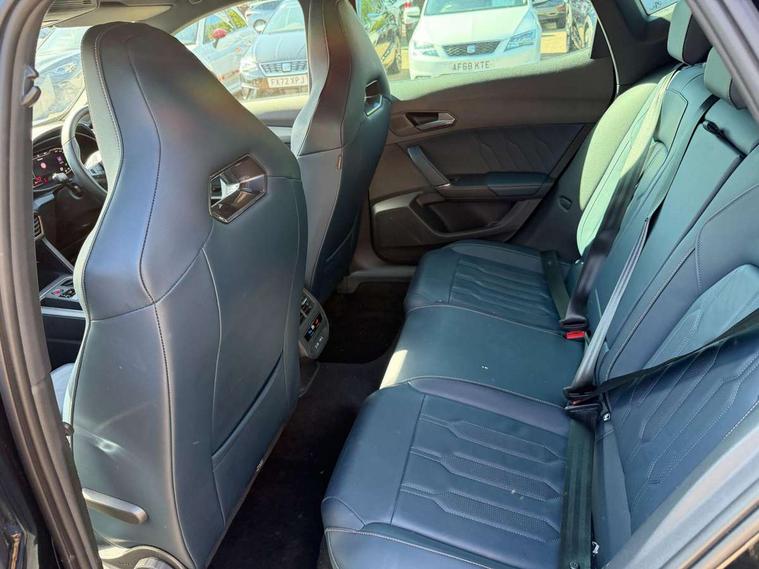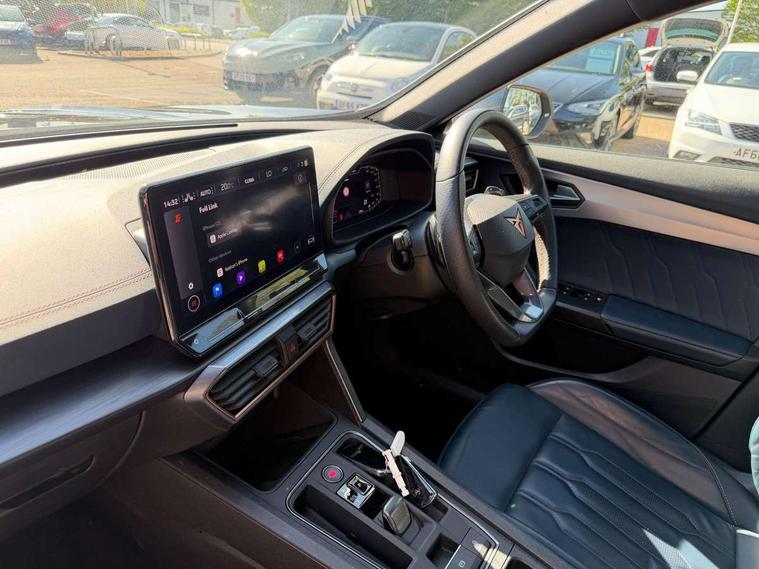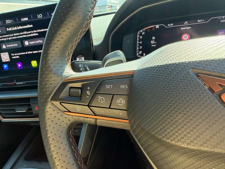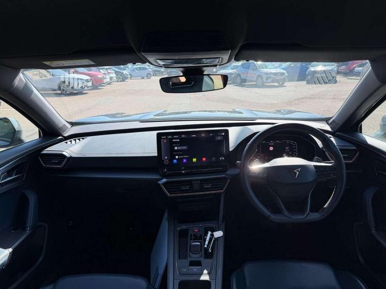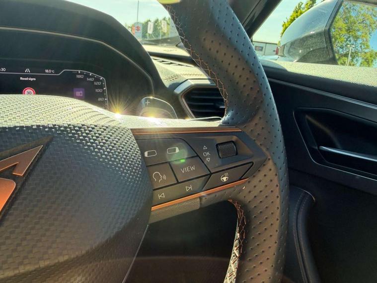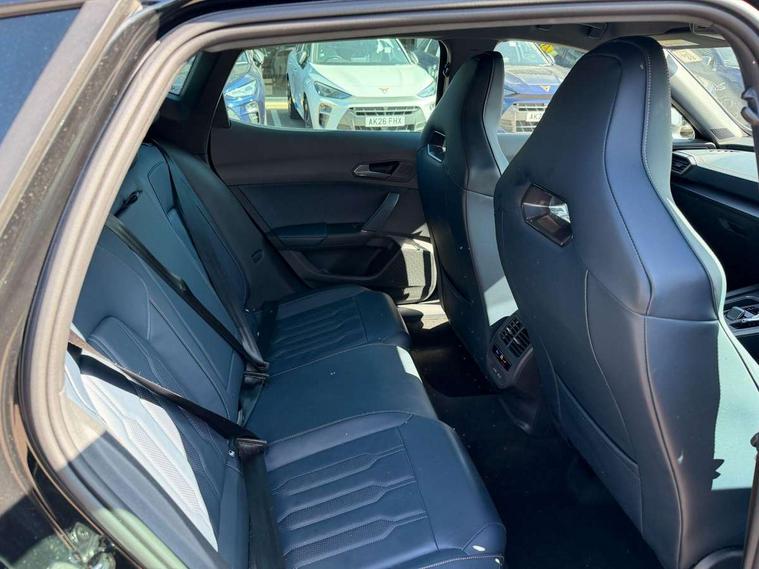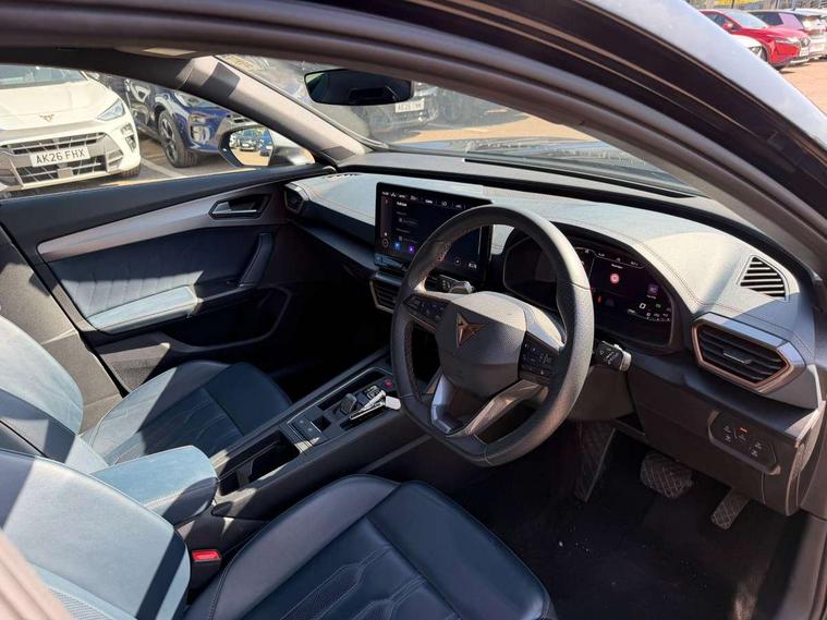 Digital cockpit and configurable dashboard, Driver alert system, Driving profile selection, Forward collision warning with automatic braking, Lane assist, Navigation system with 12'' Touchscreen Display, Park assist (inc front/rear parking sensors), PAS, Predictive adaptive cruise control with speed limiter, Rear view camera, RPM, trip computer, outside temp gauge, instrument light brightness, low fuel warning light, lights on reminder, gearshift indicator, Service interval indicator, Start/stop system with regenerative braking, Voice control system, Wired Android Auto, Wireless apple carplay, Wireless phone charger, Electronic locking differential and dynamic traction support, Standard suspension, 2 front and 2 rear USB type C sockets, Auxiliary input socket, DAB radio, Auto dimming rear view mirror, Body colour door handles, Body coloured bumpers, Dark grey wing mirror, Daytime running light with automatic headlight control and coming home feature, Dynamic headlight range control, Electric front/rear windows, Electrically adjustable heated and folding door mirrors with memory function, Front fog lamps with cornering function, Gloss black roof rails and window surrounds, LED Headlights, LED Taillights with dynamic indicator, Rain sensing wipers, Rear diffuser with black simulated exhaust pipes, Rear side wing doors, Rear wash/wipe, Third brake light, Tinted rear windows, Welcome lights, 12v power supply in centre console, 12V socket, 12v socket in loadspace, 2 front and 2 rear reading lights, 230V socket, 3 seat bench in 2nd row, 60/40 split rear bench seat with armrest and mechanical seat release, Black headlining, Dust/pollen filter, Front and rear head restraints, Front centre armrest, Height/reach adjust steering wheel, Illuminated interior front door sills, Illuminated sunvisor with mirror, Isofix, Leather multi function heated steering wheel with gear shift paddles, Luggage tie-down hooks, Single front passenger seat, Three zone climate control with control panel in rear, Variable luggage/load compartment floor, Wraparound lighting, Genuine Nappa leather Pack - Cupra, 3 point seatbelts on all rear seats, ABS, Brake control system - ESC and brake booster, Child proof door locks, Driver and front passenger airbags with front passenger airbag de-activation, Electronic parking brake, Front and rear disc brakes, Front side curtain airbags, Hill hold control, Public e-call, Seat belt reminder for front and rear seats, Tyre pressure monitoring system, Anti theft alarm system, Keyless entry and start system (KESSY), Locking wheel bolts, Copper and aluminium interior detailing, 19" 'Exclusive' machined sport matte black and silver alloy wheels,
