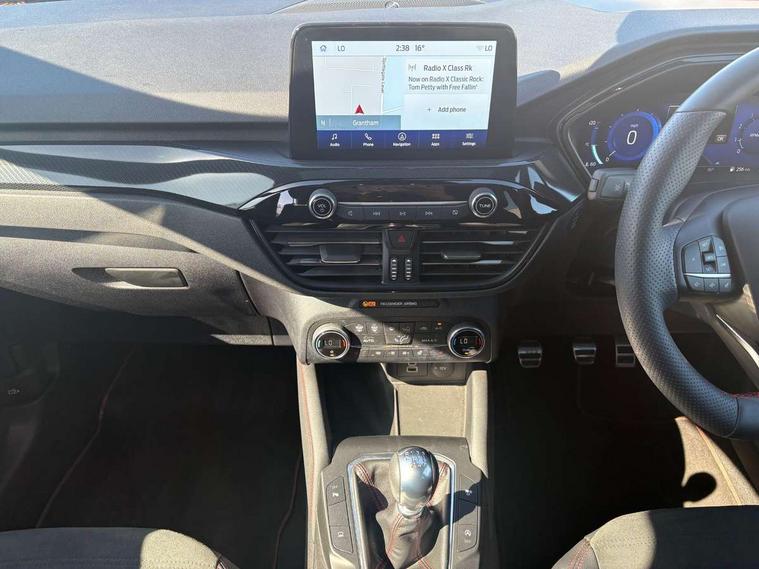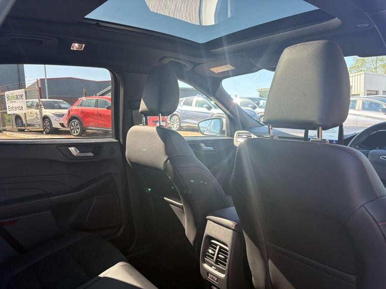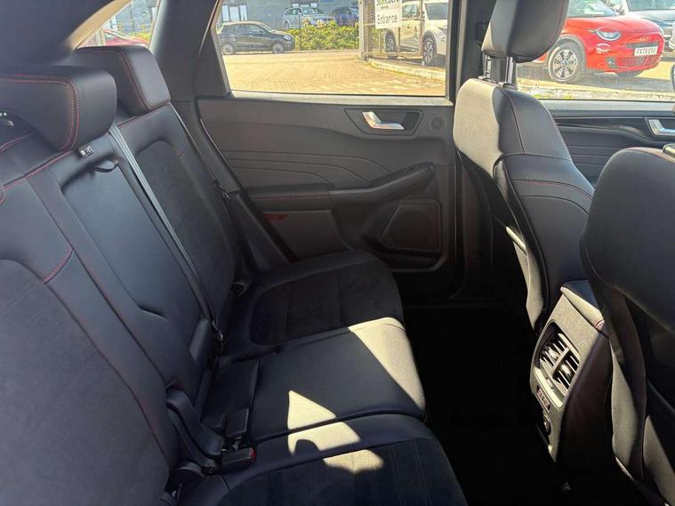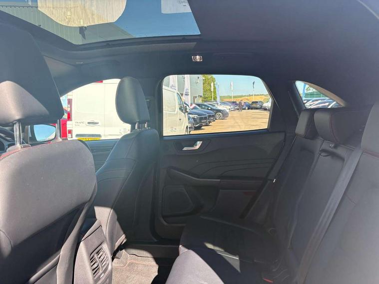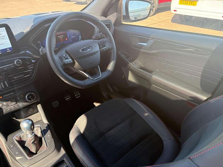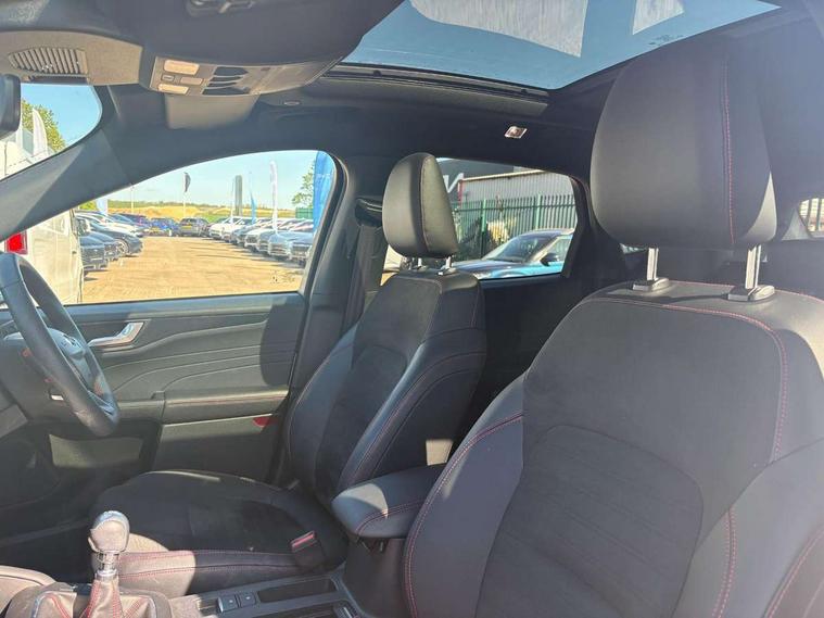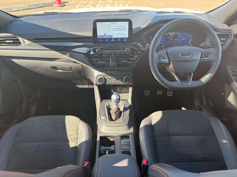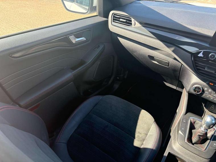 12.3" digital colour instrument cluster, Ford easy fuel, Ford SYNC 3 with 8" TFT LCD touchscreen, App Link, andriod auto/apple carPlay, emergency assistance and navigation with Ford pass connect, Front and rear parking sensors, Hands free power tailgate, Lane keeping aid with lane departure warning, Power assist steering, Rear view camera, Selectable drive modes, Service interval indicator, Sports suspension, Twist beam rear suspension, B&O premium audio system with 10 speakers and subwoofer, 2 USB ports, DAB radio/CD, Auto headlamps with high and low beam, Black roof rails, Day/night rear view mirror, Front LED fog lamps, Large rear spoiler, LED daytime running lights, LED rear lights, Power folding heated door mirrors with puddle lights, Power front/rear windows with global close, Power opening panoramic roof, Privacy glass, Quickclear heated windscreen, Rear side wing doors, Rear wiper, ST Line body styling kit with unique front and rear fascia and bumper, rear painted diffuser, front painted skid plates, dark mesh upper grille, ST Line front scuff plates, Third brake light, Twin exhausts, 10 way power adjustable drivers seat, 2nd row sliding seats with 60:40 split, 8 way manual passenger seat including lumbar support and height adjust, Alloy pedals, Centre console with electronic parking brake, Dark headlining and pillars, Electronic automatic temperature control (EATC), Flat bottomed leather steering wheel in sensico with red stitching, Front and rear head restraints, Heated passenger and driver seats, Heated rear seats, Heated steering wheel, Partial premium touch sensico leather upholstery with black cloth inserts and red stitching, Rear charging point, Single front passenger seat, Sports seats, ST Line front and rear floor mats, ST Line gear knob, 3x3 point rear seatbelts, Airbags - front driver/passenger, front and rear curtain, Drivers knee airbag, Electronic stability control (ESC) and ABS, Ford MyKey Gen 2 safety system, Manual child proof rear door locks, Post collision braking, Pre collision assist with autonomous emergency braking, Rear seat Occupancy alert, Red brake calipers, Tyre pressure monitoring system, Engine immobiliser, Keyless entry and Ford power start button (Keyless start), Locking wheel nuts, Remote powered central double locking doors, Thatcham category 1 alarm,
