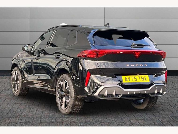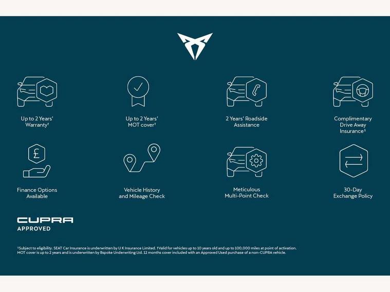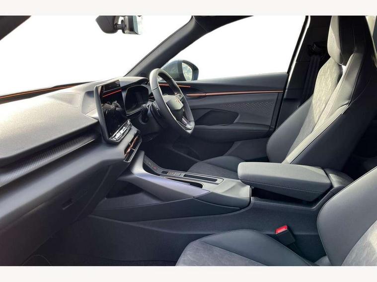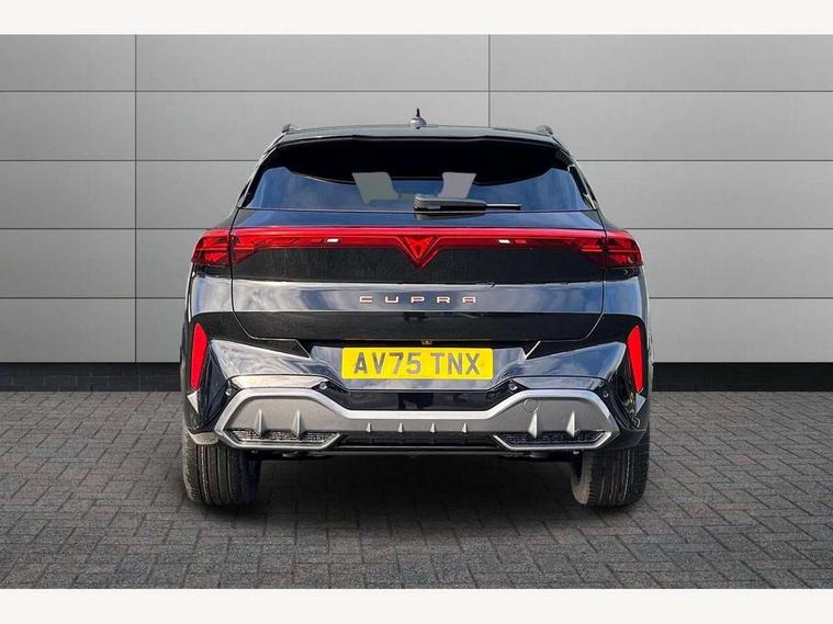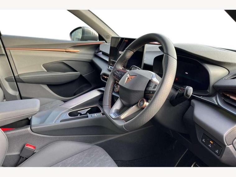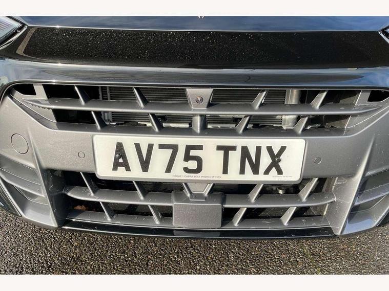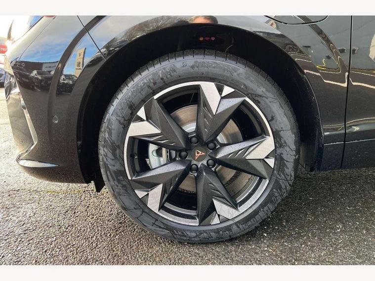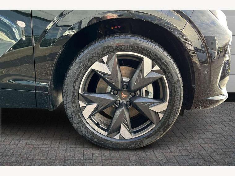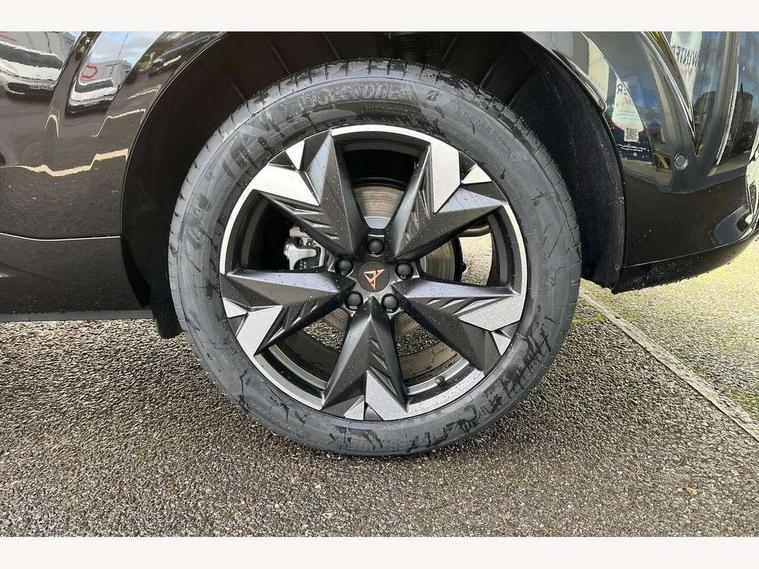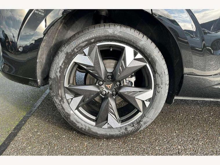 10.25" digital cockpit and configurable dashboard, Adaptive cruise control with follow-to-stop and speed limiter, Advanced driver alert system, Advanced lane assist with semi-automatic vehicle control in a medical emergency and traffic jam assist, Driving profile selection and conventional shock absorber, Dynamic road sign display, E-call, Electric tailgate with virtual pedal, Emergency steering support with turn assist, Front and rear parking sensors, Front assist (Forward collision warning with automatic braking) with multifunction camera and front cross traffic assist, Head up Display, Intelligent park assist, Media system with Nav - 12.9" touch display, voice control, full link phone (wired/wireless), DAB and Steering wheel mounted controls, Rear traffic assist, Side and exit assist, Speed sensitive power steering, Start/stop system with regenerative braking, Top view camera (front camera, rear camera, 2 side cameras), Wireless phone charger, 10 amp mode 2 charging cable, 16 amp mode 3 charging cable, CUPRA sport suspension, Auto dimming rear view mirror, Black roof rails, CUPRA 3D rear lights with ceremony & swiping indicator and illuminated logo, Dark tinted rear windows, Daytime running lights with automatic headlight control and Coming and Leaving home function, Door mirrors with memory function and lowing function on passenger mirror, Dynamic headlight range control, Electric front/rear windows, Electrically adjustable, heated and folding door mirrors, Front fog lamps with cornering function, Heat reflecting windscreen, High beam assist, LED headlamps with signature "CUPRA LED", Rain sensing wipers, Rear fog light on one side, back up light on both sides, Rear side wing doors, Rear wash/wipe, Third brake light, Welcome lights (within exterior mirror housing), 3 seat bench in 2nd row, Black roof lining, Cupra sports pedals, Dinamica cloth upholstery, Driver seat memory function, Electrically adjustable front seats including lumbar support, Four x USB Type C ports (2 in front and 2 in rear), Front and rear head restraints, Front and rear reading lights X 4, Front centre armrest, Heated front seats, Heated leather wrapped multi function sports steering wheel with tiptronic, Illuminated interior front door sills, Isofix, Operating voltage 12V, Single front passenger seat, Smart wraparound interior lighting, Sunvisors with illuminated mirror, Three zone climate control with control panel in rear, Unsplit rear seat bench, split folding backrest, with centre armrest, Variable luggage/load compartment floor, 3 point seatbelts in front with pretensioner and electric height adjustment, 3 point seatbelts on all rear seats, Brake control system - ESC and brake booster, Child proof door locks, Driver and front passenger airbags, Electronic parking brake, Front and rear disc brakes, Front interaction airbag, Front passenger airbag deactivation switch, Front side airbags with curtain airbags, Pre-crash front and rear seat belt tensioner, window closure and hazard lights, Tyre pressure monitoring system, Visual and acoustic seat belt reminder, electric contact in front and rear, Anti theft alarm, Keyless locking and starting system keyless advanced with safelock, Locking wheel bolts, Black decorative trims, Chrome interior detailing, 19" Spectrum exclusive machine alloy wheels, Breakdown kit, Tool kit,
