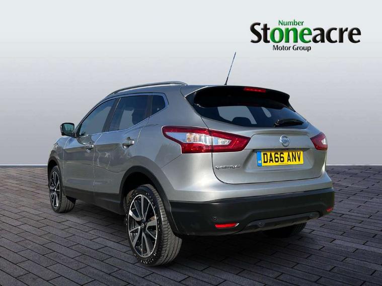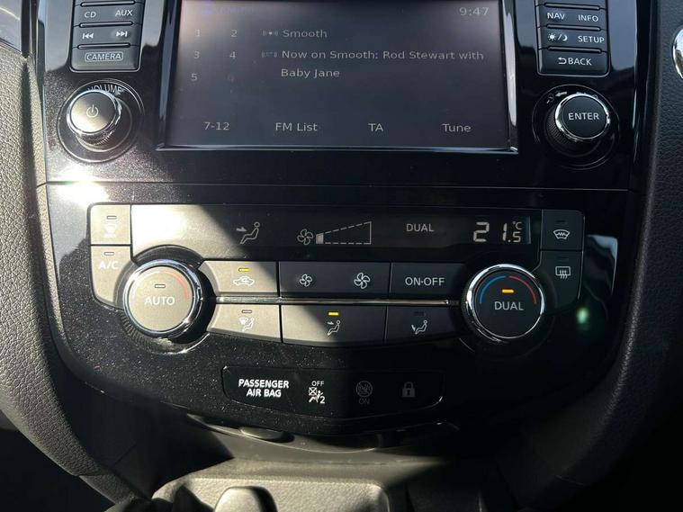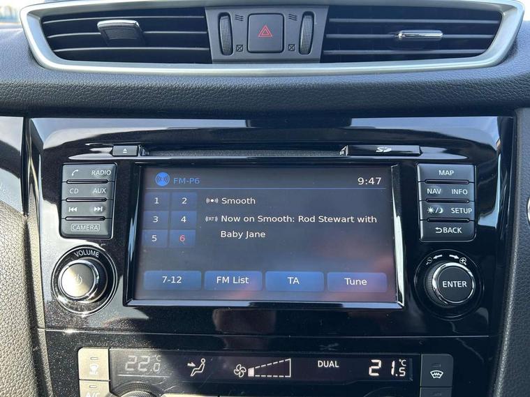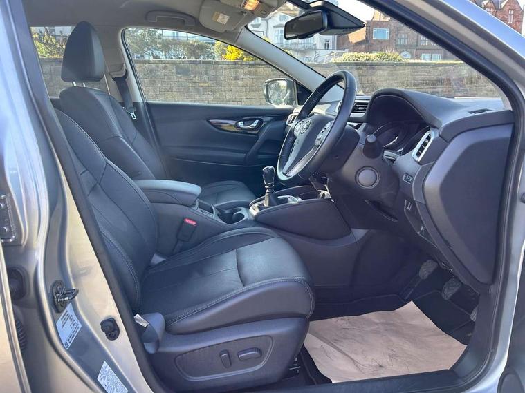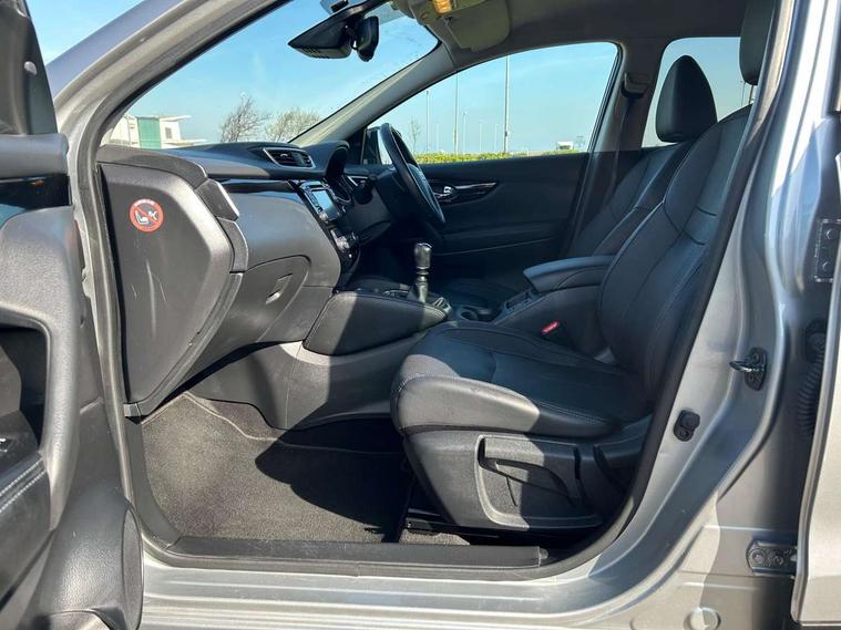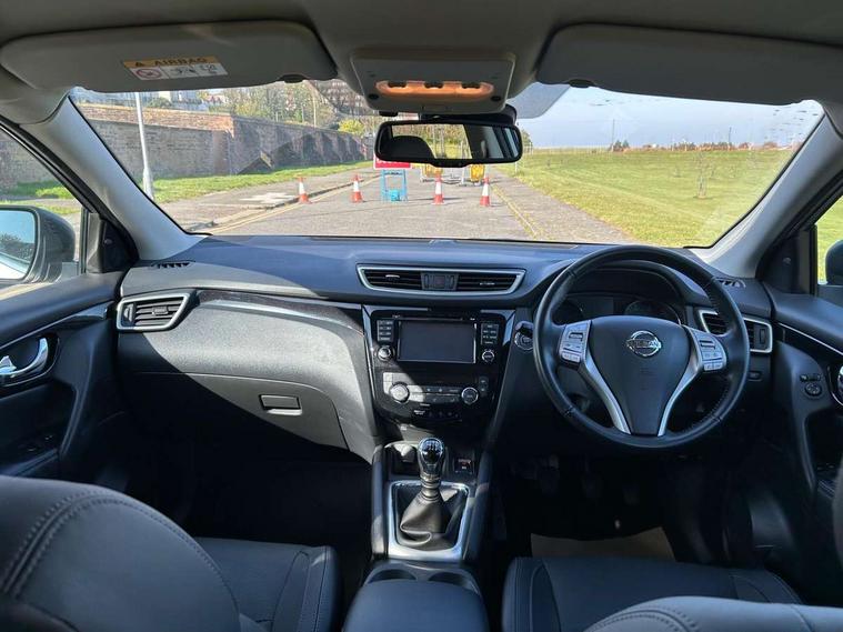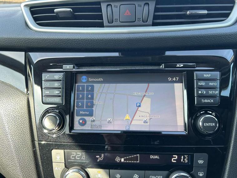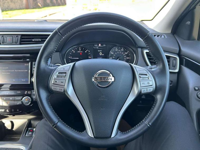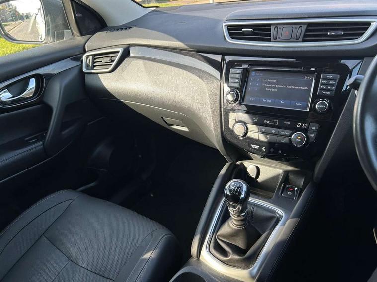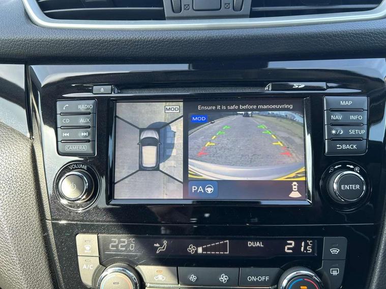 5" TFT driver information centre, Around View Monitor, Blind spot monitoring, Bluetooth phone integration system, Cruise control, Fatigue detection system, Front and rear parking sensors, Intelligent parking assist, Lane departure warning system, Moving object detection, Nissan connect sat nav system, PAS, Push button starter, Service interval indicator, Speed limiter, Traffic sign recognition, Trip computer, Diesel particulate filter, 6 speakers, DAB radio/CD player, Steering wheel mounted audio controls, USB/aux input socket, 2 speed wipers+variable intermittent wipe, Automatic headlamp activation, Bi LED headlights with auto levelling, Black honeycomb front grille, Body colour bumpers, Body colour door mirrors and handles, Chrome window surround, Electric folding and heated door mirrors, Electric front/rear windows, Front fog lights with chrome surrounds, Heated windscreen, High beam assist, Interior mirror with auto anti dazzle, LED daytime running lights, Privacy glass, Rain sensor windscreen wipers, Rear privacy glass, Rear wiper, Satin silver roof rails, 12V socket, 60/40 split folding rear seat, Ambient interior lighting, Driver/passenger front seatback pockets, Dual zone climate control, Electric front seats for height/ manual lumbar adj, Footwell ambient lighting, Front armrest, Front cupholders x 2, Front headrests, Front seat belt pre-tensioners with load limiters, Heated front seats, Illuminated glovebox, Isofix child seat preparation, Leather gearknob, Leather steering wheel, Luggage area divider, Map reading lamp, Pollen filter, Rake/reach adjustable steering wheel, Rear armrest with 2 cupholders, Rear headrests, ABS, brake assist and EBD, Child locks on rear doors, Curtain airbags, Driver/front passenger airbag, Electronic parking brake, ESP + traction control, Forward emergency braking, Height adjustable front seatbelts, Hill start assist, Side airbags, Three 3 point rear seatbelts, Tyre pressure monitoring system, Alarm, Immobiliser, Intelligent Key, Remote central locking, Tyre puncture repair kit,