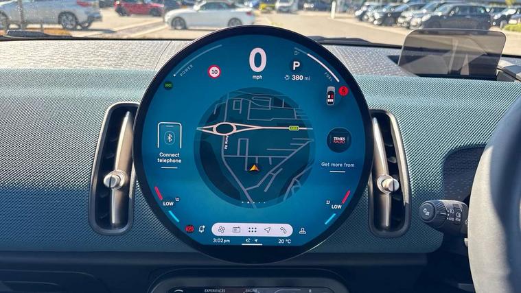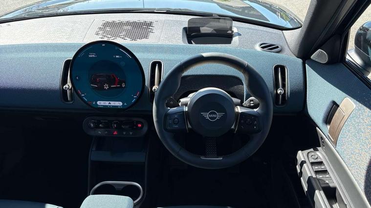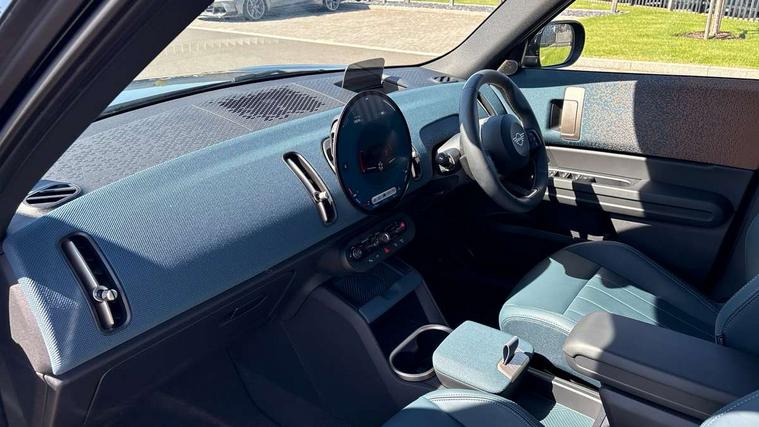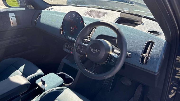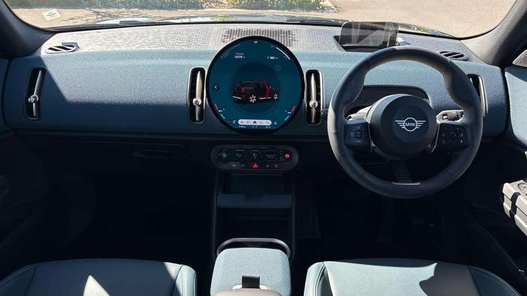 Bluetooth connection, Circular OLED Screen, Compatible mobile phone bluetooth with audio streaming, Cruise Control (DCC), Digital dashboard display, E-call, Electro-mechanical speed dependant steering assistance, MINI Experience Modes, Mini navigation system, MINI TeleServices, Parking assistant in camera and ultrasound based assistance system, rear view camera, parking aid and distance control, Auto transmission with Paddles, 6 speakers, DAB Digital radio, Personal eSim, Auto tailgate, Electric adjustable heated door mirrors, Front and rear electric windows, Heated rear window, LED daytime running lights, LED Headlights, LED rear lights, LED third brake light, Logos in Vibrant Silver, Rain sensor with auto headlights, Rear side wing doors, Rear window wiper, Roof rails, Vibrant silver grille surround, 3 seat bench in 2nd row, 60/40 split rear bench seat, Anthracite headliner, Auto air conditioning, Floor mats, Front armrest, Front headrests, Front sport seats, Heated steering wheel, Height and length steering column adjustment, Lidded storage box in Petrol knit, Rear headrests, Single front passenger seat, Sport Vescin Steering Wheel, Sunvisors with vanity mirrors, Vescin synthetic leather upholstery, Vibrant Silver sill inlay, 3x3 point rear seat belts, 6 Airbags - front, side, head and seat belt tensioners, ABS, DSC - Dynamic Stability Control, Electronic handbrake, Electronic Stability Programme (ESP), Front ISOFIX (iSize), Hill hold assist, Hill start assist, Manual rear child locks, Traction control, Tyre pressure monitoring system, Warning triangle, Alarm system with tilt sensor, monitoring doors, bonnet interior and tailgate, Auto drive away locking, Deadlocking function, Electronic vehicle immobiliser, Locking wheel bolts, Remote control locking, Start/stop toggle with keyless go, Petrol/Brown dashboard knit, MINI Mobility Kit,