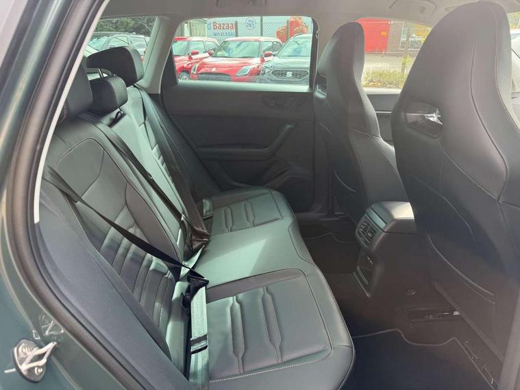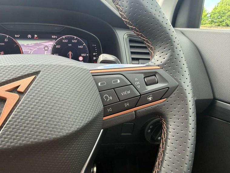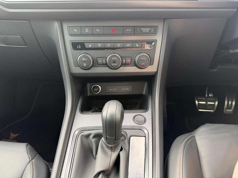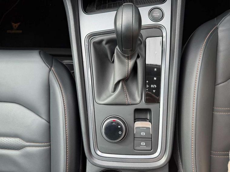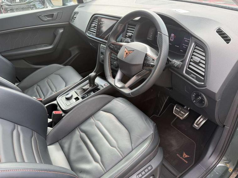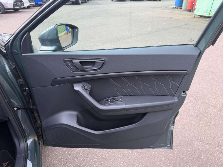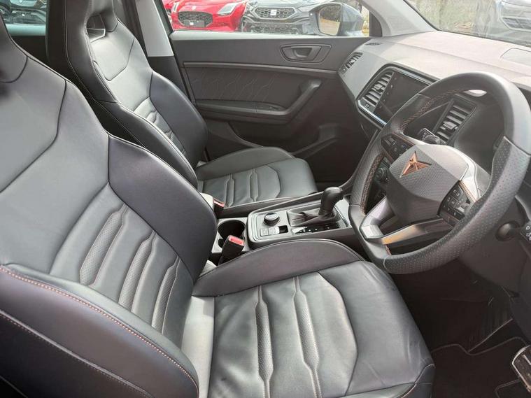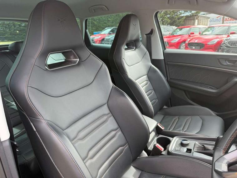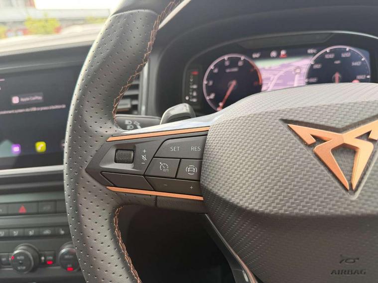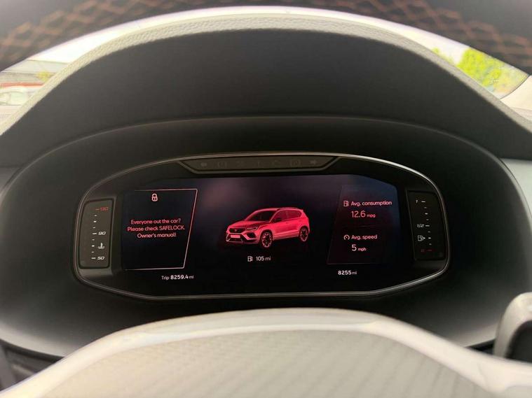 Cruise control system with speed limiter, Digital cockpit, Driving profile selection and conventional shock absorber, E-call, Electric tailgate with virtual pedal, Outside temperature gauge, Progressive power assisted steering, Rear view camera, Self parking functionality (includes front and rear parking sensors), Trip computer, wired and wireless full link smartphone integration, Wireless phone charger, Front and rear shock absorption, chassis with increased ride height, Steering wheel mounted audio/phone controls, Body colour bumpers with dark aluminium diffusor, Body coloured wheel arch surrounds, Dark tinted rear windows, Daytime running lights, Door mirrors with welcome CUPRA light silhouette, Dynamic headlight range control with self adjusting whilst driving, Electric adjustable/heated/folding door mirrors, Front and rear electric windows, Front grille frame in chrome, Full LED headlamps with lens and LED front fog lamps with cornering function, Gloss black door mirrors, Gloss black roof rails, Gloss black side mouldings, Gloss black side window trim, Illuminated aluminium front door sill, LED rear tail lights with dynamic indicators, Rear fog lights, Rear side wing doors, Rear spoiler, Rear wash/wipe, Specific CUPRA design front bumper, Standard rear exhaust tailpipes, Third brake light, 12V socket in front, 3 seat bench in 2nd row, 60/40 split folding rear seat, Aluminium pedals, Cupra steering wheel emblem, Dual zone climate control, Electric driver seat with memory function, Front and rear head restraints, Front centre armrest, Front seat back storage pockets, Grey roof lining, Heated front seats, Heated steering wheel, Height adjustable driver and passenger seat with lumbar adjustment, ISOFIX points in outer rear seats with top tether anchorage points, Leather sport bucket seats, Leather steering wheel and gear knob, Multicoloured ambient lighting with LED interior illumination, Pedal cluster, Rear armrest and easy back seat release mechanism from boot, Single front passenger seat, Sports steering wheel, Steering wheel mounted gearshift paddles, Storage compartment in roof console for sunglass, Storage compartment under driver's seat, Convenience pack - Ateca, Interior lighting pack - Ateca, Navigation system plus pack with DAB - Ateca, Safety and driving pack - Ateca, 3x3 point rear seatbelts, ABS, Traction control system (TCS), Electronic stability control (ESC) and Electronic differential lock system (XDS), Airbags - Driver and front passenger airbag with deactivation, front side, two curtain and driver's knee airbags, Black brake callipers with CUPRA logo, Electric parking brake with auto hold function, Front and rear seatbelt reminder, Front assist with autonomous emergency braking, Hill hold control, Manual rear child locks, Single tone horn, Tiredness recognition system, Tyre pressure monitoring system, Alarm, Keyless entry, Locking wheel bolts, 19" Sport machined alloy wheels 36/3 in black/silver,