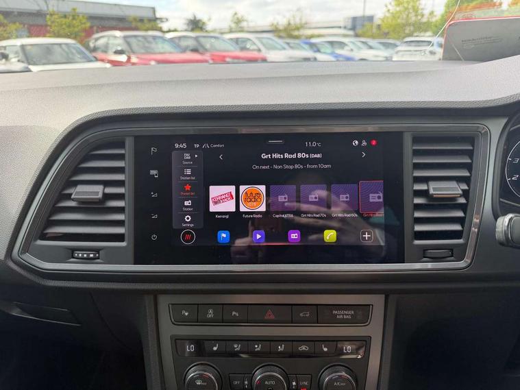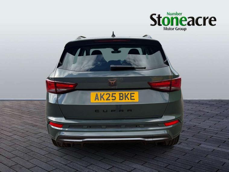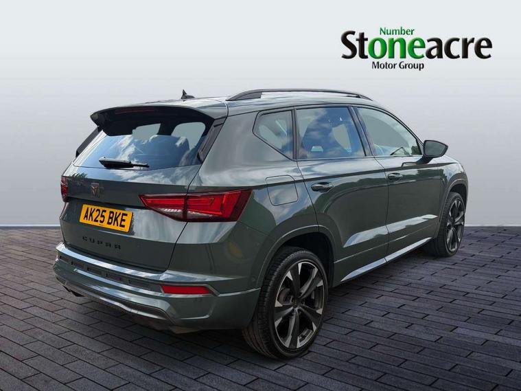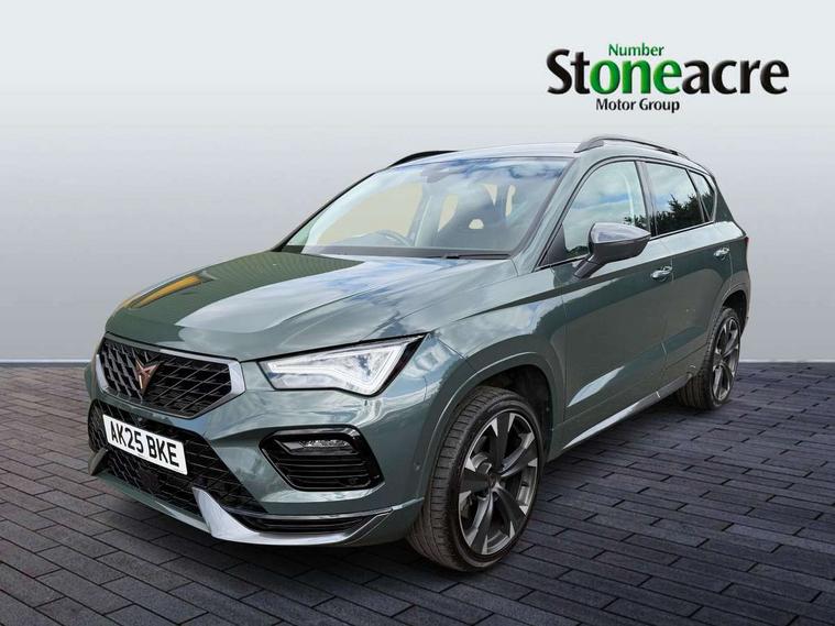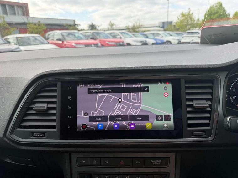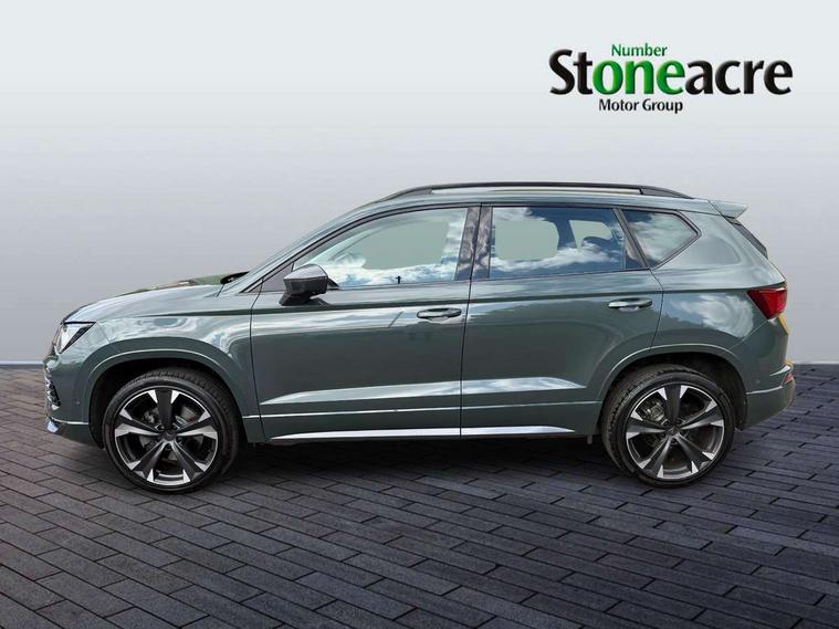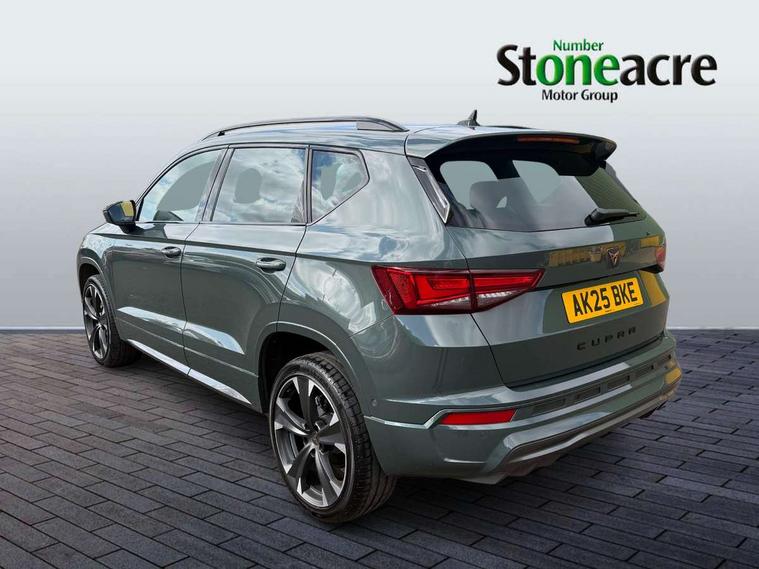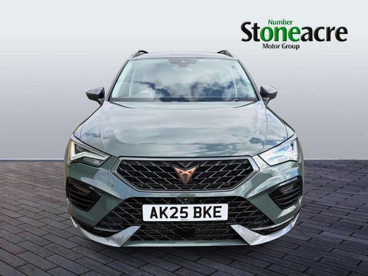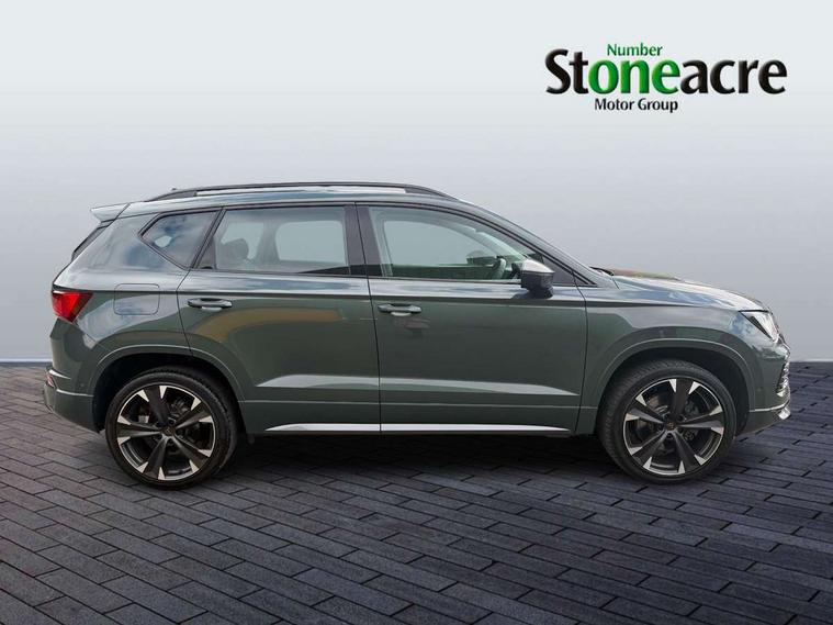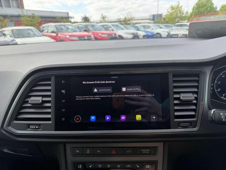 Cruise control system with speed limiter, Digital cockpit, Driving profile selection and conventional shock absorber, E-call, Electric tailgate with virtual pedal, Outside temperature gauge, Progressive power assisted steering, Rear view camera, Self parking functionality (includes front and rear parking sensors), Trip computer, wired and wireless full link smartphone integration, Wireless phone charger, Front and rear shock absorption, chassis with increased ride height, Steering wheel mounted audio/phone controls, Body colour bumpers with dark aluminium diffusor, Body coloured wheel arch surrounds, Dark tinted rear windows, Daytime running lights, Door mirrors with welcome CUPRA light silhouette, Dynamic headlight range control with self adjusting whilst driving, Electric adjustable/heated/folding door mirrors, Front and rear electric windows, Front grille frame in chrome, Full LED headlamps with lens and LED front fog lamps with cornering function, Gloss black door mirrors, Gloss black roof rails, Gloss black side mouldings, Gloss black side window trim, Illuminated aluminium front door sill, LED rear tail lights with dynamic indicators, Rear fog lights, Rear side wing doors, Rear spoiler, Rear wash/wipe, Specific CUPRA design front bumper, Standard rear exhaust tailpipes, Third brake light, 12V socket in front, 3 seat bench in 2nd row, 60/40 split folding rear seat, Aluminium pedals, Cupra steering wheel emblem, Dual zone climate control, Electric driver seat with memory function, Front and rear head restraints, Front centre armrest, Front seat back storage pockets, Grey roof lining, Heated front seats, Heated steering wheel, Height adjustable driver and passenger seat with lumbar adjustment, ISOFIX points in outer rear seats with top tether anchorage points, Leather sport bucket seats, Leather steering wheel and gear knob, Multicoloured ambient lighting with LED interior illumination, Pedal cluster, Rear armrest and easy back seat release mechanism from boot, Single front passenger seat, Sports steering wheel, Steering wheel mounted gearshift paddles, Storage compartment in roof console for sunglass, Storage compartment under driver's seat, Convenience pack - Ateca, Interior lighting pack - Ateca, Navigation system plus pack with DAB - Ateca, Safety and driving pack - Ateca, 3x3 point rear seatbelts, ABS, Traction control system (TCS), Electronic stability control (ESC) and Electronic differential lock system (XDS), Airbags - Driver and front passenger airbag with deactivation, front side, two curtain and driver's knee airbags, Black brake callipers with CUPRA logo, Electric parking brake with auto hold function, Front and rear seatbelt reminder, Front assist with autonomous emergency braking, Hill hold control, Manual rear child locks, Single tone horn, Tiredness recognition system, Tyre pressure monitoring system, Alarm, Keyless entry, Locking wheel bolts, 19" Sport machined alloy wheels 36/3 in black/silver,