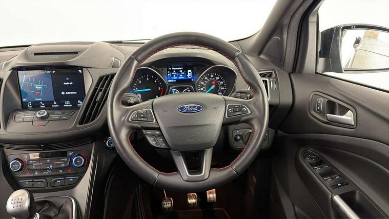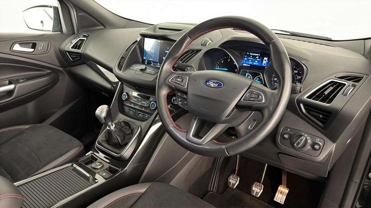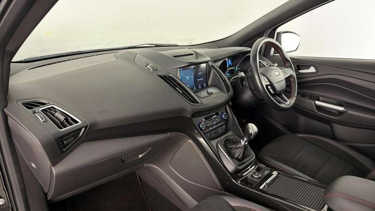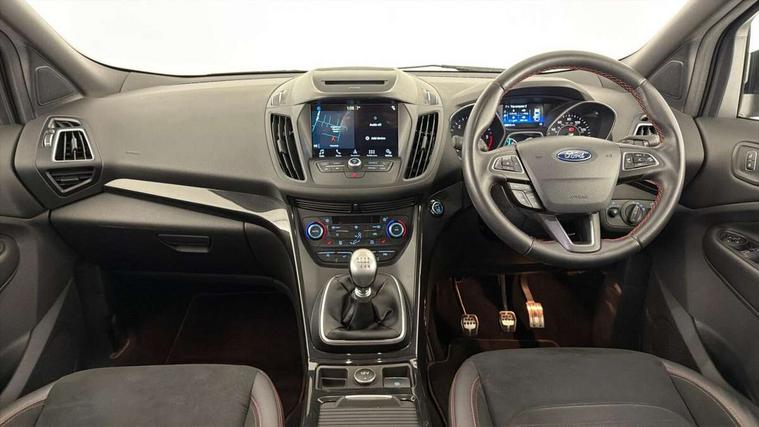 Bluetooth system, Enhanced active park assist including perpendicular parking pull out assist, flank guard and front/rear parking sensor, EPAS, Rear parking sensor, SYNC Emergency Assistance, Trip computer, Sports suspension, Auxiliary socket for external device, Remote audio controls on steering wheel, USB connection, Auto dimming rear view mirror, Automatic headlights, Black roof rails, Body colour bumpers, Body colour front/rear/side skirts, Body coloured wheel arches, Body styling kit, Door claddings, Electric folding mirrors, Electric panoramic glass sunroof, Electrically heated door mirrors, Front scuff plate, Halogen headlights, High gloss black mesh grille, LED daytime running lights, Power front and rear windows, Quickclear heated windscreen, Rain sensor windscreen wipers, Silver rear diffuser trim, Silver skid plates, Tailgate wash/wipe, Twin exhaust pipes, 10 way electric adjustable drivers seat, 6 way manually adjustable passenger seat, 60/40 split/folding rear back and cushion, Alloy Foot Pedals, Auxiliary power socket in luggage area, Centre console with stowage tray/bottle holder/CD stowage/front and rear 12V power point, Dark headlining, Dinamica/Leather Upholstery, Driver seat lumbar adjustment, Driver/passenger front seatback pockets, Dual electronic automatic temperature control, Floor mats with red stitching, Folding rear centre armrest, Footwell courtesy lights front and rear, Front head restraints, Front overhead courtesy lights with theatre style dimming and delay, Front/rear reading lights, Heated front seats, Isofix system on outer rear seats, Leather gearknob, Leather steering wheel with red stitching, Memory for drivers seat/door mirrors, Passenger lumbar support, Reach + rake adjustable steering column, Rear floor mats, Rear head restraints, Sports style front seats, Stowage unit in upper instrument panel, Tie down hooks, Tonneau cover, Variable intensity instrument illumination, 3 point seatbelts on all 3 rear seats, ABS/EBD, Driver and passenger airbags, Driver and passenger side airbags, Electric traction assist system, Electronic parking brake, ESP+EBA, Front and rear curtain airbags, Hill start assist, Intelligent Protection System (IPS), Tyre pressure monitoring system, Immobiliser, Keyless entry system with hands free boot opening, Keyless start, Locking wheel nuts, Remote central locking, Thatcham Cat.1 alarm, 19" 5x2 spoke black alloy wheels, Mini steel spare wheel,