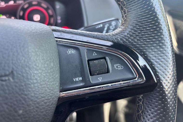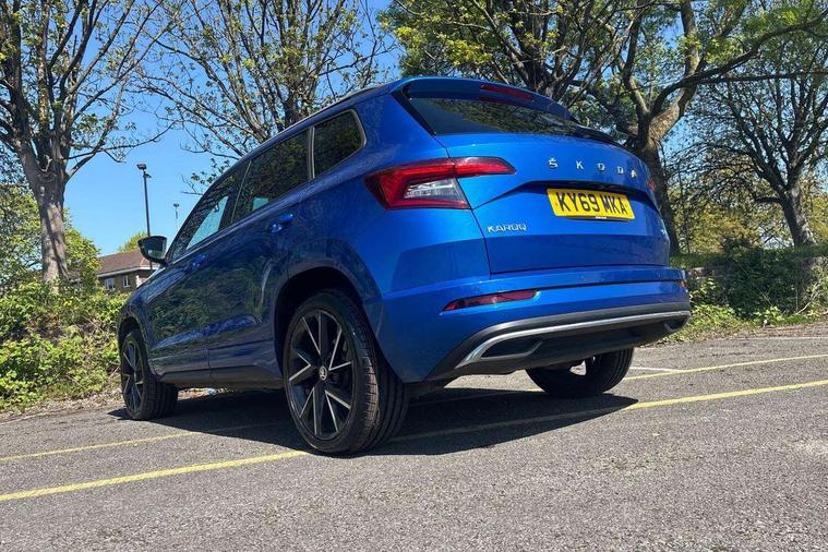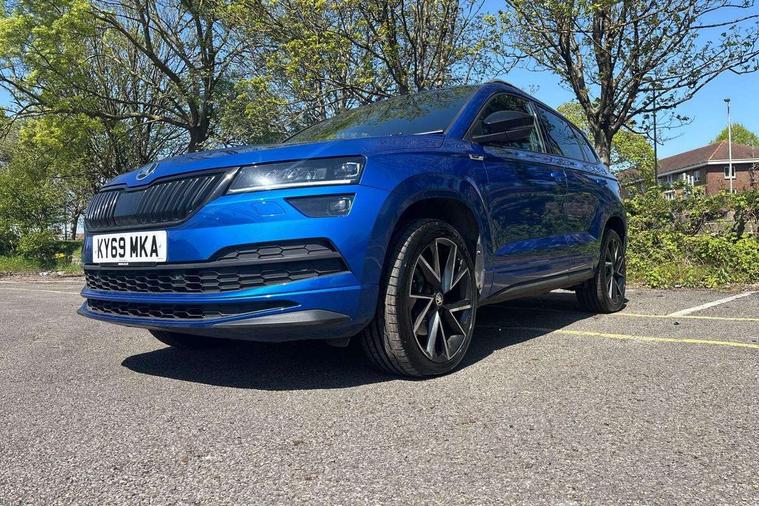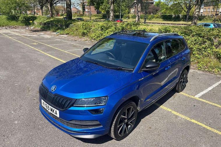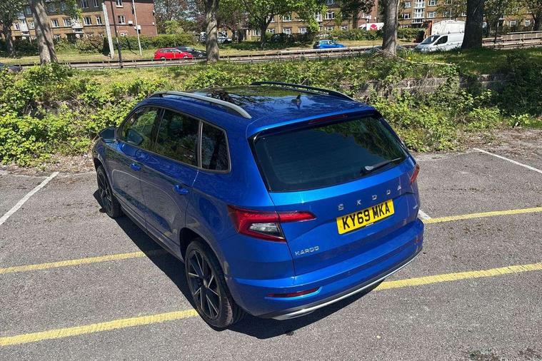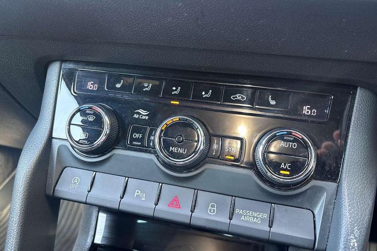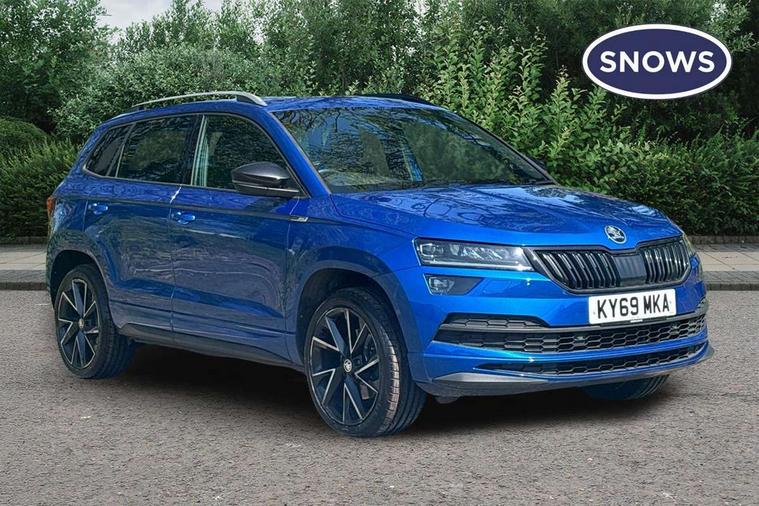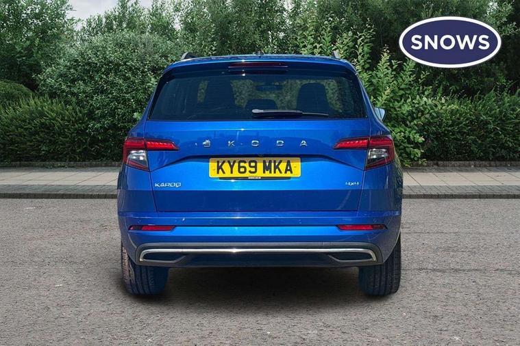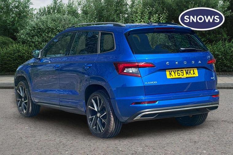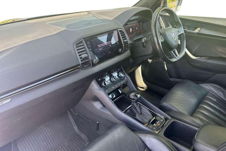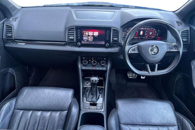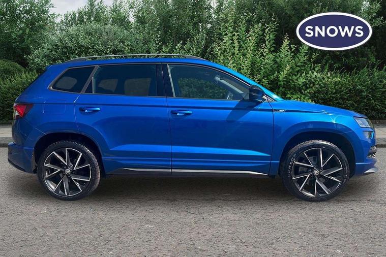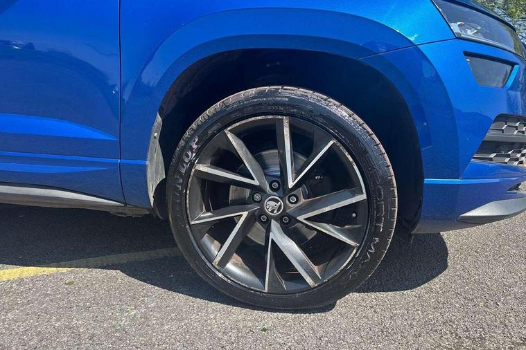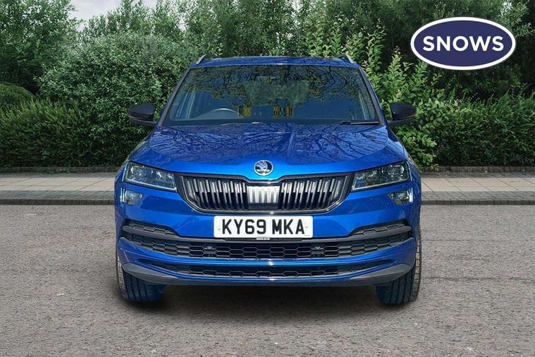 Drive mode selection with off road, Driver alert system, Driver fatigue sensor, Driver profile selection, Multifunction colour trip computer, Outside temperature gauge, Rear view camera, Service interval indicator, Start/stop system with regenerative braking, DAB radio with Bluetooth, SD card slot, USB connection, Acoustic glass, Aero front windscreen wipers with intermittent function, Automatic headlight control system, Black roof rails and door mirrors with radiator grille, Body colour door mirrors and handles, Chrome outside aluminium bar around the window, Electric front and rear windows with child proof lock, Electrically adjustable heated folding and auto dimming door mirrors with boarding spots, Front door steps with SportLine logo, Full LED headlights + adaptive front light system + LED daytime running lights and front cornering fog lights, Headlight washers, Heated rear windscreen, LED rear lights with high functionality, Light assistant (coming/leaving home/tunnel light), Panoramic sliding sunroof, Privacy glass, Protective door side sills in body colour, Rear diffuser, Safety reflectors on front doors, Sportline badge on front fender, Sportline decorative inserts with badging, Sports front and rear bumpers, Third brake light, 1.5 litre bottle holders in driver and front passenger door panels, 12V socket in boot, 12v socket in front centre armrest with storage compartment and rear air vents, 2 Folding hooks and nets in boot, 2 Front readings lights for driver and passenger, 3 rear height adjustable headrests, 4 foldable roof handles with rear coat hooks, 4 lashing points on luggage floor, Aluminium pedals, Backrest release, Black roof headlining, Cargo elements in boot, Chrome inner door handles, Driver and passenger seats height adjust, Dual zone climate control, Front seat and rear pockets, Height adjustable front three point seats belts with tensioners, Height/reach adjust steering wheel, Ice scraper, Illuminated and cooled glovebox, Illuminated luggage compartment, Isofix child seat preparation outer rear, Manual lumbar support for front seats, Net programme in boot, Pen holder, Pollen filter, Rear boot cover, Rear reading lights, Rear seats fixed folding and divided 60:40, Removable LED torch in the boot, Retractable parcel shelf attachable to tailgate, Safety vest holder, Storage box in upper central dashboard closed, Storage compartment below the passenger seat, Storage net on centre console passenger side, Sunvisors with illuminated vanity mirrors, Textile floor mats, Umbrella under passenger seat, Welcome animation with sportline logo, LED Interior lighting pack with Skoda welcome logo - Karoq, Airbags - Front side, head, knee and curtain, Automatic door unlocking in case of crash, Automatic fuel cut off in case of crash, Driver airbag, Electronic parking brake with auto hold function, Emergency rear braking signal, ESC including ABS, MSR, ASR, EDS, HBA, DSR, RBS, MKB and traction control, Front assist radar scanning of the space in front of the car with automatic braking, Hill hold control, Passenger airbag with switch-off function, Pedestrian monitor, Seatbelt reminder signalisation and pretensioner for all seats, Three point seatbelts rear, Two tone horn, Tyre pressure display, Tyre pressure monitor, Alarm with interior monitoring, back up horn and tilt sensor with safe function, Electronic engine immobiliser, Keyless entry and keyless start with safe system, Remote central locking with 2 remote folding keys, Chrome framed air vents, 19" Vega anthracite alloy wheels, Anti-theft wheel bolts protection, Storage on wheel cover,