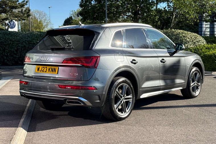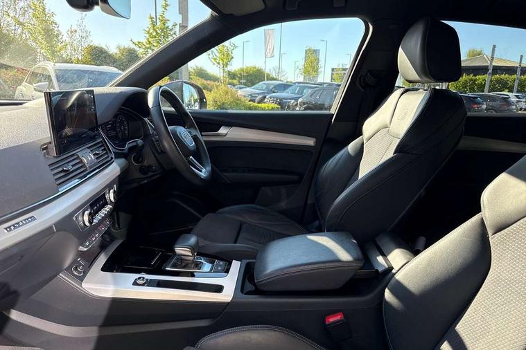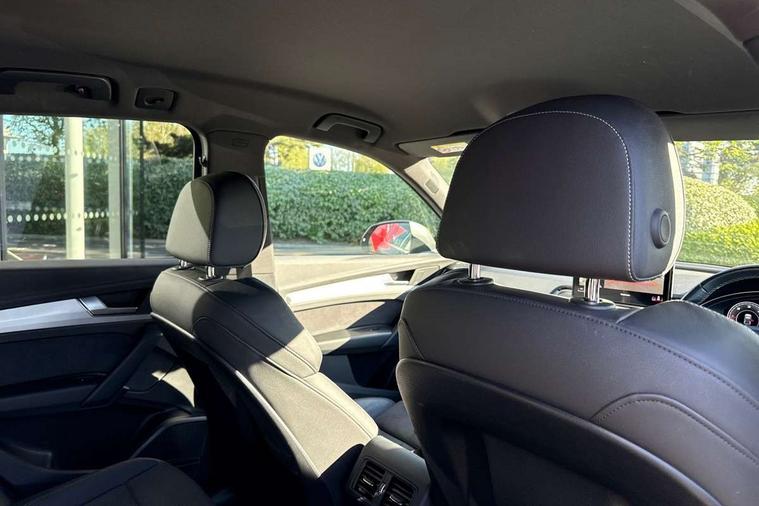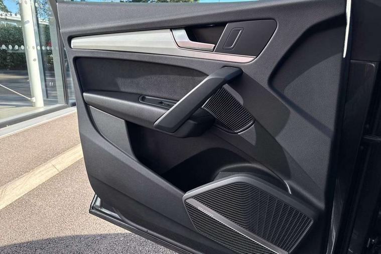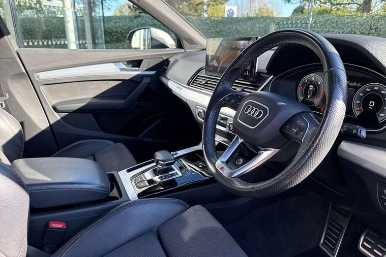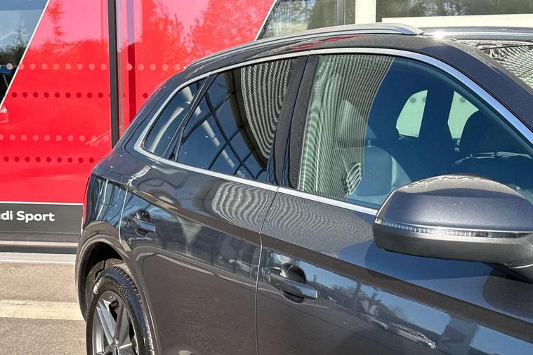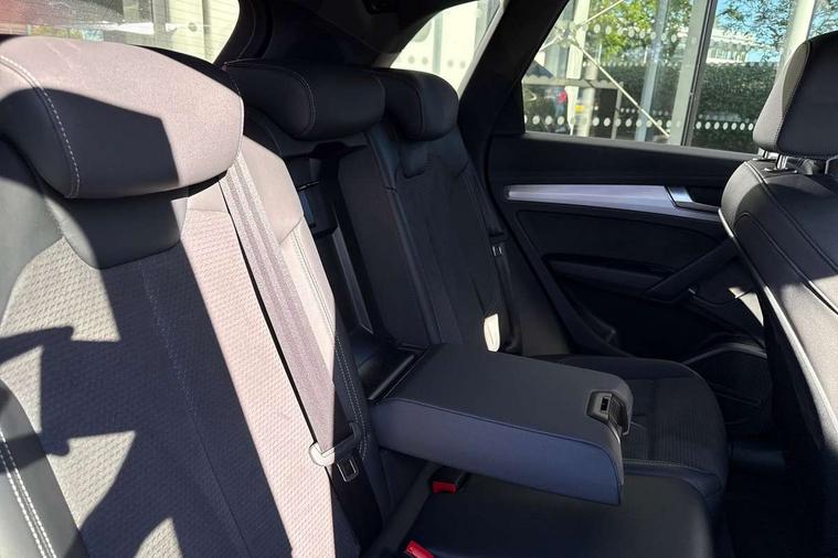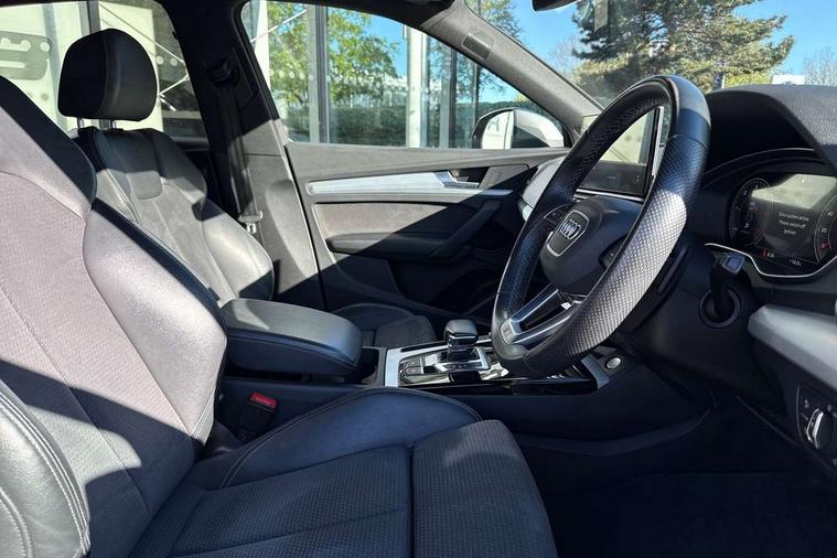 Acoustic front and rear parking sensor, Audi connect safety and service (e-call), Audi connect with Amazon Alexa Integration, Audi drive select, Audi virtual cockpit plus with 12.3" screen and three different layout designs, Audi wireless smartphone interface, Automatic start-stop system with coasting functionality and efficiency programme, Bluetooth interface, Electro - mechanical power assisted steering, MMI navigation plus with 10.1" touch screen, Power tailgate, Reversing camera, Service interval indicator, Voice control system with Audi hotword activation "Hey Audi", Diesel particulate filter, Quattro on demand, S line sports suspension, 2 x USB charging port with aux input socket, 8 loudspeakers, DAB Digital radio, Acoustic windscreen, Aluminium roof rails, Audi matrix LED headlights with dynamic front and rear indicators, Auto dimming door mirrors, Auto dimming frameless rear view mirror, Automatic headlight adjustment, Automatic headlights and windscreen wipers, Body colour bumpers, Body colour door mirrors, Body colour rear diffuser with matt aluminium silver surrounds, Body colour underbody protection, Chrome plated exhaust trims, Daytime running lights, Door sills in Selenite silver, Electric adjustable/heated/folding door mirrors, Front air inlet surrounds in aluminium, Front and rear electric windows, Front radiator grille in honeycomb design, Headlight washers, High level LED brake light, Lower bumpers painted in contrast Manhattan grey, Rear chrome trim strip below lights, Rear privacy glass and rear side windows, Rear side wing doors, Rear wiper, Roof bars, S Line badges on the front wings, S Line front and rear bumpers, S Line rear spoiler, S Line side skirts, 3 rear headrests, 3 spoke leather multifunction steering wheel with S badging perforated leather grips, 40:20:40 split folding 3 rear bench seat in 2nd row with rear centre armrest, Black cloth headlining, Comfort front centre armrest, Contrast stitching on seats, steering wheel and gear lever gaiter, Deluxe 3 zone electronic climate control, Front/rear floor mats, Gear lever in black leather, Heated front seats, Height adjustable front head restraints, Height/reach adjustable steering column, Illuminated door sill trims with S logo, Luggage compartment cover, Manual seat adjustment with 4-way electric lumbar support, Removable luggage compartment floor, Single front passenger seat, Stainless steel pedals, Sunvisors with vanity mirrors, High gloss pack - Q5, LED interior light pack - Q5, 3 point seatbelts on all seats, 6 airbags - Driver, front passenger, curtain and side airbags, Electrically operated child locks on rear doors, Electromechanical parking brake, Electronic stabilisation control including ABS, ASR and EDL, First aid kit with warning triangle and vests, Front passenger airbag deactivation, Hill descent control, Hill hold assist, ISOFIX child seat mounting for front passenger seat and ISOFIX child seat mounting with Top Tether for outer rear seats, Multi collision brake assist, Pop-up bonnet for pedestrian protection, Pre sense city, Seat belt force limiter, Seatbelt monitoring, Tyre pressure warning, Anti theft alarm, Anti-theft wheel bolts, Keyless Go access/ignition system, Remote central locking, Air vents inserts and centre console in gloss black, Matt brushed aluminium inlays,