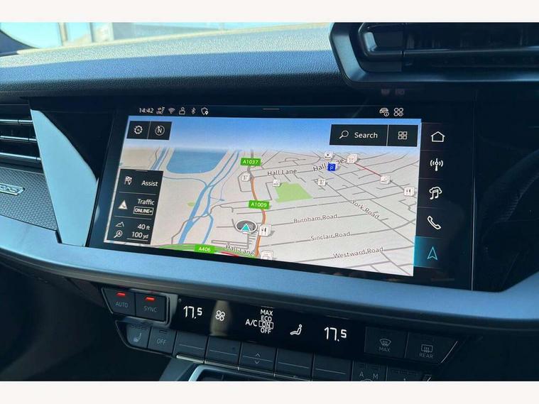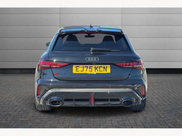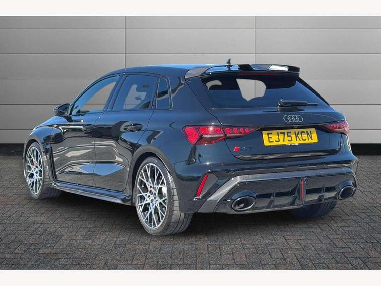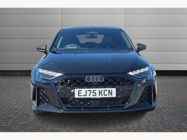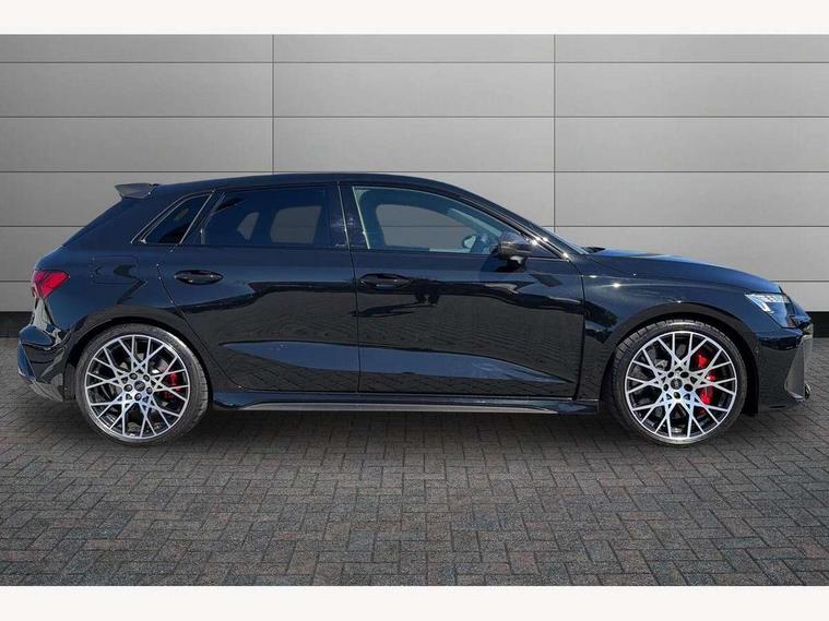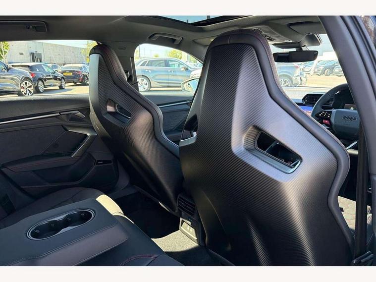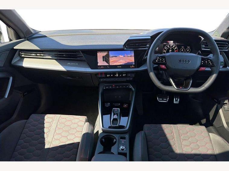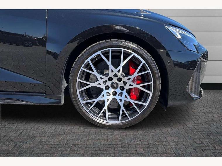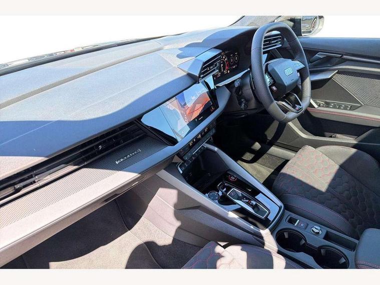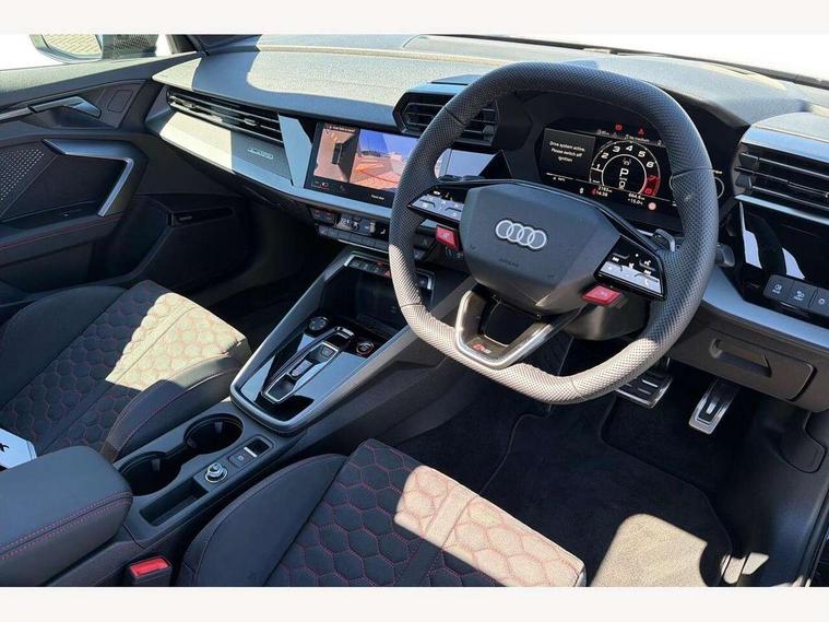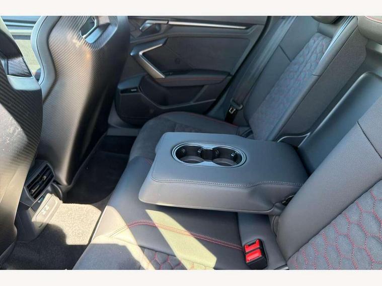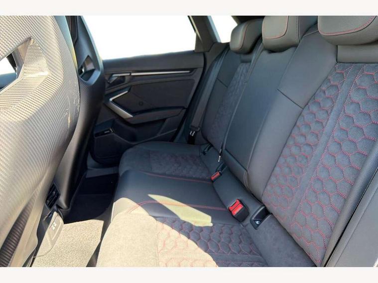 Adjustable speed limiter, Audi drive select comfort, auto, dynamic and efficiency, Audi virtual cockpit plus with RS specific design and 12.3" display with additional graphic display options, Automatic start/stop system with recuperation, Bluetooth interface, Camera based traffic sign recognition, Collision avoidance assistant, Driver attention and fatigue detection, e-Call (emergency call), MMI Navigation Plus with high resolution 10.1" colour touch screen display, Progressive steering, RS specific driving modes - RS Individual, RS Performance and RS Torque rear, Service indicator, Smartphone interface with app store includes wireless Apple carplay, Android auto and Amazon alexa integration, Trip computer, Voice control system with natural language interaction, Adaptive suspension, Increase of top speed to 174 mph, Quattro permanent four wheel drive, Audi Phonebox light with wireless charging, DAB Digital radio, USB ports with charging function in the rear, Audi beam LED projection of RS logo on ground as you exit, Auto dimming frameless rear view mirror, Carbon door mirror housings, Electrically adjustable/heated/folding/auto dimming door mirrors with integrated LED indications + kerb view function for passenger side, Engine compartment cover with carbon trim, Exterior model badging, Front electric windows, Heat insulating glass windscreen, LED 3rd brake light, Light and rain sensors, Privacy glass - dark tinted rear window, rear door and side windows, Rear electric windows, Rear side wing doors, Rear wiper, Roof edge spoiler in carbon, RS sport exhaust system - dual branch with flap control and gloss black oval tailpipe trims, 12V socket and storage compartment in front centre console, 3 seat bench in 2nd row, 3 Spoke flat top and bottomed black leather multi function steering and gear shift paddles, 3-zone deluxe automatic air conditioning, 40/20/40 split folding rear seat bench, Black cloth headlining, Black front and rear floor mats, Front and rear headrests, Front centre armrest, Front door sill trims with RS 3 logo, Heated front seats, Height and reach adjustable steering wheel, Manual boot compartment lid, Rear centre armrest with cupholder, Seat side bolsters, Single front passenger seat, Stainless steel pedals and front footrest in black, Vanadium look - Interior door handles, Door trim, power latching, Air vents, window controls, mirror adjust, rear door lock, Selector lever in centre console, Black Styling plus package - RS3, Extended ambient lighting package Pro with Multi-coloured contour lighting of instrument panel - RS3, RS exterior features pack in carbon and gloss black - RS3, Storage package - RS3 Sportback, 3x3 point rear seat belts, Driver and front passenger airbag with passenger airbag deactivation, Electronic Stabilisation Control (ESC) including ABS, ASR and EDL, First aid kit with warning triangle and 2 safety vests, Hill hold assist, Pre-sense front with pedestrian and cyclist detection, Seatbelt monitoring, Tyre pressure loss indicator, Anti theft alarm, Anti-theft wheel bolts, Electronically operated child locks, Immobiliser, Black dashboard, Inlays in carbon atlas structure, Tyre repair kit,