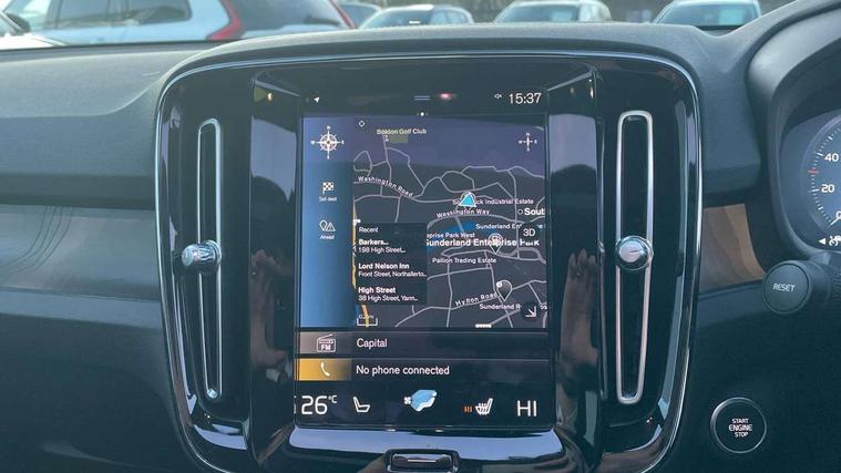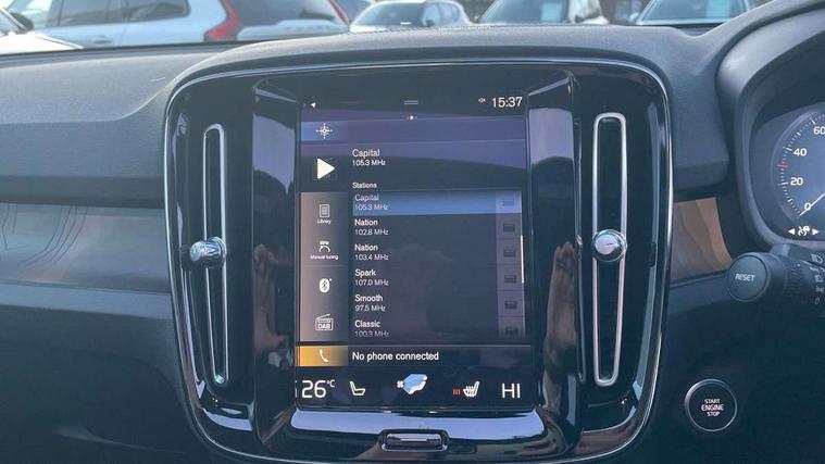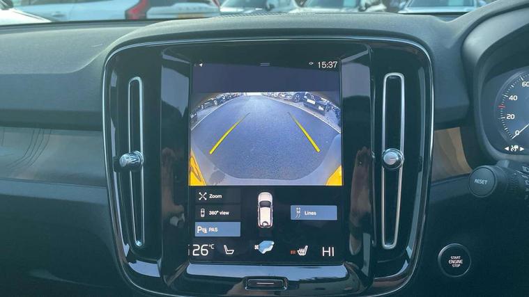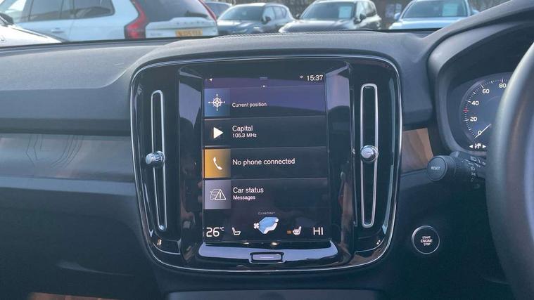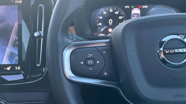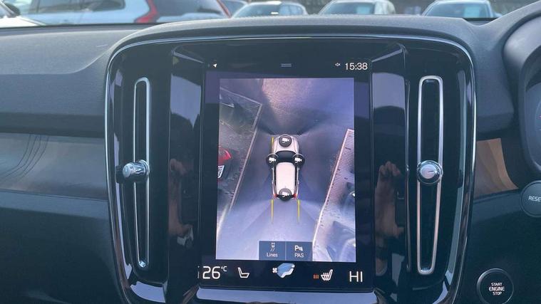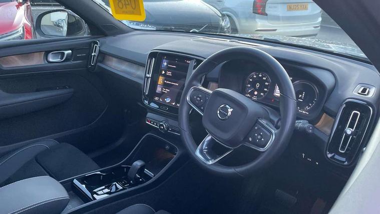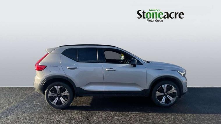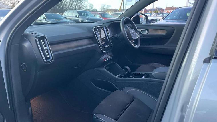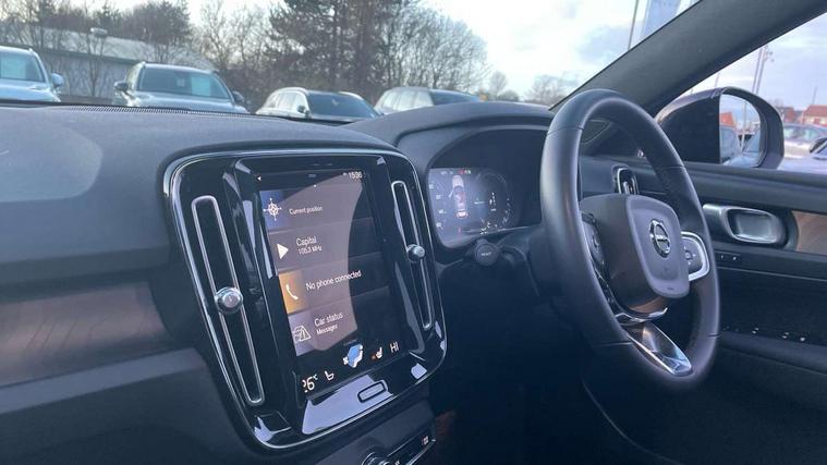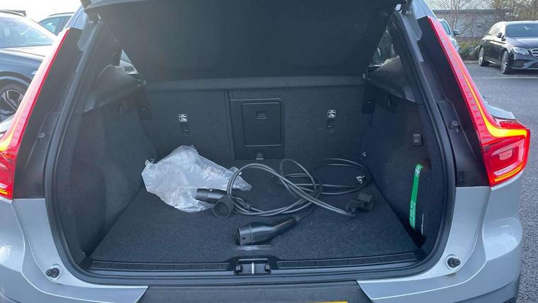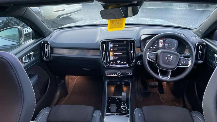 12.3" Active TFT crystal driver's instrument display, 360 degree surround view parking camera, 9" centre console portrait touch screen, Adjustable steering wheel force, Bluetooth hands free telephone kit, Drive mode selector, E-call, Front park assist, Hands free power tailgate, Lane keep assist with driver alert control, Oncoming Lane Mitigation, Rear park assist, Sensus navigation with European mapping and traffic information, Speed limiter, Speed sensitive steering, Voice activated control for key functions, Wireless Smartphone Integration includes Apple CarPlay and Android auto, Wireless/Inductive Mobile Phone Charging, 3.7 kW monophase on board charger, 7m 10amp charge cable with 3 pin plug and 7m 1 phase 16amp type 2/mode 3 charge cable, Dynamic chassis, Electric front axle drive, Recharging port located in nearside front wing, DAB Digital radio, Low speed exterior sound speaker, Premium Sound by Harman Kardon, Dolby Pro Logic II Surround Sound, Dirac Unsion, 12 speakers/600W and subwoofer, Steering wheel mounted remote controls, Active bending pixel LED headlights with adaptive shadow technology, Active high beam incorporating daytime running lights, Adaptive brake lights with high level LED brake lights, Auto dimming interior mirror, Automatic headlamp levelling, Dark tinted windows for rear door side windows and cargo compartment, Front and rear electric windows, Front recharge aluminium tread plates, Headlight cleaning system, High gloss black front and rear skid plate, High gloss black mesh front grille with high gloss black surround, High gloss black window trim, Home safe and approach lighting, Integrated roof rails in high gloss black, LED front fog lights, Power glass tilt and slide panoramic sunroof with sun curtain, Puddle lights, Rain sensor with automatic windscreen wiper activation, Rear side wing doors, Rear wiper, Roof antenna, Roof spoiler, Visible VIN plate, 12V socket in front tunnel console and cargo compartment, 2 zone electronic climate control with clear zone air quality system and pollen filter, 3 seat bench in 2nd row, 3 Spoke tailored steering wheel with chrome trim, 60/40 versatile split folding rear seat, A-pillar parking ticket holder, C-pillar Recharge logo, Centre console cupholders and storage, Floor mats, Front door pocket, front cupholder, ambient front door, rear reading, rear courtesy, instrument panel and tailgate lighting, Front footwell illumination, Front headrests, Front reading light and theatre lighting, Front seat cushion extensions, Front tunnel pocket, Glovebox bag hook, Heated front seats, Height adjustable passenger seat, Height/reach adjustable steering column, High gloss centre tunnel deco, Illuminated glovebox, Illuminated luggage compartment, Illuminated vanity mirrors, Isofix attachments on rear seats, Load protection net, Multi directional lumbar support, Power driver seat with memory + exterior mirrors memory, Power folding rear headrests, Power passenger seat, Rear armrest / integral cup holders / storage tray, Single front passenger seat, Underfloor cargo storage, Climate pack without heated front seats - XC40, Driver assist pack - XC40, 3x3 point rear seatbelts, City safety includes pedestrian, cyclist and large animal detection and front collision warning with full auto brake, Drivers knee airbag, Dual stage driver/passenger airbags, Electronic parking brake with auto hold, First aid kit, Front and outer rear seatbelt reminder and pretensioners, Front seats SIPS airbags, Hill descent control, Hill start assist, Inflatable curtain, Passenger airbag cut-off device, Power child locks on rear doors, Road sign information display, Run off Road Mitigation, Run off Road Protection, SIPS (Side Impact Protection System), Slippery road and hazard light alert, Stability and Traction Control with Spin control, Engine Drag Control and Corner Traction Control, Tyre pressure monitoring system, Vehicle deceleration control with Anti-lock Brake System, Electronic Brake Distribution and Emergency Brake Assist, Warning triangle, WHIPS whiplash protection system - front, Anti-theft alarm including immobiliser/volume sensor + level sensor, Care key with user defined top speed, Key integrated remote control central locking + fuel flap with deadlocking system and auto open/close power windows, Keyless drive includes keyless entry and keyless start, Locking wheel nuts, Private locking for tailgate,