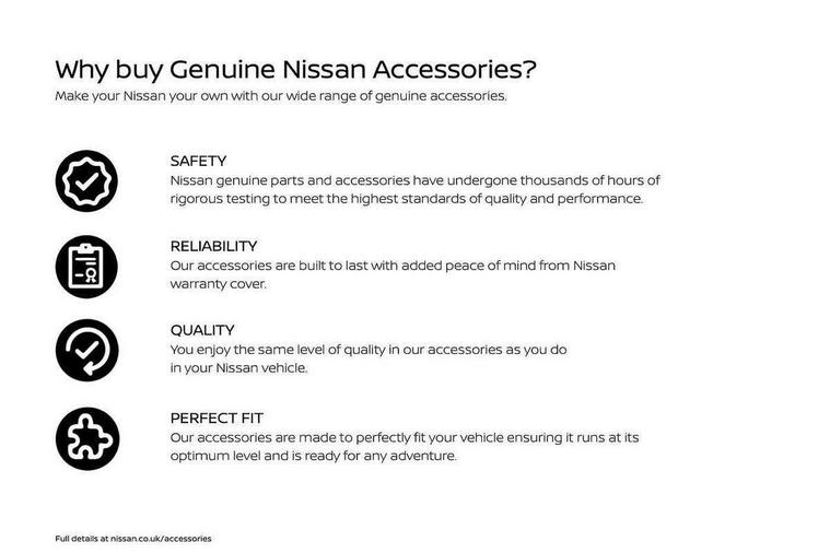 12.3" full colour TFT screen combimeter, Drive modes select (Eco, normal and sport), e-Pedal step, Emergency and breakdown call, EV mode switch, Front parking sensor, Intelligent driver alert system, Intelligent lane intervention, Lane departure warning system, Nissan connect 12.3" touch screen entertainment system, Nissan connect nav with TomTom traffic, Nissan connect services, Outside temperature sensor, Power Steering, Rear parking sensor, Stop/start button, Traffic sign recognition, Trip computer, Voice recognition, WiFi connectivity, Wireless Apple CarPlay and Google Android auto, Wireless Smartphone charger, 10 Bose speakers 8 speakers and 2 headrest speakers for driver/passenger seats, 2 X Rear console USB port, Bluetooth system, USB, Aux-in and 12V socket, Bose personal plus audio system, DAB Digital radio, Auto dimming frameless rear view mirror, Automatic hazard signal with emergency stop signal, Body colour door handles, Electrically adjustable door mirrors with integrated indicators, Follow me home headlights, Front and rear electric window with one touch driver window, High beam assist, LED 3rd brake light, LED daytime running lights, LED front fog lights, LED headlamps, LED rear fog lamp, LED rear lamps, One touch passenger window, Rear privacy glass, Rear side wing doors, Rear wiper, Roof spoiler, Shark fin roof antenna in solid Black, Solid black door mirrors, Three blink turn signal, 3 height adjustable rear headrests, 3 seat bench in 2nd row, 60/40 split folding rear seat, Card holder on driver sunvisor, Door ambient lighting, Driver seat back pocket, Driver side rear coat hanger, Driver/passenger sunvisors and vanity mirrors, Front and rear cabin lights, Front armrest, Front door pockets with bottle holders, Front head restraints, Front/rear passenger grab handles, Gear console ambient circle lighting, Height adjustable driver's seat, Internal chrome door handles, Luggage board, Luggage space lighting, Monoform sporty seats, Multifunction steering wheel, Passenger seat back pocket, Rear door bottle holders, Single front passenger seat, Smooth synthetic leather steering wheel, Synthetic leather kneepad, Synthetic leather shift knob, Synthetic leather upholstery, Telescopic steering wheel adjustment, Two cupholders in front centre console, Two rear isofix child seat anchorage points with top tether, Welcome light and console tray ambient lighting, Comfort pack - Juke, Heat pack with height adjustable passenger seats - Juke, ProPilot pack - Juke Auto, ABS with EBD and brake assist, Active ride control, Active Trace Control, Driver and passenger airbags, Driver and passenger side airbags, Electric handbrake with auto hold function, Electronic Stability Programme (ESP), Front and rear curtain airbags, Height adjustable seatbelts, Hill start assist, Intelligent emergency braking with pedestrian and cyclist recognition, Rear door child safety locks, Seatbelt reminder for driver/front passenger and rear seats, Three 3 point rear seatbelts, Traction control, Tyre pressure monitoring system, VDC Dynamic Vehicle Control, Alarm, Immobiliser, Intelligent key and start push button with walk away lock and approach unlock functions, Remote central locking, 19" Alloy wheels, Tyre puncture repair kit,