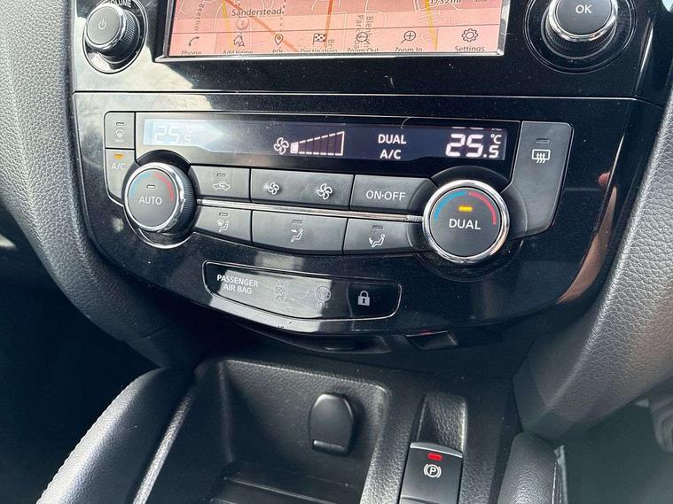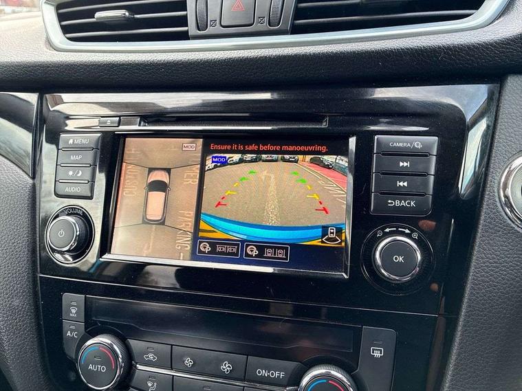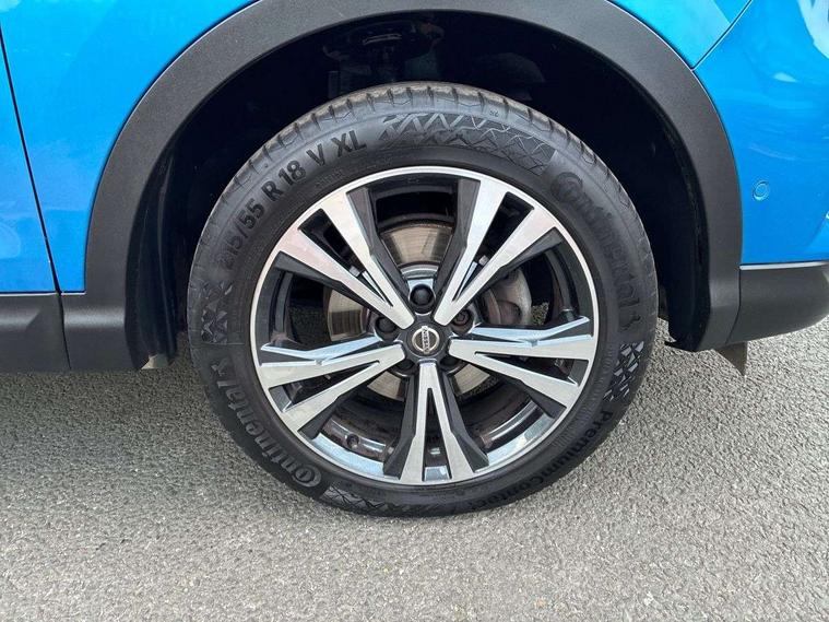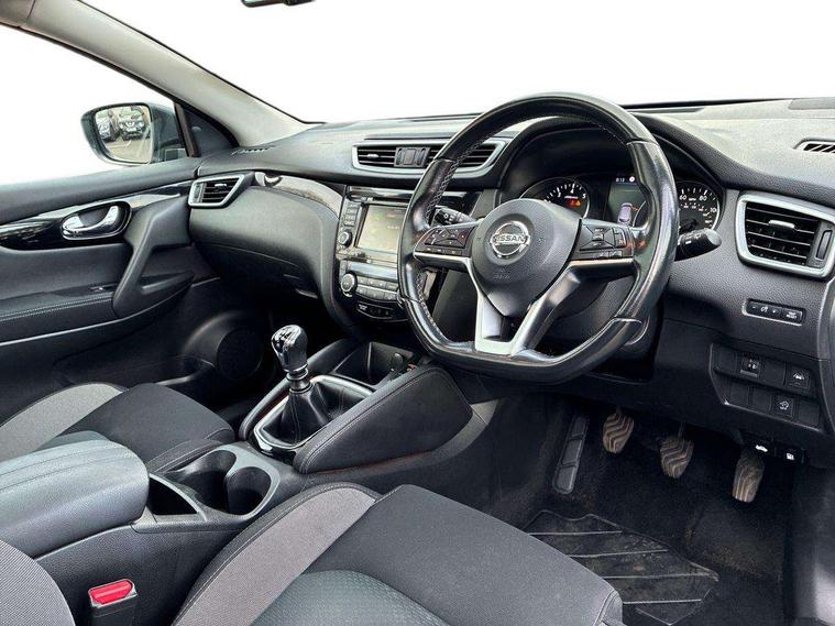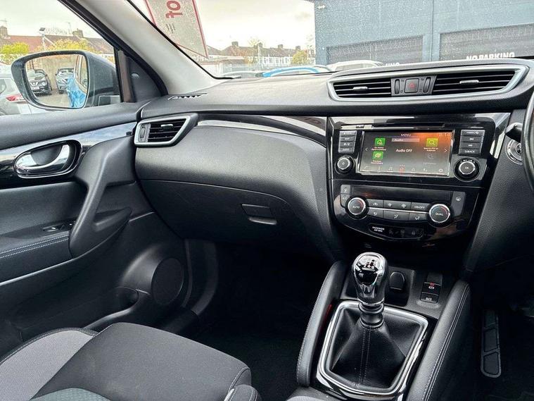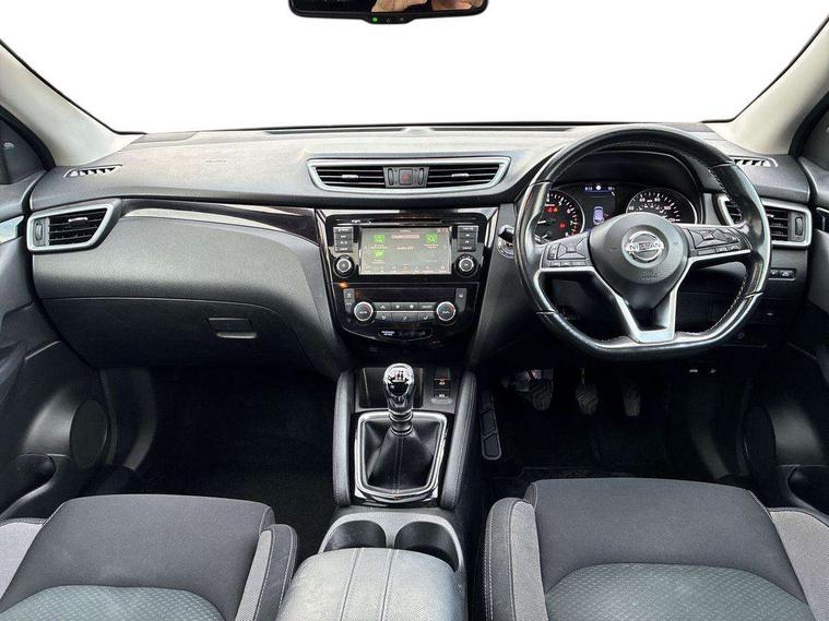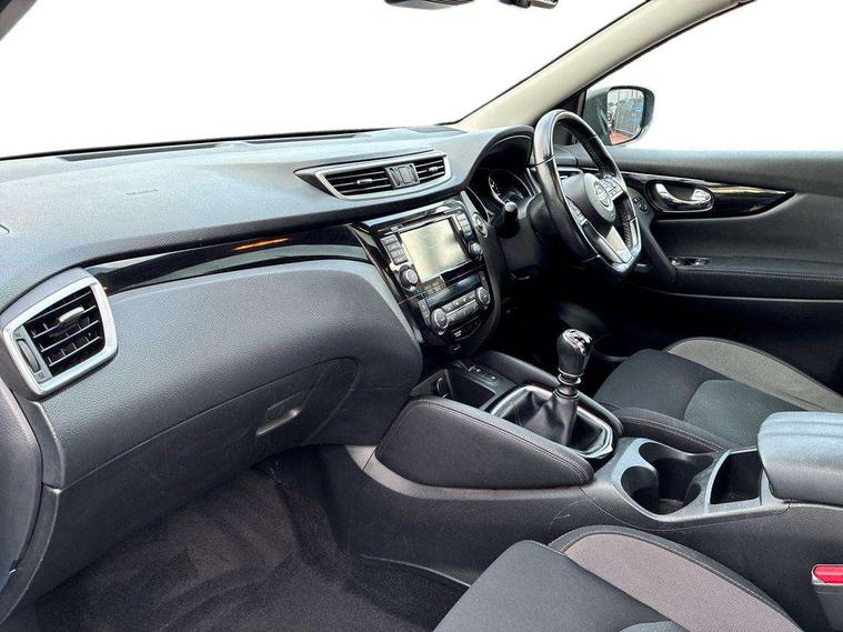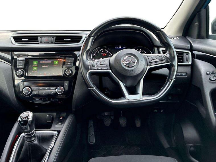 Advanced drive assist display 5'' TFT coloured screen, Android Auto, Apple CarPlay preparation, Bluetooth connectivity, Electric speed sensitive power steering, Front parking sensors, Intelligent around view monitor, Intelligent parking assist, Lane departure warning system, Nissan connect evo 7" touchscreen navigation and entertainment system, Normal or sport selectable steering, Outside temperature sensor, Push button starter, Rear parking sensors, Rear view camera, Service interval indicator, Smartphone integration, Stop/start system, Tomtom connected services, Traffic sign recognition, Trip computer, Voice control system, 6 speakers, AM/FM radio, CD audio system, Aux-in socket, DAB Digital radio, Rear USB connection, Steering wheel mounted audio controls, USB port, Anti dazzle rear view mirror, Auto wipers, Body colour bumpers, Body coloured door handles, Body coloured door mirrors, Chrome window surround, Daytime running lights dip function when turn signal applied, Electric folding door mirrors, Electric front and rear windows with one touch illuminated window controls, Electric front/rear windows, Electrically adjustable door mirrors, Front fog lights, Halogen headlights, Heated door mirrors, High beam assist, Intelligent auto headlights, LED indicators in door mirrors, Matt silver roof rails, One touch 4x auto windows with illuminated switches, Privacy glass, Rear roof spoiler, Rear wiper with reverse link, Shark fin antenna, Signature LED daytime running lights, Underbody vortex generators, 2 X front 12v power sockets, 3 height adjustable rear headrests, 60/40 split folding rear seat, Ambient lighting, Ambient lighting in centre console, Boot lighting, Centre console storage box/armrest, Chrome interior door handles, Cloth upholstery, Configurable luggage board system, Driver's seat manual height adjust, Dual zone climate control, Front and rear door pockets with bottle holders, Front and rear seat belt pre-tensioners with load limiters, Height adjustable front headrests, ISOFIX restraints on outer rear seats x2, Leather D shaped steering wheel, Leather gear lever, Leather knee pad, Manual height adjustable front passenger seat, Manual lumbar support on driver seat, Parcel shelf stow function under luggage board, Pollen filter, Rear armrest with 2 cupholders, Synthetic leather wrapped door handle with contrasting stitching, Tilt/telescopic adjustable steering wheel, Safety shield plus pack - Qashqai, 6 airbags - Driver, front passenger, curtain and side airbags, ABS, ESP, EBD and brake assist, Auto hold function, Child locks on rear doors, Electronic parking brake, Front and rear seat belt warning, Front passenger airbag deactivation, Height adjustable front seatbelts, Hill start assist, Intelligent emergency braking with pedestrian recognition, Three 3 point rear seatbelts, Tyre pressure monitoring system, Anti-theft immobiliser, Intelligent Key, Remote central locking, Thatcham Cat.1 alarm, Glossy black dash trim, Tyre puncture repair kit,