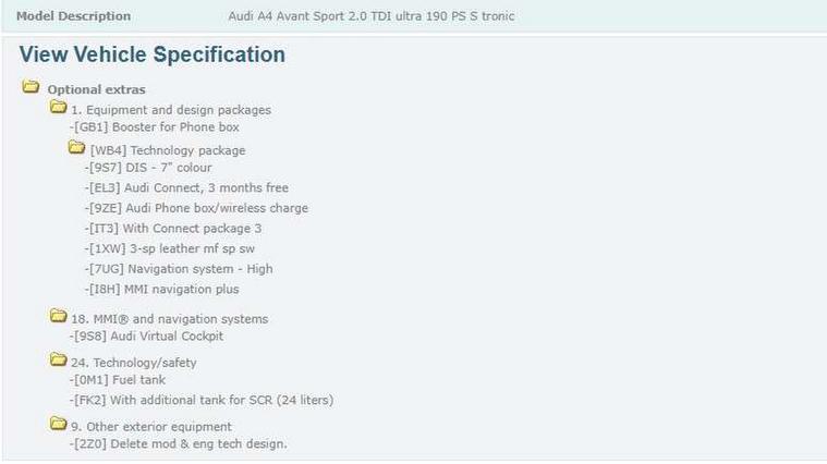 Audi drive select, Audi Pre sense collision avoidance, Audi smartphone interface, Electro-mechanical PAS, Power boot opening and closing, Service interval indicator, Stop/start button, Voice control system, 2 USB ports, Aux input, DAB digital radio module, MMI radio plus with CD player, Acoustic windscreen, Air inlets in titan black with two horizontal inlays in chrome, Auto dimming rear view mirror, Automatic headlights + automatic windscreen wipers, Body colour bumpers, Chrome door handles, Chrome rolled exhaust, Electric adjustable heated door mirrors, Electric front windows, Electric rear windows, Headlight range control, LED daytime running lights, LED indicators in door mirrors, Rear diffuser in Twilight grey matt, Rear wiper, 3 zone climate control, Aluminium door sill trims, Front centre armrest with 12v socket, Front/rear floor mats, Gearshift paddles, Isofix child seat preparation for front passenger/outer rear seats inc passenger airbag deactivation, Jack and tool kit, Reach + rake adjustable steering column, Rear headrests, Retractable load area cover, Split folding rear seats, Sunvisors with vanity mirrors, Top tether anchor plate for isofix child seat, 3 point seatbelts on all rear seats, ABS/EBD, Adaptive driver and front passenger airbags, Electromechanical parking brake, ESP, First aid kit, Front head airbags, Front seatbelt pretensioners + load limiters, Front side airbags, Multi-Collision braking, Seatbelt warning, Traction control, Tyre pressure monitoring system, Warning triangle, Keyless Start, Locking wheel bolts, Remote central locking, Thatcham category 1 alarm + immobiliser, Low rolling resistance tyres,