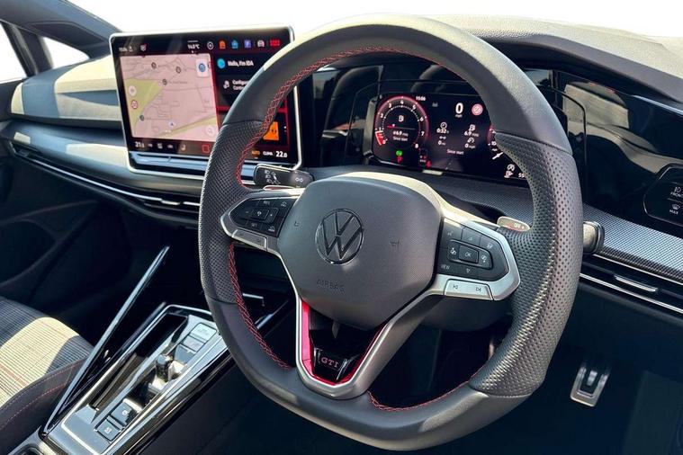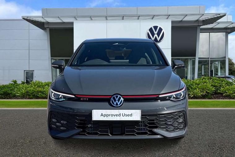 Activated carbon canister, Adaptive cruise control (ACC), Advanced driver attention and drowsiness monitor, Dynamic road sign display, E-Sim card for online connectivity, eCall emergency call system, Multi-color Digital cockpit pro, selection of different info profile possible, Multifunction front facing camera for distance control, Navigation system, Oncoming vehicle braking when turning including swerve support, Side assist blind spot lane change system, rear traffic alert and exit warning system, Speed limiter, Speedo, rev counter, electronic odometer, trip, service interval display, exterior temperature and fuel gauge, Traffic jam assist, Voice enhancer and voice control, Warning signal and warning light for front and rear seatbelts not fastened, We connect plus preparation, We connect preparation, Wireless app connect, Front differential lock, Petrol Particulate Filter, Start-stop system with battery regeneration (recuperation - energy recovery during braking), 2 USB C ports in front, 2 USB charging sockets on the centre console in the rear charging capacity upto 45W, Digital radio reception (DAB), Diversity antenna for FM reception, Gaming platform via car app, Infotainment system with 12.9" display, Mobile phone interface with inductive charging feature, 3rd brake light, Auto dimming rear view mirror, Automatic headlamp activation with Coming home and Leaving home feature, Body colour door handles, Body coloured bumpers, air intake in honeycomb structure, Exterior mirrors convex on the left and aspherical on the right, Front and rear electric windows, Front fog lamps and cornering light, Heat insulating windshield made of laminated glass, Illuminated lighting animation with wake up/goodbye scenario, LED separate daytime running light, Nameplate 'GTI' set, Rain sensor, Rear exhaust tailpipe, Rear fog light on one side and reversing lights on both sides, Rear side wing doors, Rear windscreen washer and wiper with interval delay, Remote electrically foldable door mirrors, puddle lights and reverse activated passenger's door mirror, Welcome light with surround lighting, 12V socket in front centre console, 12V socket in luggage compartment, 3 rear head restraints, 3 seat bench in 2nd row, 30 colour ambient lighting, illuminated center console storage compartment in front, Air care climatronic 3 Zone automatic climate control with rear air conditioning control panel, Aluminium gearshift handle, Brushed stainless steel pedals, Chrome plated radiator grille inserts, air vent surrounds and light switch surrounds, Entry lights, Front + rear black carpet mats, Front centre armrest, ISOFIX anchors for child seats on outer rear bench seats and on front passanger seat compatible for i-Size, Luggage compartment lighting, Rear cupholder and loadthough, Single front passenger seat, Soul black instrument panel, Soul black roof lining, Split folding backrest with centre armrest and unsplit rear seat bench, Sun visors with illuminated vanity mirrors, Driver assistance pack - Golf Estate/Hatchback Auto, Technology park and comfort pro package - Golf Hatchback, 3 point height adj front seatbelts + pretensioners, 3 rear three point seatbelts, ABS, Autonomous emergency braking front assist with pedestrian and cyclist monitoring, Child locks on rear doors, Driver and front passenger airbag with front passenger airbag deactivation, Electronic parking brake with auto hold, ESC (Electronic Stability Control), Extended pedestrian protection measures, Hill start assist, Rear disc brakes, Two tone horn, Tyre pressure loss indicator, Volkswagen roadside assistance, Anti theft wheel bolts, Preparation for alcohol interlock, Decorative inserts carbon grey for dashboard and front door trim panels, Sporty vehicle dynamics, Tool kit for tyre mobility set, Tyre mobility kit Includes 12V compressor and tyre sealant,