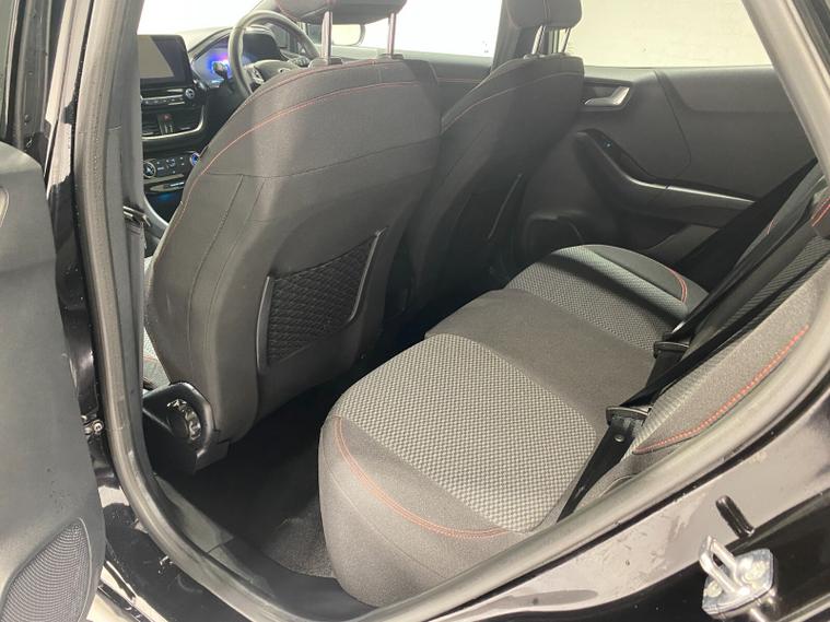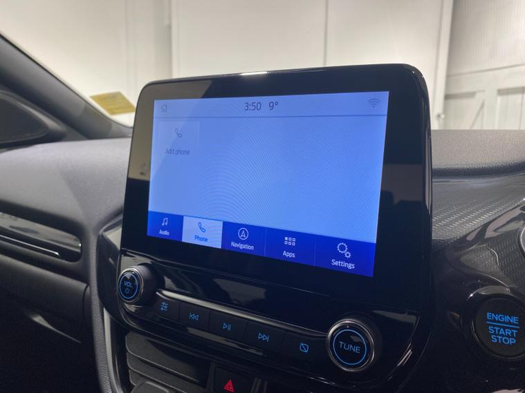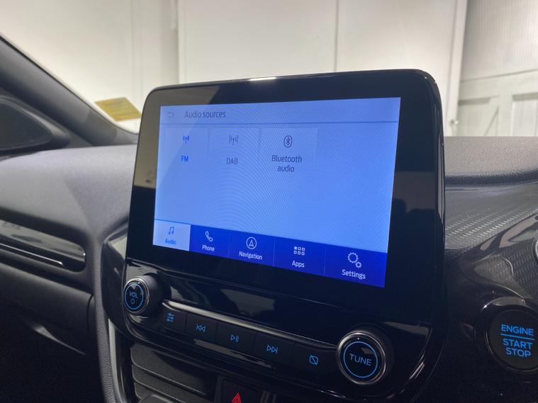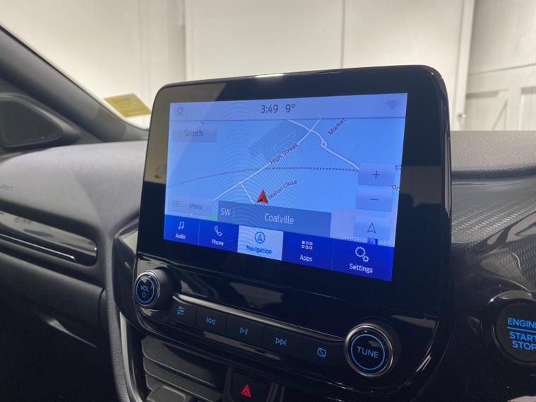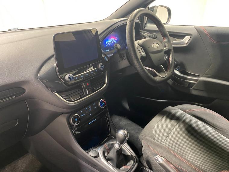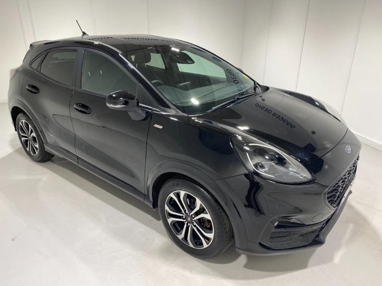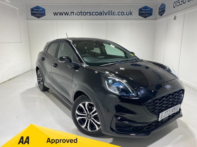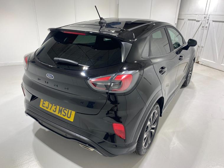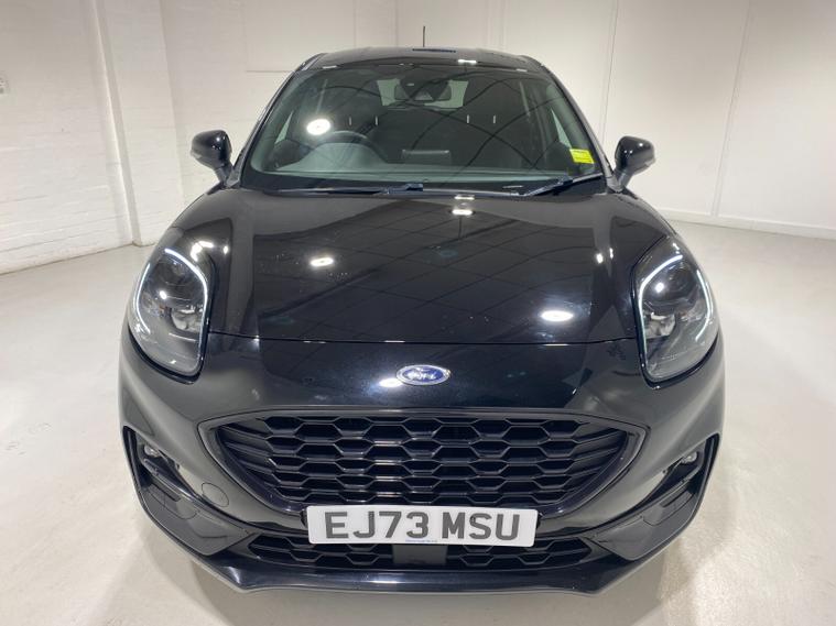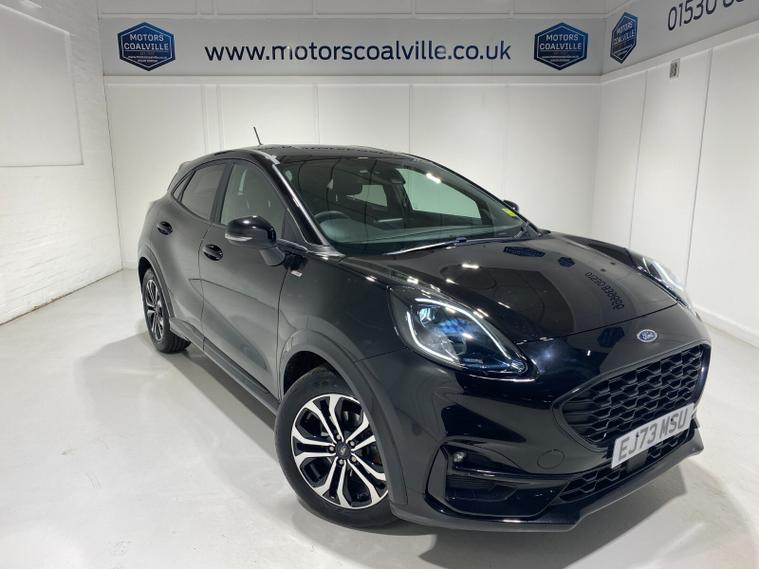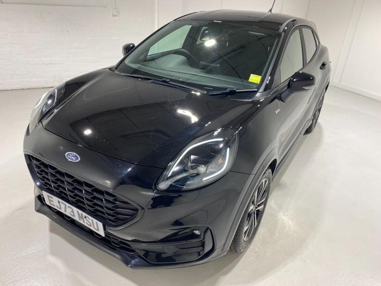 2023 73 Reg Ford Puma 1.0 EcoBoost mHEV (125PS) 6 spd ST Line 5dr. Agate Black with cloth sports interior, ST-LINE BODY KIT with LARGE REAR SPOILER, SYNC 3 DAB SATELLITE NAVIGATION, REAR PARKING SENSORS, Bluetooth USB, PRIVACY GLASS, selectable drive modes- Normal, Eco, Sport, Slippery & Trail, drivers & passenger seat lumbar & heights adjust, FORD MEGABOX EXTENDED BOOT SPACE, REAR parking sensors, 17 inch alloy wheels, AIR CON, FORD power start button, centre console with arm rest, tyre pressure monitoring system, Thatcham alarm, NCAP Pack (lane-keeping alert & lane-keeping aid, speed limiter, rear seat belt minder, rear centre head restraint & auto-headlamps), power folding door mirrors, front fog lamps with cornering lights, heated front screen, remote central locking, electric front windows, ESP, Hill start assist, trip computer, ambient lighting, 28, 578 miles (EJ 73 MSU).