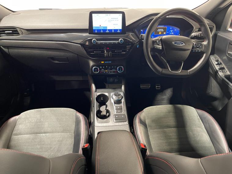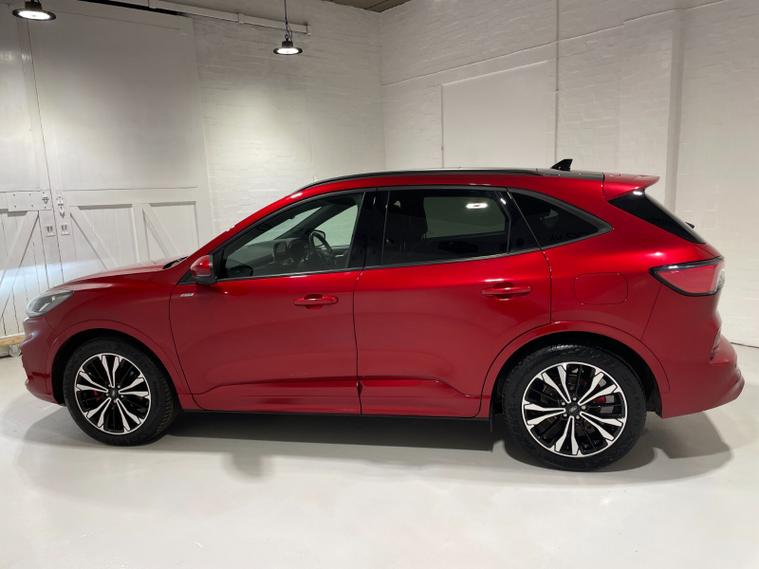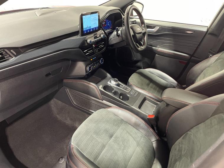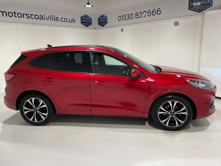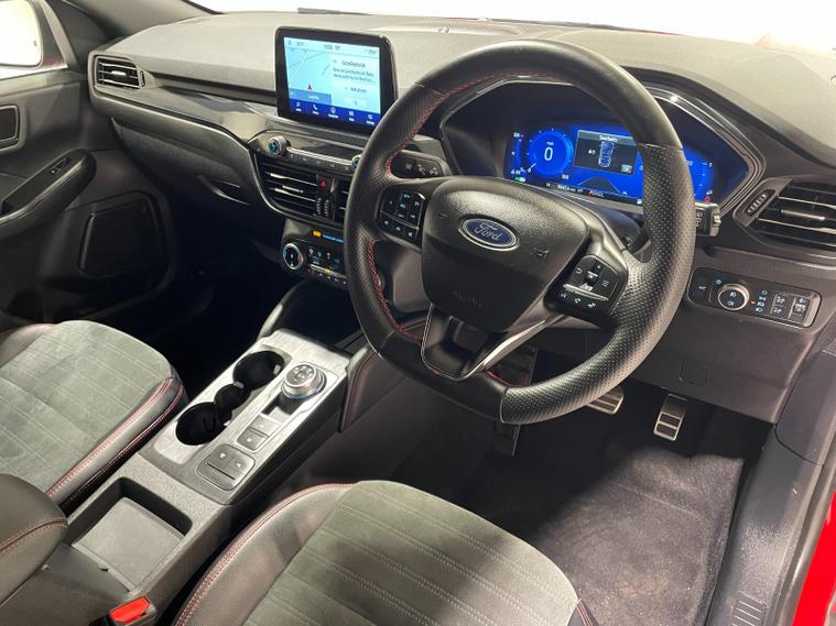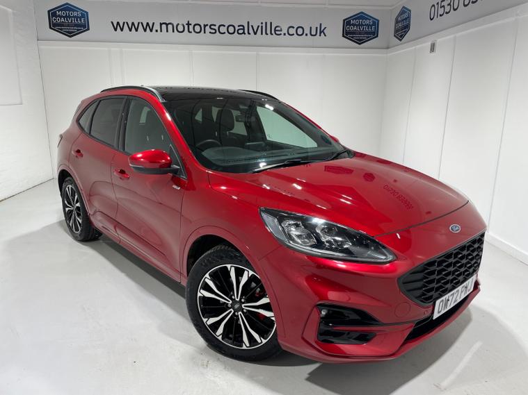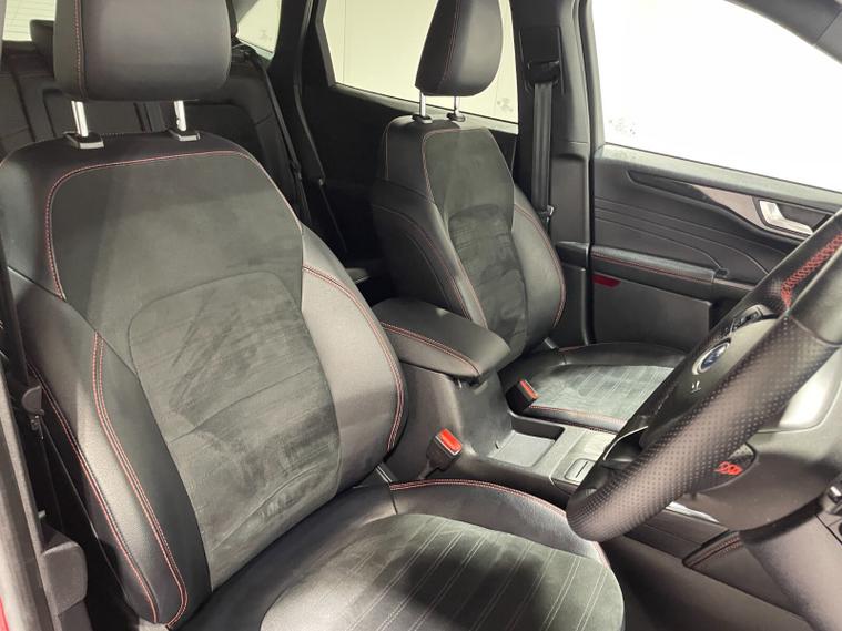2023 72 Reg Kuga 2.5 FHEV (190PS) Automatic ST-Line X Edition 5dr. Lucid Red with Part Sensico interior, REAR CAMERA, REAR HEATED SEATS, ELECTRIC OPENING PANORAMIC SUNROOF, SYNC3 TOUCHSCREEN DAB NAVIGATION, HEATED FRONT SEATS and HEATED STEERING WHEEL, HANDSFREE ELECTRIC TAILGATE, 19 inch machined alloy wheels with red brake calipers, 10 way POWER ADJUSTABLE DRIVERS SEAT, Apple CarPlay and Android Auto, BLUETOOTH USB, cruise control, front and rear electric windows, DUAL ZONE CLIMATE CONTROL, auto lights, rain sensing wipers, electrically operated, heated and POWER FOLDING mirrors, FRONT and REAR PARKING SENSORS, keyless entry and push button start, quickclear heated front windscreen, privacy glass, LED daytime running lights, ESP, Hill start assist, trip computer, ambient lighting, 11, 044 miles (OW 72 PWJ).