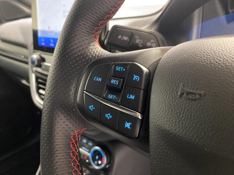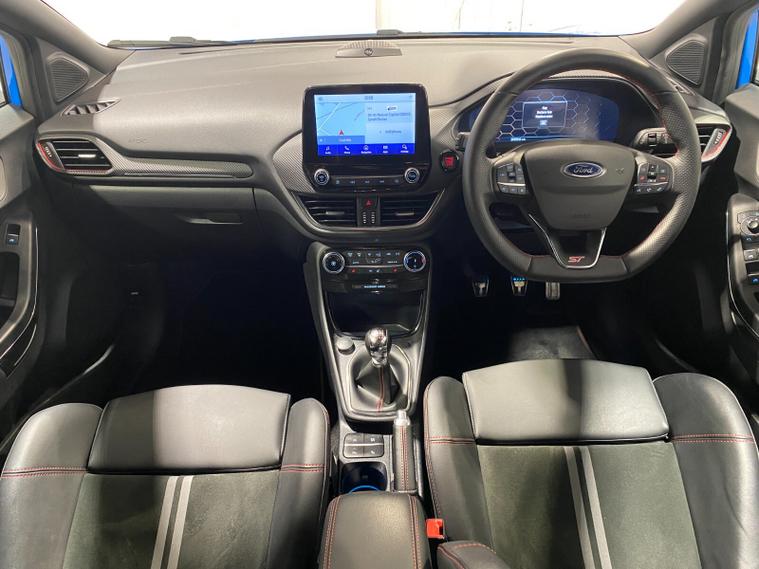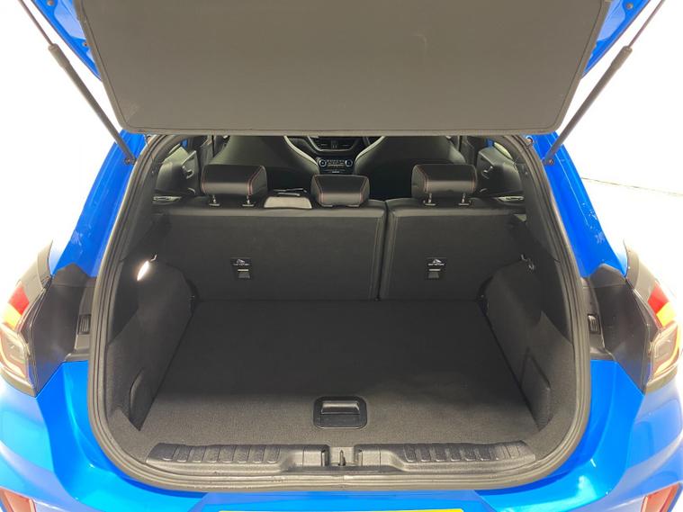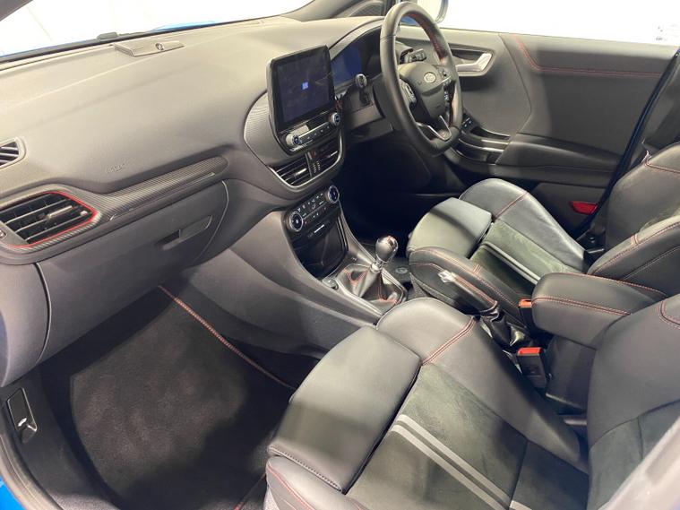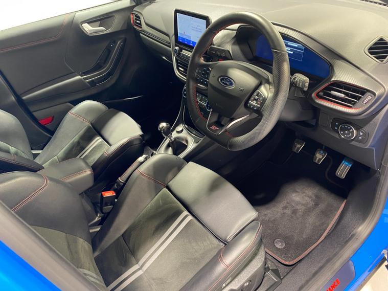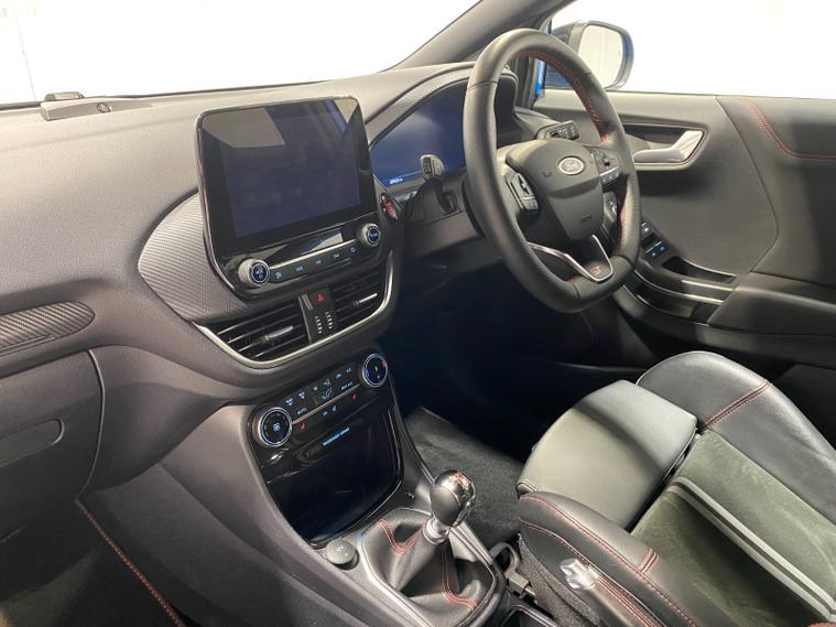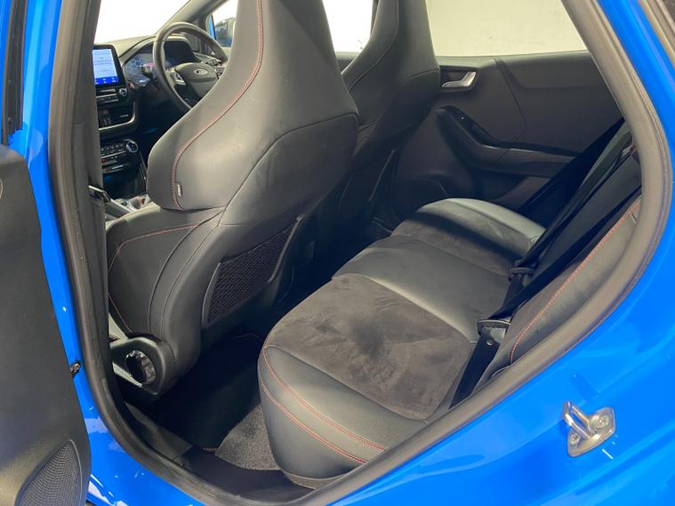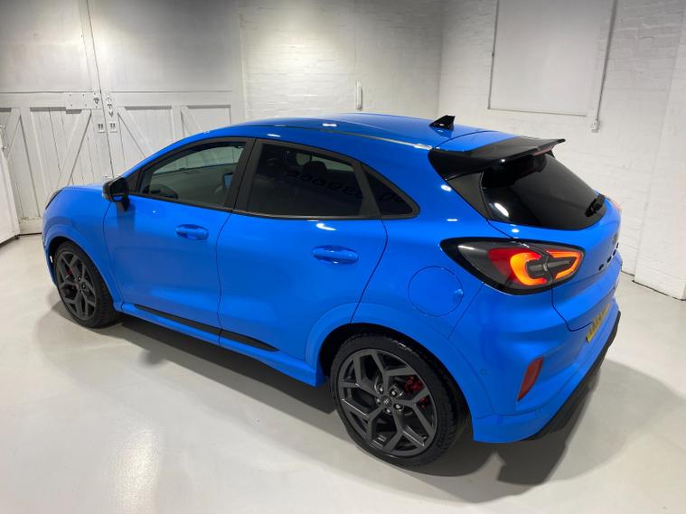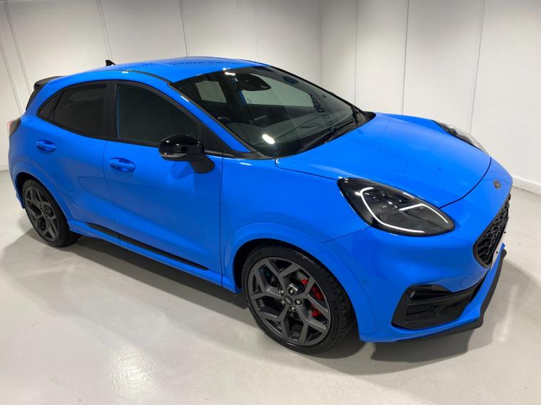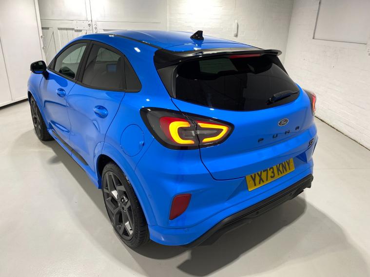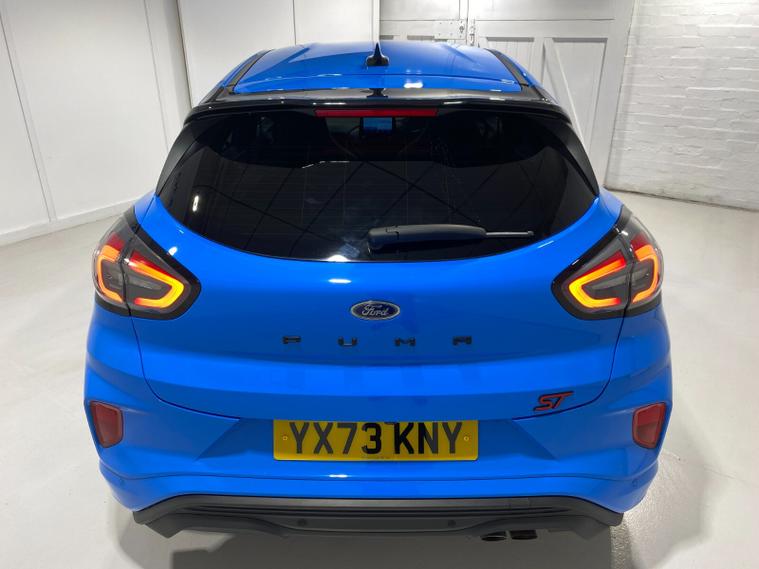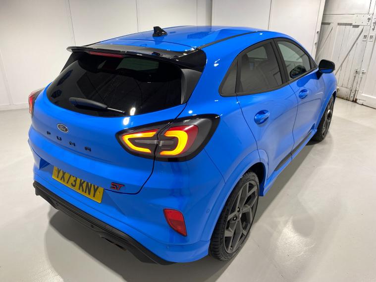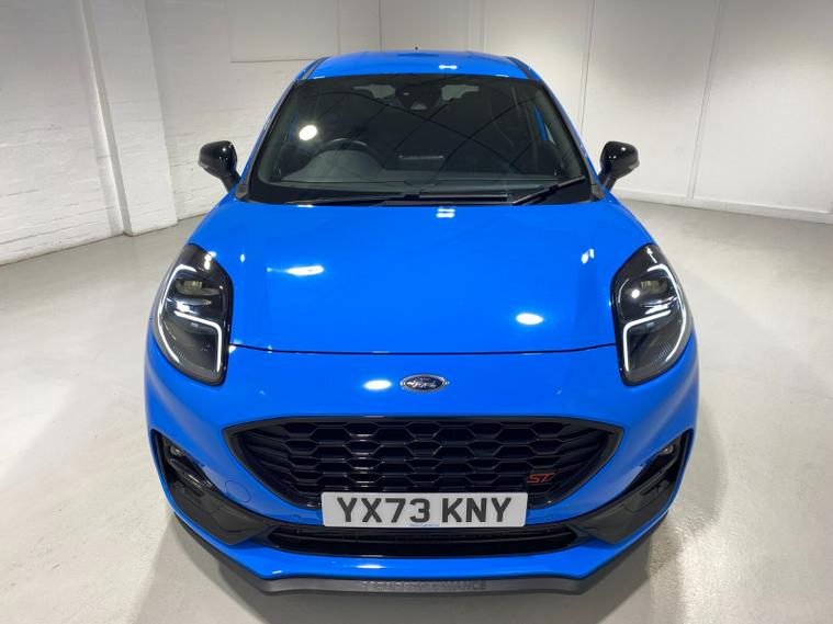 2023 73 Reg Ford Puma 1.5 EcoBoost (200PS) ST 6 spd 5dr. Azura Blue metallic with Ford Performance Part LEATHER/ALCANTARA interior, PERFORMANCE PACK with LAUNCH CONTROL, SHIFT INDICATOR and MECHANICLA LIMITED SLIP DIFFERENTIAL, DRIVERS ASSISTANCE PACK with BLIND SPOT INFORMATION with CROSS TRAFFIC ALERT, Pre COLLISION ASSIST, ACTIVE PARK ASSIST and REAR CAMERA, 19 inch alloy wheels, ST BODY KIT with LARGE REAR SPOILER, SYNC 3 DAB SATELLITE NAVIGATION, B&O sound system, LED headlights, selectable drive modes- Normal, Eco, Sport, Slippery & Trail, drivers & passenger seat lumbar & heights adjust, FORD MEGABOX EXTENDED BOOT SPACE, EATC AIR CON, KEYLESS entry and start with FORD power start button, PRIVACY GLASS, power folding door mirrors, Drivers Assistance features to include traffic sign recognition, auto high beam & driver alert, auto light and rain sensing wipers, centre console with arm rest, tyre pressure monitoring system, Thatcham alarm, NCAP Pack (lane-keeping alert & lane-keeping aid, speed limiter, rear seat belt minder, rear centre head restraint & auto-headlamps), front fog lamps with cornering lights, heated front screen, remote central locking, electric front windows, ESP, Hill start assist, trip computer, ambient lighting, 20, 198 miles (YX 73 KNY).