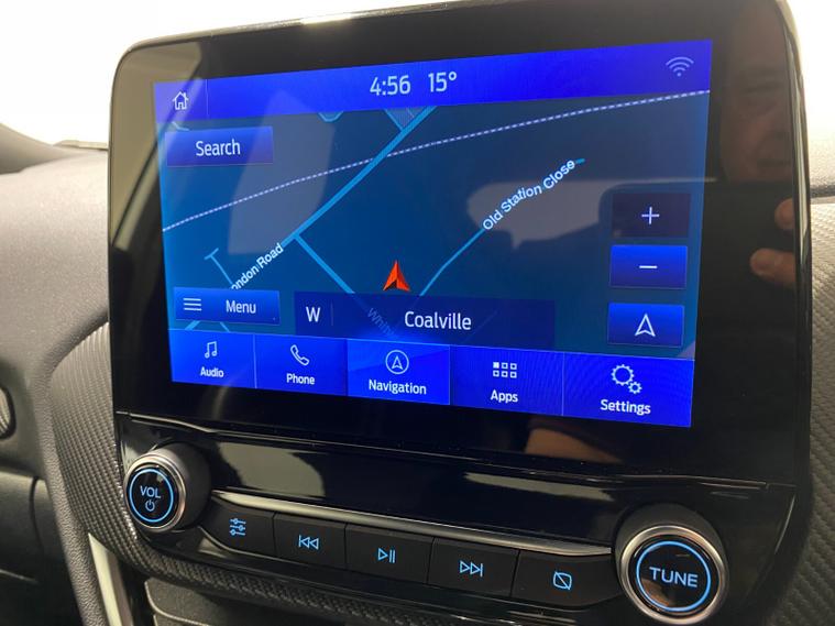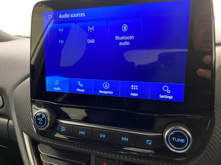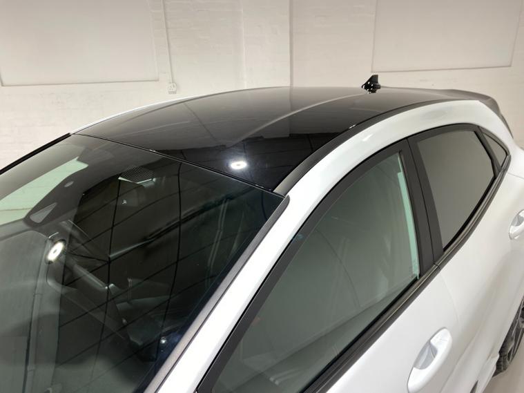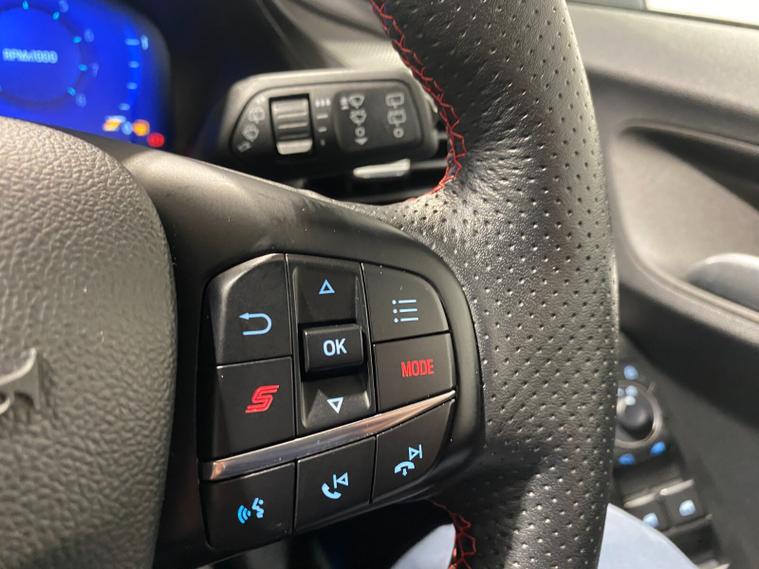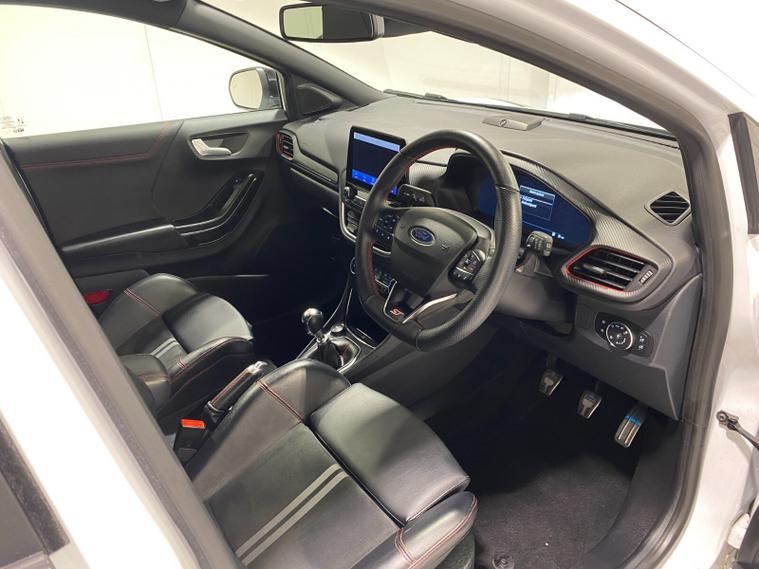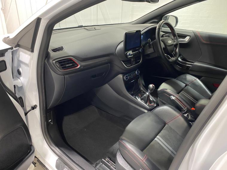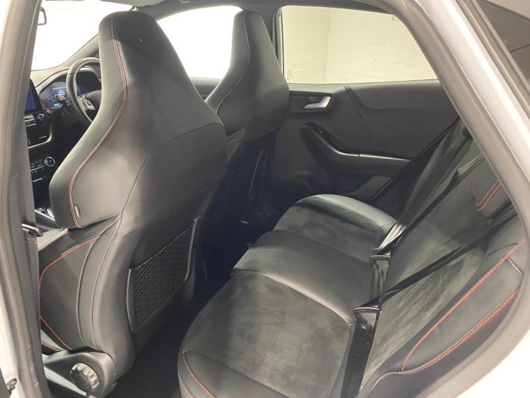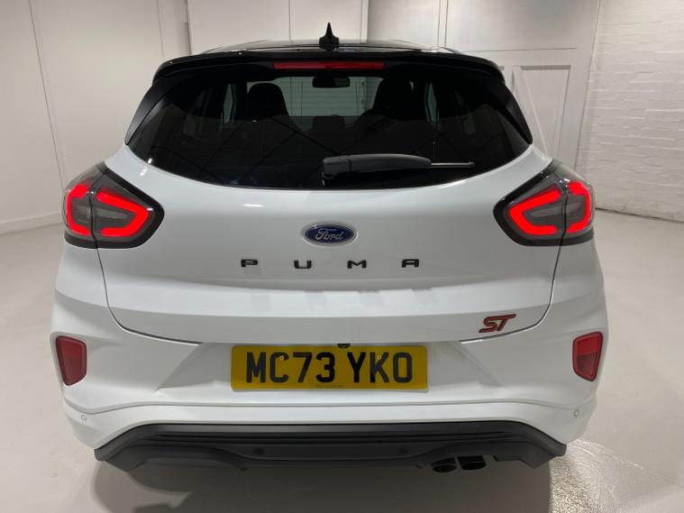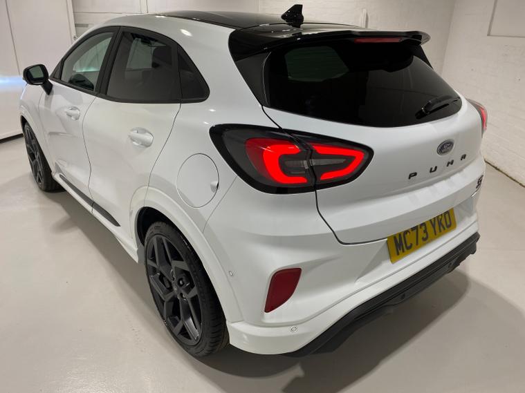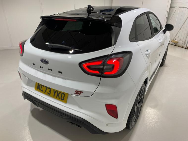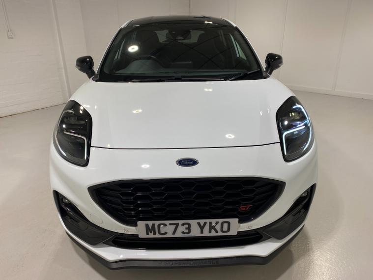 2023 73 Reg Ford Puma 1.5 EcoBoost (200PS) ST 6 spd 5dr. Frozen White with Ford Performance Part LEATHER/ALCANTARA interior, PERFORMANCE PACK with LAUNCH CONTROL, SHIFT INDICATOR and MECHANICLA LIMITED SLIP DIFFERENTIAL, DRIVERS ASSISTANCE PACK with BLIND SPOT INFORMATION with CROSS TRAFFIC ALERT, Pre COLLISION ASSIST, ACTIVE PARK ASSIST and REAR CAMERA, HANDSFREE TAILGATE, BLACK PAINTED ROOF, 19 inch alloy wheels, ST BODY KIT with LARGE REAR SPOILER, SYNC 3 DAB SATELLITE NAVIGATION, B&O sound system, LED headlights, selectable drive modes- Normal, Eco, Sport, Slippery & Trail, drivers & passenger seat lumbar & heights adjust, FORD MEGABOX EXTENDED BOOT SPACE, EATC AIR CON, KEYLESS entry and start with FORD power start button, PRIVACY GLASS, power folding door mirrors, Drivers Assistance features to include traffic sign recognition, auto high beam & driver alert, auto light and rain sensing wipers, centre console with arm rest, tyre pressure monitoring system, Thatcham alarm, NCAP Pack (lane-keeping alert & lane-keeping aid, speed limiter, rear seat belt minder, rear centre head restraint & auto-headlamps), front fog lamps with cornering lights, heated front screen, remote central locking, electric front windows, ESP, Hill start assist, trip computer, ambient lighting, 34, 314 miles (MC 73 YKO).