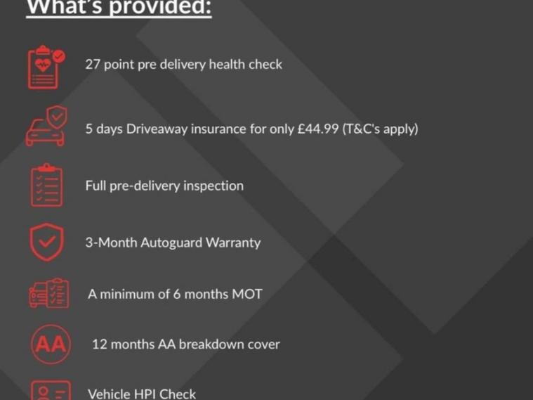 Every vehicle we sell comes with our Customer Care Pack for just £99, giving you extra peace of mind and great value. It includes a 27-point health check, a full pre-delivery inspection, a 3-month In-house warranty, and at least 6 months MOT. You’ll also get 12 months complimentary AA breakdown cover, a full HPI vehicle check, your online V5C logbook, and help with arranging your vehicle tax—so you’re all set from day one.