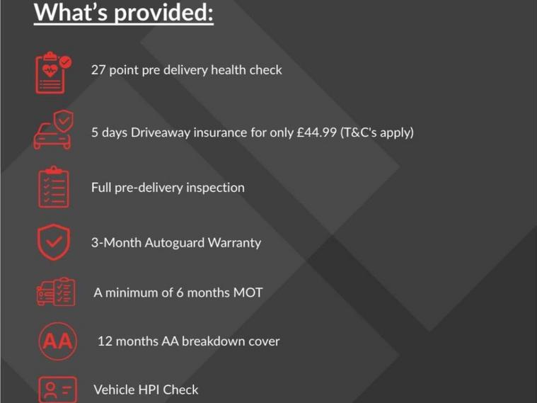 Every vehicle we sell comes with our Customer Care Pack for just £99, giving you extra peace of mind and great value. It includes a 27-point health check, a full pre-delivery inspection, a 3-month In-house warranty, and at least 6 months MOT. You’ll also get 12 months complimentary AA breakdown cover, a full HPI vehicle check, your online V5C logbook, and help with arranging your vehicle tax—so you’re all set from day one.