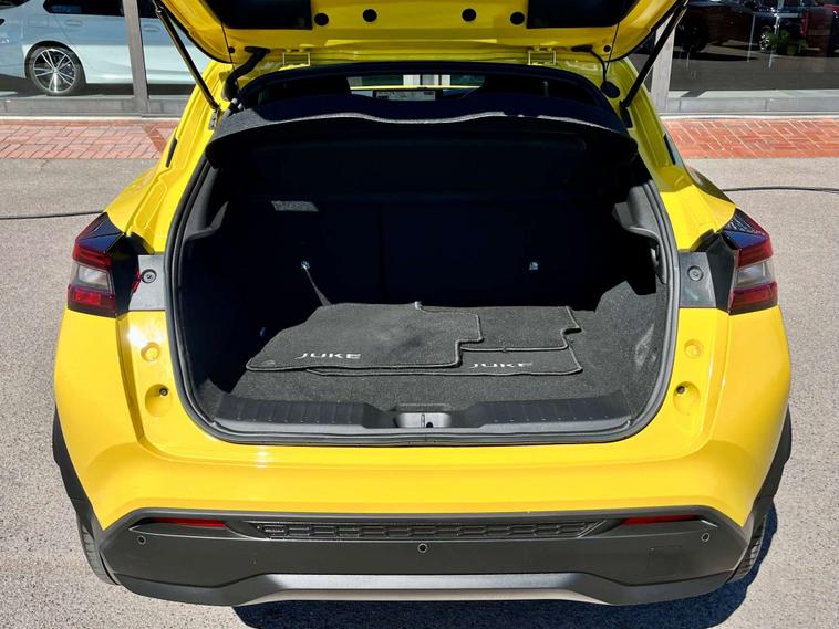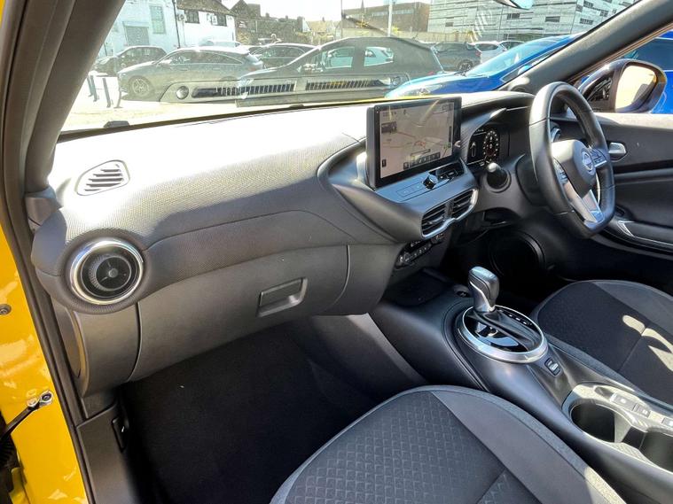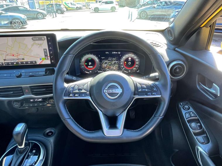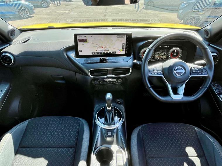 The Nissan Juke comes with a sleek Cloth and Syntech Leather interior in Black, offering both comfort and style. The hybrid engine ensures a smooth and economical drive, perfect for city commutes or long journeys.
