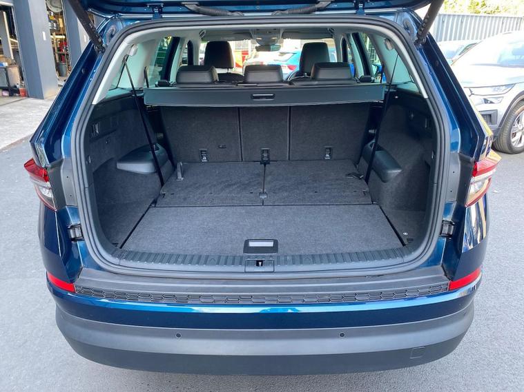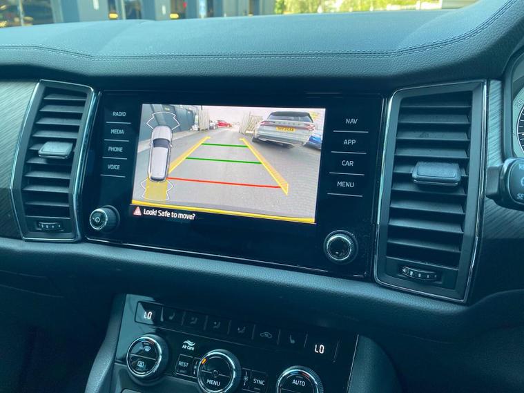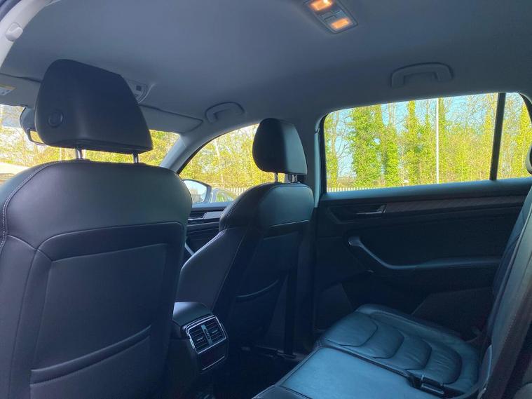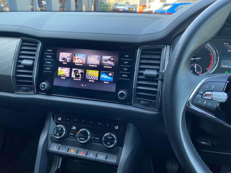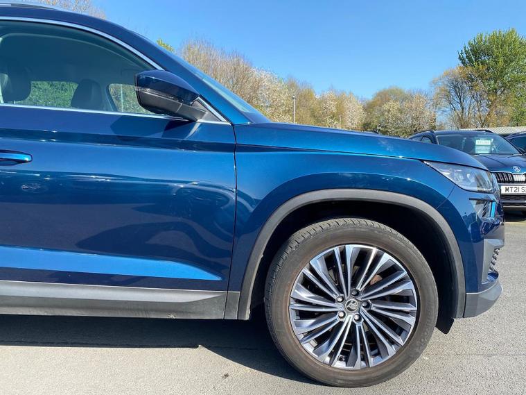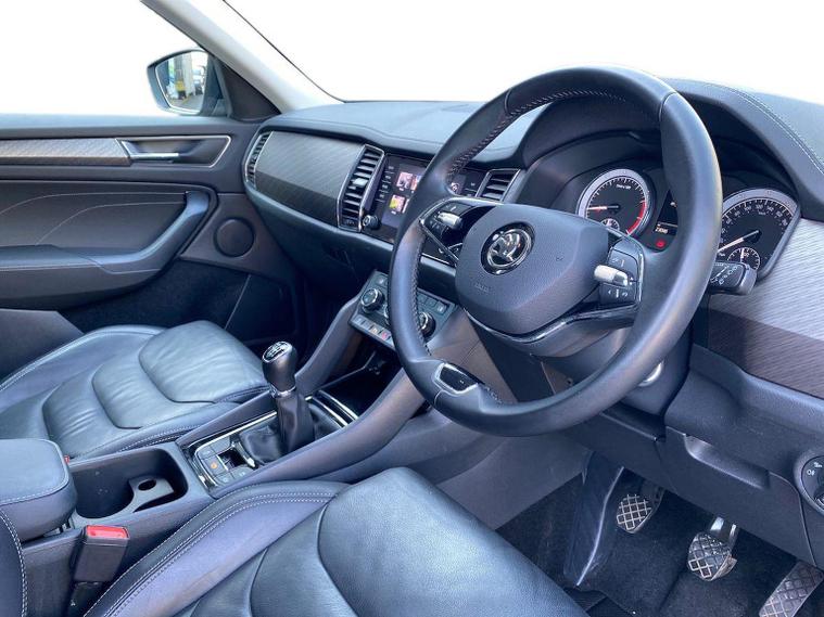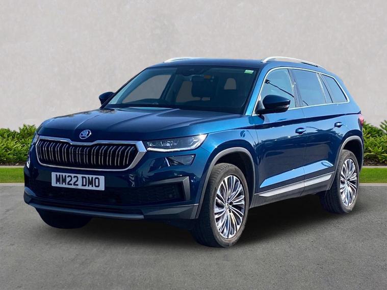 This Skoda Kodiaq SE L Executive 1.5 TSI manual in Petrol Blue Metallic features 19" Cursa anthracite alloy wheels, full black leather upholstery, electrically adjustable driver’s seat with memory and power lumbar support, Amundsen satellite navigation with Wi-Fi, rear-view camera, front and rear parking sensors, cruise control, drive mode selection, light and rain sensors, and an auto-dimming rear-view mirror. Exterior highlights include full LED Matrix headlights with adaptive front light system and dynamic rear indicators, heated folding auto-dimming door mirrors with memory and boarding spots, privacy glass, chrome grille and window surrounds, chrome roof rails and an electrically operated boot. Inside it offers dual-zone climate control, heated front seats, leather multifunction steering wheel, digital multifunction display, illuminated and cooled glovebox, sliding and folding rear seats, variable boot floor, drawer under the front passenger seat and ISOFIX rear seating. We offer in-person appointments, personalised video walk-arounds, flexible test-drive availability, and a full range of finance options to support your purchase.