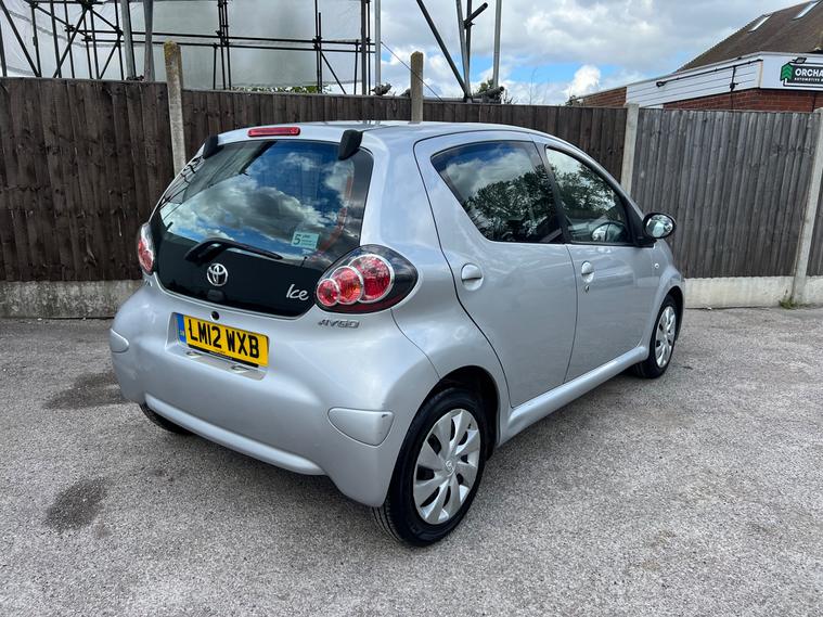 All vehicles will have a new MOT and service upon sale.This 2012 Toyota Aygo 1.0 VVT-i Ice Hatchback with only 67928 miles on the clock is a great option for those seeking a reliable and efficient vehicle. Running on petrol and with an MOT that expires on 27/10/2026, this 5-door hatchback offers plenty of versatility and convenience. With 4 seats, it's ideal for small families or commuters, and being ULEZ compliant means you can drive in urban areas without worrying about emissions charges. The AYGO Xtra Protected Ice Pack ensures added peace of mind, while features like VSC - Vehicle Stability Control, 14in Steel Wheels, and Electric Windows in the front make for a comfortable and safe driving experience. With ABS - Anti Lock Braking System, this car has everything you need for a smooth and secure ride.We are an AA and trading standards approved dealer - You're in Safe Hands. As an AA partner, we offer 5 day drive away insurance, 1 year breakdown cover and a FREE 3 month warranty, ensuring that you have added protection and support and finally the AA dealer promise free of charge! To provide you with complete peace of mind, this vehicle has successfully passed a multi-point inspection. To secure this car exclusively for you, simply reserve it online or over the phone with a Fully refundable deposit of £99. Test drives on all cars are available. Why not try out our video viewing service? We provide an online video call for customers who are a distance away, to view the vehicle as if they were actually there! Our goal is to provide you with a hassle-free and transparent buying experience. Call now to secure your new car.
