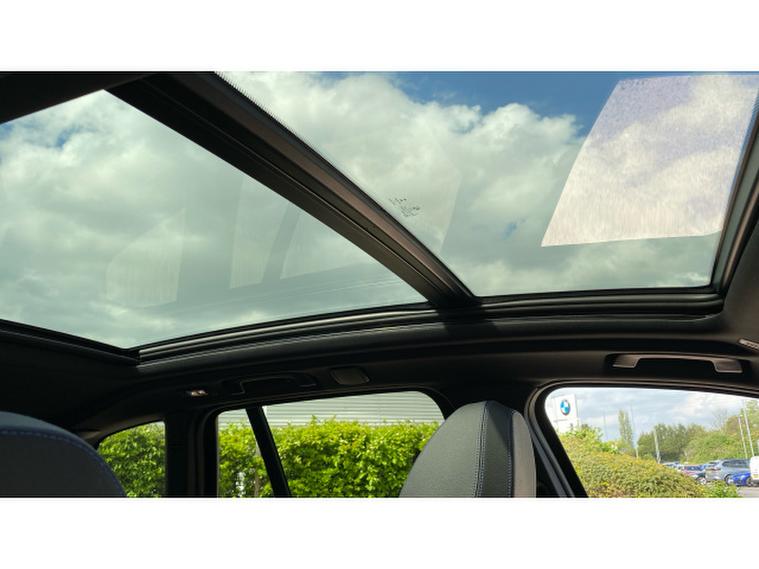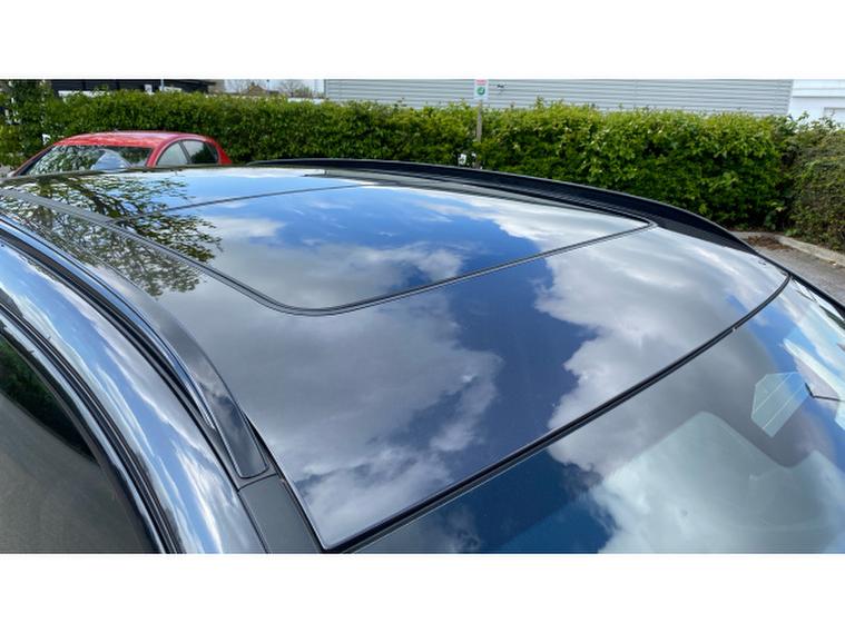 Step inside and you're welcomed by a refined interior featuring black seats with striking blue stitching, blending comfort with a modern, sporty feel. The panoramic glass sunroof floods the cabin with natural light, creating an open and airy atmosphere for every journey.