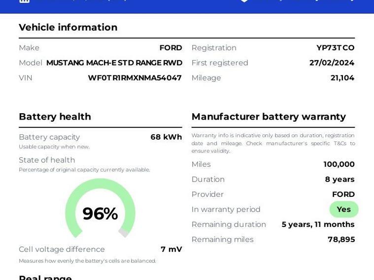 GRADE A BATTERY HEALTH This 2024 Ford Mustang Mach E is a superb example, having had only one owner from new and boasting a clear vehicle history check. As a Standard Range electric model, it features a 76 kWh battery offering a maximum range of 273 miles. Charging at home with a 7kW charger takes approximately 11 hours and 24 minutes, while rapid public charging can replenish the battery from empty to 80% in just 43 minutes. Experience the responsive performance of this Mustang Mach E, with its impressive 0 to 60 mph acceleration achieved in a swift 6.9 seconds. This capability, combined with its electric powertrain and substantial range, positions it favourably against other vehicles in its class, offering an efficient and engaging driving experience. Why Buy From Nuneaton Car Sales? Multi Award-Winning Dealership AA Approved Dealer NO ADMIN FEES 12 Months AA Breakdown Cover Multi-Point Vehicle Inspection Free MOT if due within 6 months Competitive Finance Available Part Exchange Welcome Click & Collect & Home Delivery Available Same Day Drive Away on most vehicles Extra Peace of Mind Personalised walk-around videos available on request. All vehicles professionally prepared and valeted prior to sale. This vehicle is price-checked daily against the UK market to ensure excellent value. Every effort is made to ensure vehicle information is accurate. Specification data may be supplied by a third-party source. If a particular feature is important to your purchase decision, please contact our sales team who will be happy to confirm.