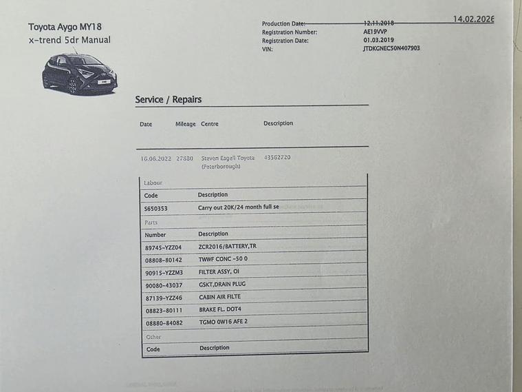 This 2019 Toyota AYGO VVT-i x-trend boasts an MOT valid until February 2027, offering you peace of mind for years to come. This stylish hatchback is powered by an efficient 1.0L Petrol Engine, meeting Euro 6 emissions standards. Its vehicle history check is clear, confirming its sound provenance. Inside, youll find a wealth of modern features designed for convenience and connectivity, including a 7in x-touch Multimedia System with Bluetooth connectivity, allowing seamless integration with your smartphone via Apple CarPlay and Android Auto. The cabin also benefits from Automatic Air Conditioning, ensuring a comfortable environment whatever the weather, and Auto Headlights that adjust automatically. The AYGO x-trend is designed to be economical to run, with an impressive fuel economy of 57 mpg. This, combined with its low CO2 emissions and low insurance group, means it offers a more cost effective ownership experience compared to many other vehicles in its class. These highlights demonstrate how this particular AYGO provides excellent value and efficiency for everyday driving.