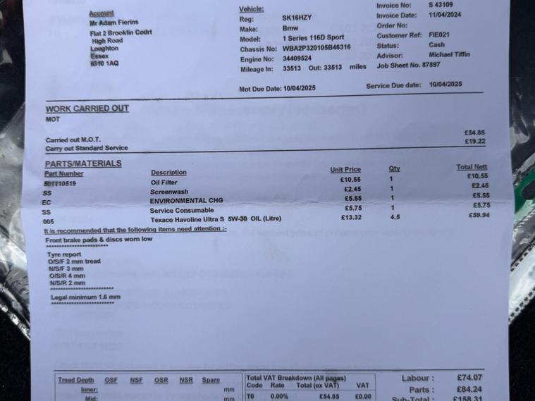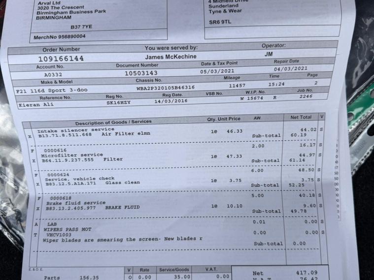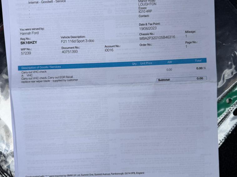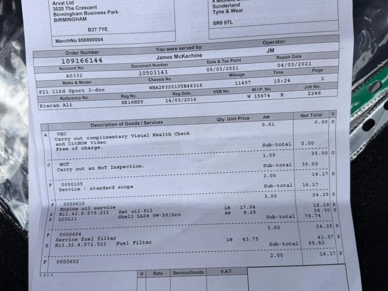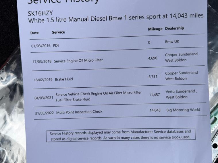 **BMW 1 Series 1.5 116d Sport Euro 6 (s/s) 3dr****Registration:** SK16HZY**Year:** 2016 (16)**Mileage:** 46, 980 miles**Fuel:** Diesel**Transmission:** Manual**Colour:** White**Owners:** 2 Owners**ULEZ:** Compliant**Price:** £8, 750---### **Vehicle details:**• Only 46, 980 miles – exceptionally low mileage• 2 owners from new• Partial service history• Last serviced on 11/04/2025 at 40, 134 miles• 12 months MOT provided on purchase• Euro 6 – ULEZ compliant• Clear vehicle history check• Highly economical 1.5L diesel engine• Excellent fuel economy – up to 72 MPG• Low CO₂ emissions• **3 MONTHS AA WARRANTY AND 12 MONTHS AA BREAKDOWN COVER**---### **Features and equipment:**• Sport specification• 18'' Light Double Spoke alloy wheels (Style 385)• Media Package BMW Professional• Enhanced Bluetooth with USB audio interface• Speed Limit Display• DAB radio• Multifunction steering wheel• Climate control• Electric windows• Electric mirrors• Remote central locking---### **Why this car?**A **low mileage BMW 1 Series Sport** offering **premium quality, strong fuel economy and a sporty drive**. With its **great specification and excellent efficiency**, this car is ideal for both city driving and long motorway journeys.---**WE DO PART EXCHANGE****WE ALSO BUY CARS – BEST QUOTATIONS OFFERED****For more available cars:* dealer's website / Call:** 01223964083**Location:** CB24 9LQ.