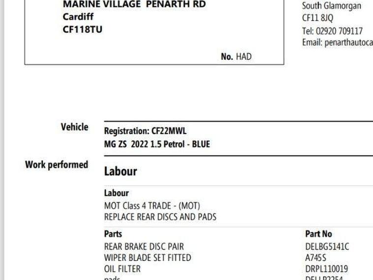 Has a fresh mot, fresh pads and discs plus a fresh mot, ready to drive away.MG MG ZS 1.5 VTi-TECH Exclusive Euro 6 (s/s) 5dr, two keys , ready to drive away This 2022 MG ZS VTi-TECH Exclusive boasts a full service history and has only had one owner from new. This Euro 6 compliant 1.5L petrol engine vehicle comes with a clear vehicle history check and benefits from a 24 month warranty, alongside 12 months MOT provided on purchase. Its last service was completed at 38, 200 miles on 22nd April 2026. Notable features include Android Auto and Apple CarPlay for seamless smartphone integration, Bi-Function LED headlights for enhanced visibility, Blind Spot Monitoring for added safety, and a 360 degree parking camera to assist with manoeuvring...................................................................The MG ZS VTi-TECH Exclusive offers a compelling package, indicated by its low insurance group, making it a cost effective choice. The comprehensive service history and single owner status suggest a well maintained vehicle, further enhanced by the included warranty and MOT. The advanced technology, such as the parking camera and blind spot monitoring, provides a superior driving experience compared to many other vehicles in its class...................................................................HPI CLEAR NEVER BEEN INVOLVED IN ANY ACCIDENTS TO BODYWORK. This vehicle meets the ULEZ emissions standards.The vehicle is kept In our brand new showroom on Penarth Rd, Cardiff CF11 8TU, so please call to arrange viewings.Full V5 documentation..