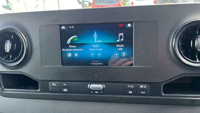 Bluetooth connectivity, Comfort overhead control panel, Communication module (LTE) for digital services, Cruise control, Outside temperature gauge, PAS, Prewiring for parameterizable special module (PSM), Rev counter, Speedometer, Terminal strip for electrical connection, Trip computer, Wifi hotspot, Additional USB-C socket, Apple Carplay/Android Auto, Digital radio (DAB), 270 degree double rear wing doors opening to side wall, Adaptive brake lights, Electric front windows, Entrance handle on right rear corner pillar, Headlight assistant, Heat insulated windscreen with filter band, Lights for left hand traffic, Longitudinal member reinforcement, Side marker lights, Third rear brake light, Door operated interior courtesy light, Driver's armrest, Grab handle at load compartment sliding door partition, Height and reach adjustable steering wheel, Hinged cover for centre storage compartment, Hydraulic Jack, Multi function steering wheel, Pre-installation for switch panel, Attention assist, Breakdown management, Crosswind assist, Driver's airbag, Mercedes-Benz emergency call system, Seat belt reminder for co-driver seat, Seat belt warning for driver's seat, Anti-theft alarm system, Double locking, Keyless start, VIN visible from outside, ABS, Active brake assist, Adaptive ESP, ASR traction control, EBD, Eco gear 360 6 speed manual transmission, ECO Start/stop function, Fuel filter with water separator, Hill start assist, Jump start contact, Particulate filter (DPF), Full size spare wheel, Full wheel covers, Resistance-optimised tyres, Spare wheel bracket below frame end,