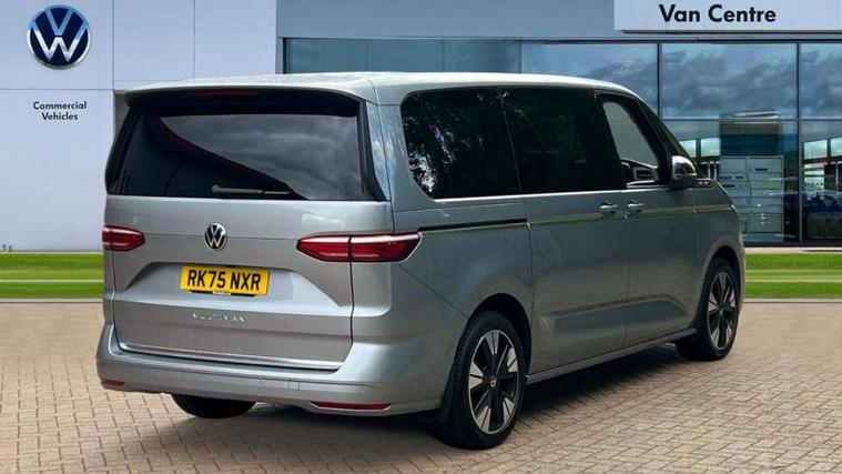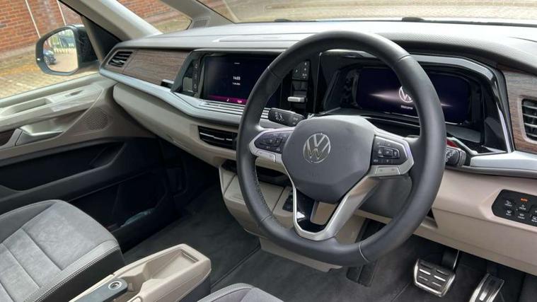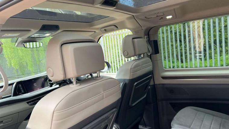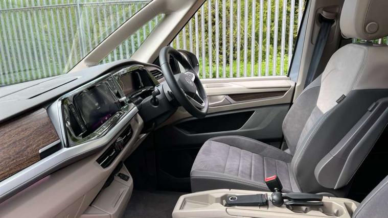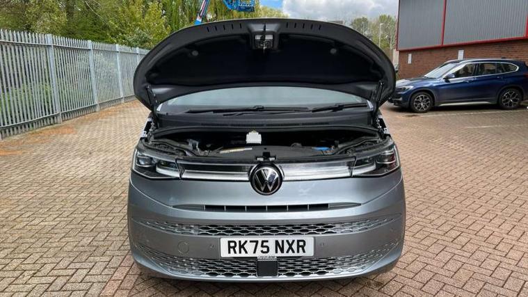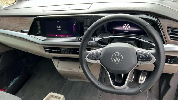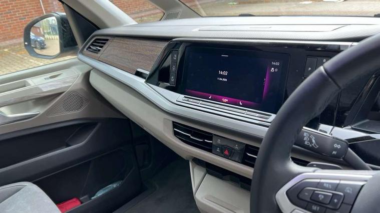 Adaptive cruise control with C2X including front assist and city emergency braking system, Digital Cockpit Pro with 10.25" colour display with adaptable display includes navigation map display, telephone contact images and audio information, Discover media pro navi system with 10" colour touch incl DAB+radio/appconnect for apple carplay/android auto/streaming and internet/gesture control, Driver alert system, Dynamic road sign display, eCall emergency system, Electrically-operated tailgate opening and closing function (Easy open), operated via foot movement under rear tailgate, Emergency assist, Front Cross Traffic Alert, Lane change system with side assist including blind spot monitor, rear traffic alert and exit warning system, Lane keeping system Lane Assist, Mobile phone interface, PAS, Semi-automated driving assistance, Tailgate, Travel assist, Voice control system including Alexa web app, We connect preparation, Electronic differential lock, 2 USB-C ports in front and 4 USB-C ports in passenger compartment, Additional interior noise reduction measures, Advanced high beam control dynamic light assist for LED matrix headlamps, Automatic headlight control with welcome home lights, Body coloured exterior door handles, Break away auto dimming rear view interior mirror, Chrome trim decorative strip mid-way on side and rear, Dynamic headlight range control with dynamic cornering light, Electrically adjustable, heated and folding door mirrors, Front fog lights, Glossy black painted radiator grille with 2 illuminated chrome trims, Heated rear window with window wiper and washer system, Heated windscreen, High gloss black exterior mirror housing, IQ.Light LED matrix headlamps with LED separate daytime running light, Laminated safety glass windshield, heat and sound insulating, LED 3rd brake lamp, LED rear combination lamps, Rear wiper, Stainless steel tailgate trim, Surround lighting in door area and tailgate with logo projection in door area, Windshield wiper intermittent control with rain sensor, 1 x 12V sockets on the dash panel, 12V socket in passenger compartment, 3 seat bench in 3rd row, 30 colours ambient interior lighting and tailgate surround lighting, 7 single seats removable/movable, Carpet mats in cab, Climatronic 3 zone air conditioning with additional control panel in passenger compartment, Front and rear head restraints, Grab handles on A pillar for access, on driver and front passenger side, Height adjustable seats, Height and longitudinal adjustment steering wheel with gear shift paddles, Illumination lockable glovebox compartment, ISOFIX (including i-size) and top tether in all seats in 2nd and 3rd rows, LED luggage compartment lighting X 2, Load compartment partition to 20kg with bag hooks and luggage net, Luggage compartment lid power latching with unlatching from inside, Multifunction leather steering wheel with tiptronic, Reinforced carpet floor covering in passenger compartment, Removable armrests for front seats with power adjustable lumbar support and folding table for 2nd row passenger seats, Removable armrests in 2nd row passenger seats, Single front passenger seat, Slidable multifunction table/centre console with 3 cup holders, Stainless steel pedals, Storage compartment under the 2nd and 3rd row seat and two waste bins, Sun visors with illuminated vanity mirror, ticket holder on driver side with airbag warning label on sunvisor and B-pillar, Easy open package - Multivan, 3x3 point rear seat belts, ABS, Automatic post collision braking system, Autonomous emergency braking front assist with pedestrian and cyclist monitoring, Driver and front passenger airbag with front passenger airbag deactivation, Electric childproof lock, Electronic stability control (ESC) and Electromechanical brake booster, ESP, First aid kit with warning triangle and safety vest, Front disc brakes, Hill hold assist, Seat belt warning for the drivers and all passengers seats if unfastened, Side and curtain airbags for driver and front passenger, curtain airbags for outer seats in rear, centre airbag in front, Single tone horn, Traction control, Tyre pressure monitoring system, Anti theft alarm system with interior monitoring in cab, backup horn and towing protection, Central locking system with interior control and safe lock, Keyless advanced with keyless entry, Start/stop button on centre console, Dark woodgrain optic decorative inserts,