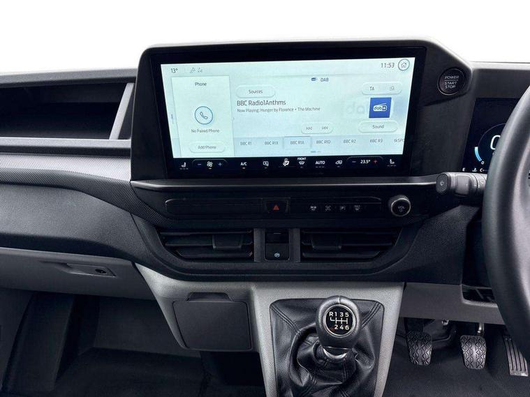 13" Touchscreen, 5G embedded modem, AECS NO SMS/Roll Detect 2G, PAS, Tyre pressure monitor, SYNC 4 - Android Auto/Apple Car Play, advance speech recognition, over the air update capability, Automatic headlights, Automatic windscreen wipers, Daytime running lights, Electric front windows with one touch facility for driver and front passenger, Front mud flaps, Front splash guards, Gloss black door mirrors, Low roof line, Part body colour front bumper, Quickclear front window defroster, Rear cargo hinged door, Rear splash guards, Trailer sway control, 6 Load compartment tie down loops, Courtesy light, Interior grab handle with driver's sunglasses holder, LED lights, Locking glove box lid, Sensico gearshift knob, Passenger airbag, 2 remote keys, Alcohol Interlock wiring preparation pack, Locking wheel lug nut, Thatcham category 1 alarm, 20L AdBlue tank, ABS, Diesel particulate filter, ESP, Hill launch assist, Limited Slip front axle - mLSD, Traction control, 16" Steel spare wheel, Full wheelcovers,