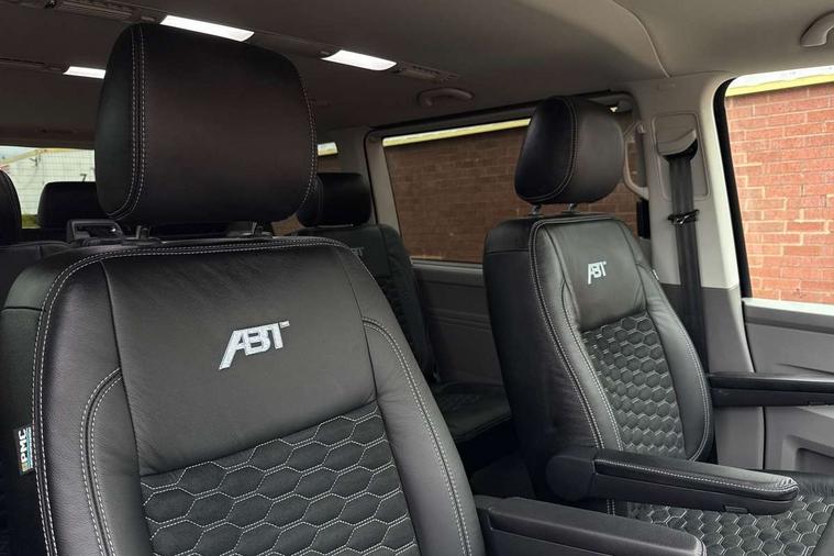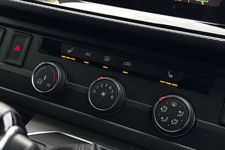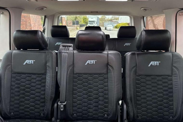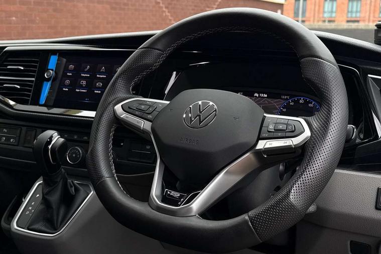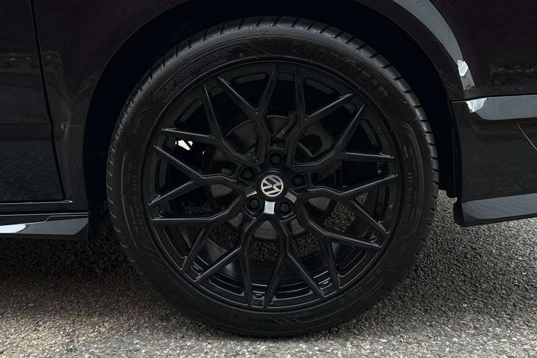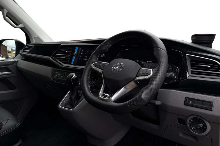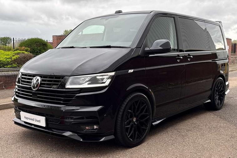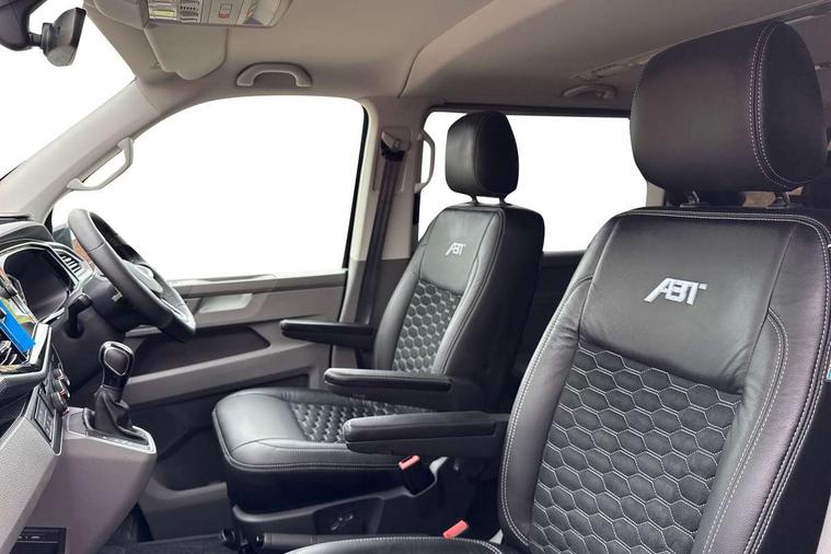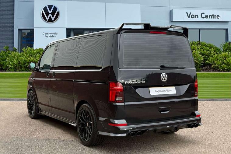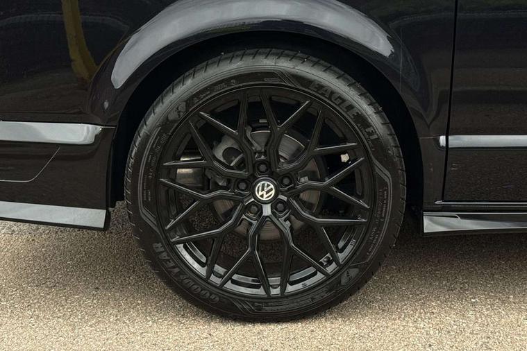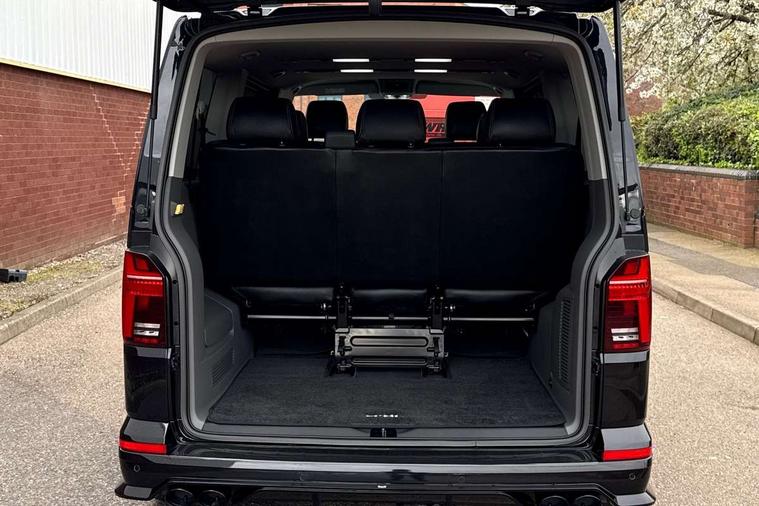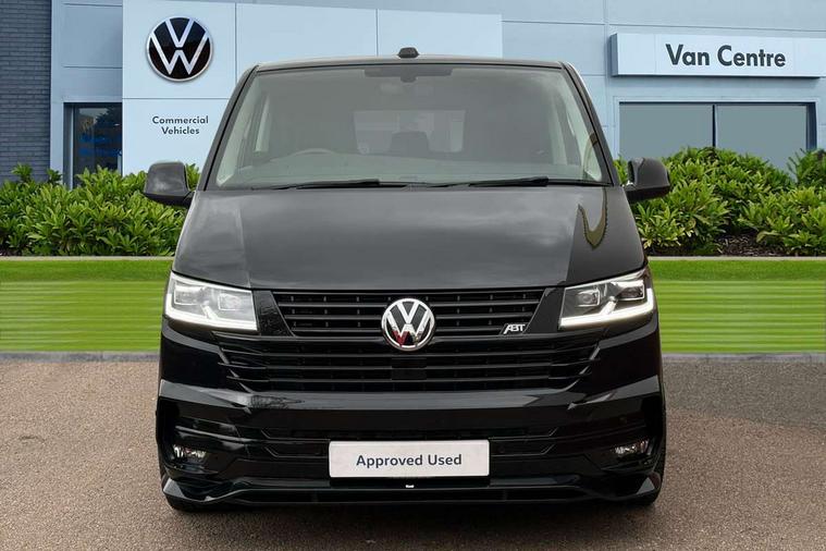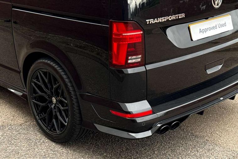 Adaptive cruise control including speed limiter and city emergency braking, Cross wind assist, Dimmable instrument illumination, eCall emergency system, Front assist with autonomous emergency braking, Headlight range control, Mobile phone interface, 2 USB interfaces type C in dashboard, 6 speakers with 2 tweeters, 2 woofers and 2 full range speakers, Composition colour radio with 6.5" touchscreen, Digital radio reception (DAB+), Volkswagen app connect, Additional dust seals on outside, Black painted radiator grille with 5 chrome trims, Body colour bumpers, Body coloured exterior mirror housings and door handles, Electric windows front + rear, Illuminated steps in passenger/load compartment, Left convex exterior mirror, Rear window with heat insulating glass, heated, rear window wiper and washer system, Red LED rear combination lamps, Right convex exterior mirror, Sliding door on the left in load/passenger compartment, Sliding door on the right in load/passenger compartment, Standard roof with 8 feet mounting points for roof rack system, Transporter nameplate on the rear fender, 2 12V outlets in dashboard, 3 spoke leather wrapped multi function steering wheel, Air cleaner, Comfort headliner in cab and headliner for recirculated air with vents in passenger compartment, Driver and passenger grab handles on A pillars, Dust/pollen filter, Glove compartment with illumination, Interior lighting with LED technology in load/passenger compartment, Interior plastic loading edge protection, Lashing rings for load restraint system, Lumbar supports for left and right single seat in the 1st row of seats (both manually adjustable), Refrigerant R1234yf, Soft folding grab handles on roof frame, Special interior noise suppression measures, Special sound deadening measures in cab and passenger compartment, Standard lower part dashboard in palladium, Sun visors with mirror, illuminated and airbag label on front passenger sun visor, Sunshades for side windows in passenger compartment, Tool kit and heavy duty jack, Vents for side windows in headliner, Lights and Vision package, Non smoker pack, Without storage package - Shuttle, 3 point seat belts, height adjustable on outer seats in cab with electric pretensioners, Driver and front passenger airbag with front passenger airbag deactivation, Driver and front passenger curtain airbags, Power operated child safety lock, Single tone horn, Warning buzzer and light for driver seat belt not fastened, Anti-theft alarm system with interior monitoring, backup horn and towing protection, Central locking system with radio remote control, inside system controls and safelock, 16" chassis with 16" brake system, Diesel particulate filter, Electronic Stability Control, ABS, ASR with deactivation button, eletronic differential lock and brake assist system, Hill start assist, Initial standard fuel filling, Start and stop system with regenerative braking, Traction control, 17" Devonport alloy wheels, Wheel center cover,