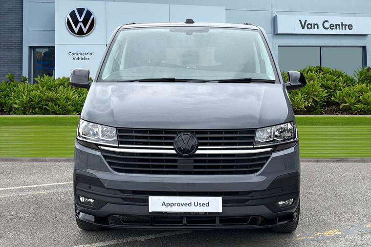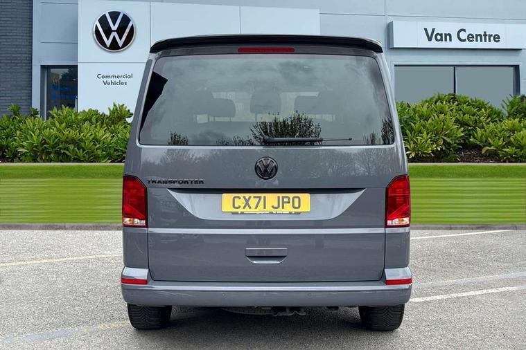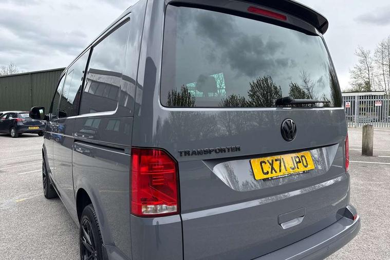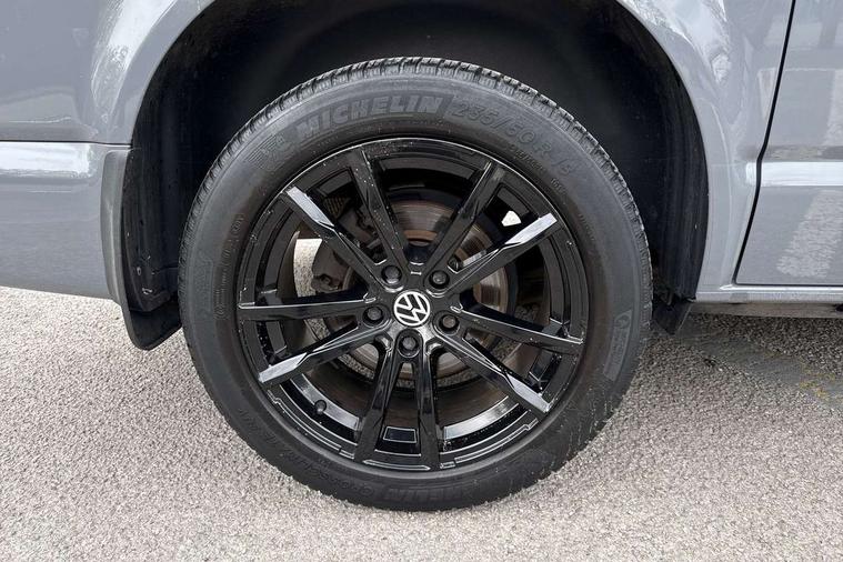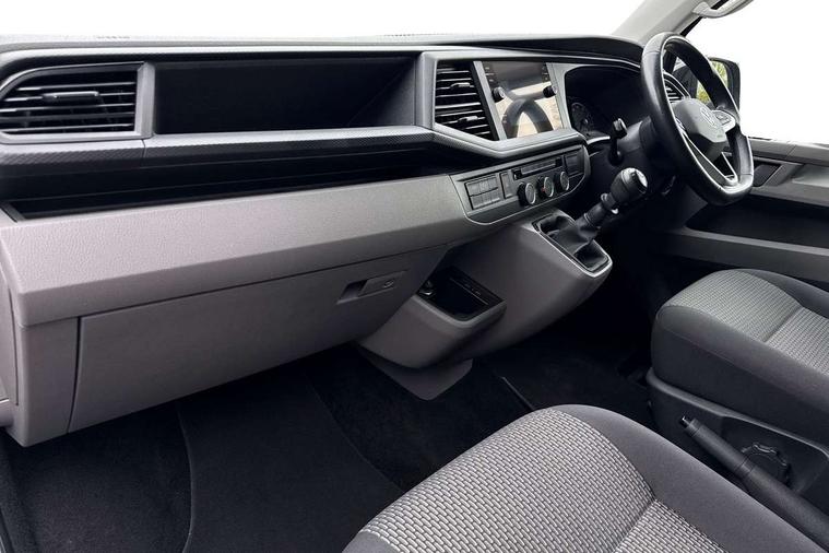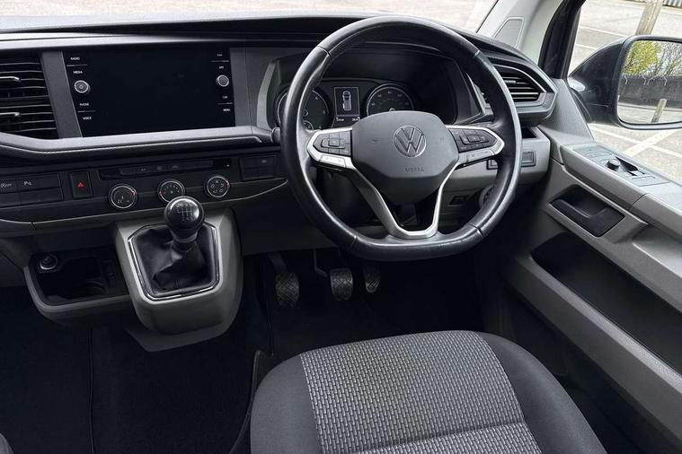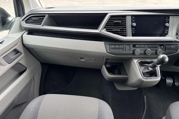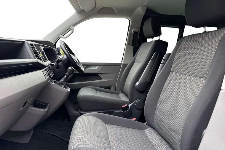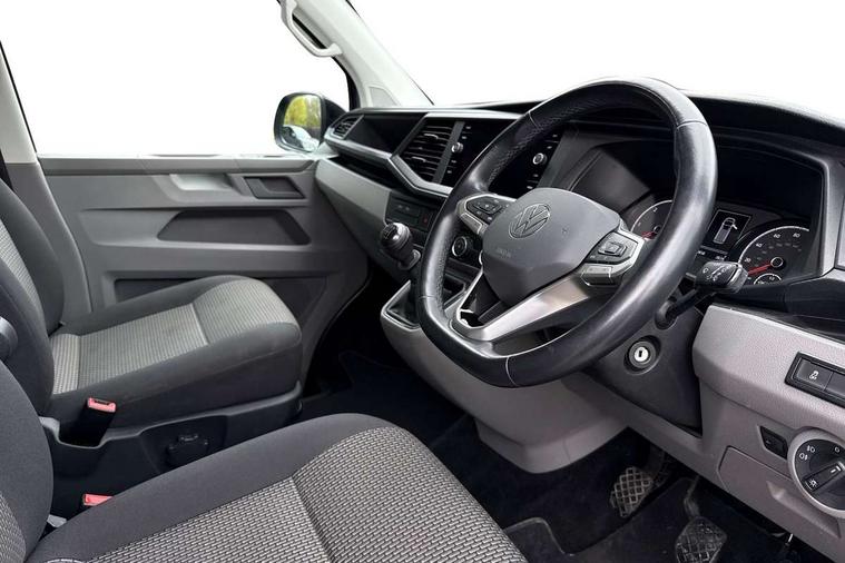 Adaptive cruise control, Child seat anchors ISOFIX and top tether in 2nd row of seats, Cross wind assist, Dimmable illuminated instruments, Driver alert with black and white multi function display plus, eCall emergency system, Electromechanical speed sensitive power steering, height and longitudinally adjustable steering column, Forward collision warning front assist with autonomous emergency braking, Headlight range control, Mobile phone interface, Without voice control, 2 USB interfaces type C in dashboard, 4 speakers with 2 tweeters and 2 woofers, Composition colour radio with 6.5" touchscreen, Digital radio reception (DAB+), Volkswagen app connect, Automatic headlight control, leaving home and manual coming home feature, Front fog lamps with cornering light, Green heat insulating glass, Heated front windscreen, Illuminated steps in passenger/load compartment, Left convex exterior mirror, Power adjustable and heated exterior mirrors, Power folding door mirrors, Privacy glass in passenger compartment, Radiator grille with 2 chrome trims, Rear window with heated insulating glass, heated rear window wiper and washer system, Right convex exterior mirror, Tailgate closing with unlatching from the inside, Tailgate with window aperture, Transporter nameplate on the rear fender, Windshield wiper intermittent control with rain sensor for windshield wipers, Without adhesive film, 3 spoke leather wrapped multi function steering wheel, Additional sound deadening measures in cab and passenger compartment, Auto dimming breakaway interior rear view mirror, Comfort headliner in cab, hardboard roof trim in passenger and load compartment, Dust/pollen filter, Folding grab handles and storage compartments on cab seats, reading light, Front seats on the right in 1st row of seat, Glove compartment with illumination, Heavy duty tool kit and jack, Interior plastic loading edge protection, Lashing rings for load restraint system, LED Interior lighting in load and passenger compartment, Medium height for vehicles with window aperture hardboard side trim panels in passenger/load compartment, Refrigerant R134a, Rubber floor covering in cab, Rubber floor covering in passenger/load compartment with loading edge protection in rear, Standard lower part dashboard in palladium, Without partition, Without seats in 3rd row of seats, Exterior pack without fog light- Transporter, Non smoker pack - Transporter, 3 point height adjustable seat belts on outer seats cab with electric pretensioners, Driver and front passenger airbag with front passenger airbag deactivation, Power operated child safety lock, Single tone horn, Warning buzzer and light for driver seat belt not fastened, Anti theft alarm system with interior monitoring in cab, backup horn and towing protection, Lockable wheel bolts, 16" chassis with 16" brake system, 70 L volume fuel tank, Additional 12V socket, Diesel particulate filter, Electronic stability control, ABS, ASR with deactivation button, hill start assist and brake assist system, Speed limiter, Start/stop system with regenerative breaking, 17" Devonport silver alloy wheels, Wheel trims,