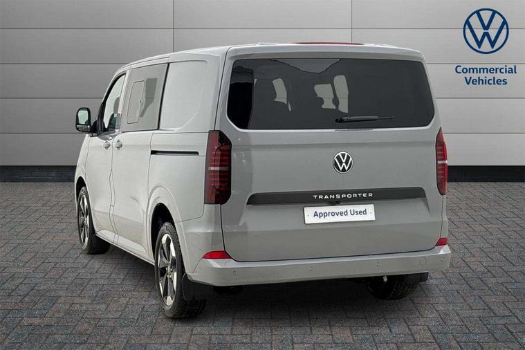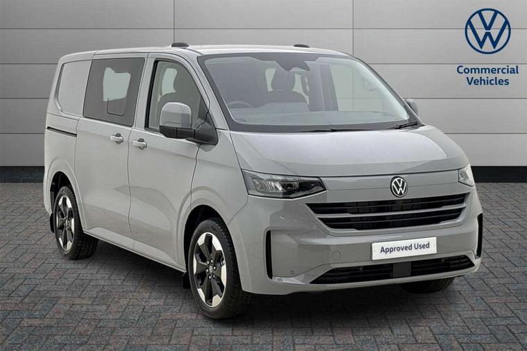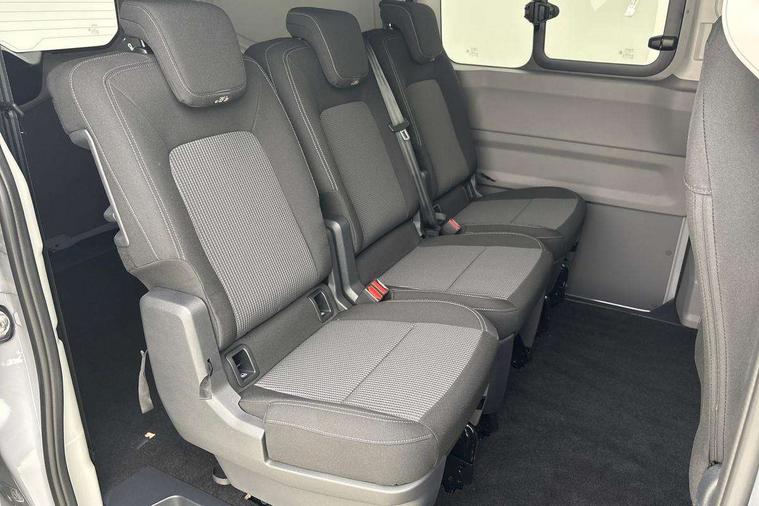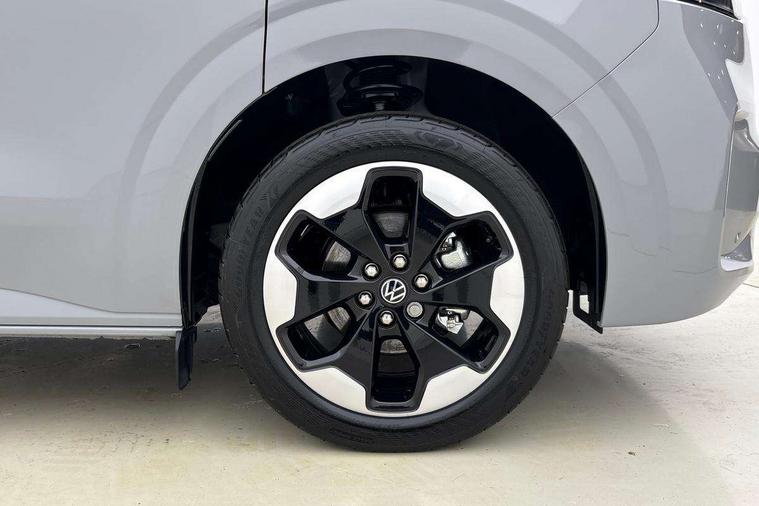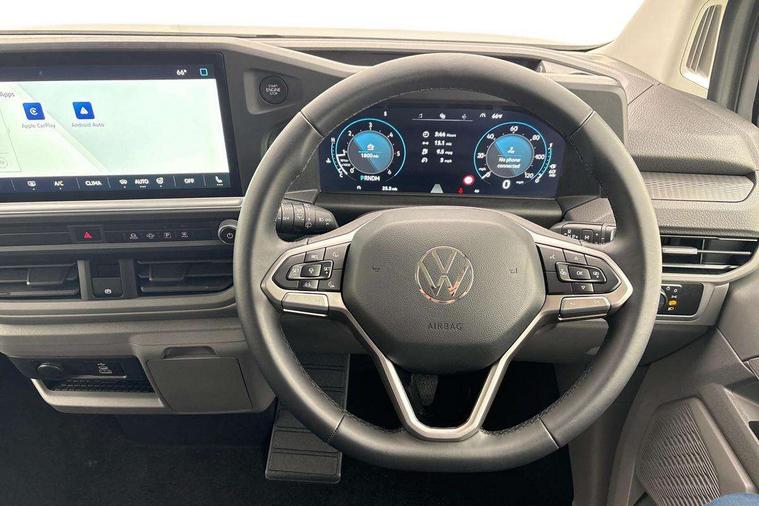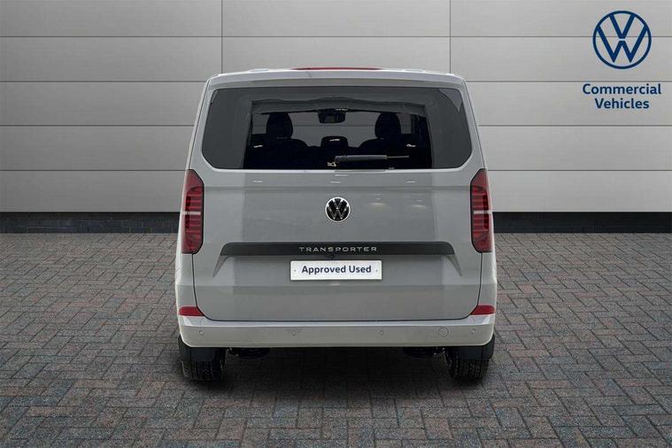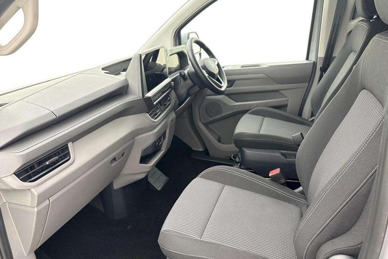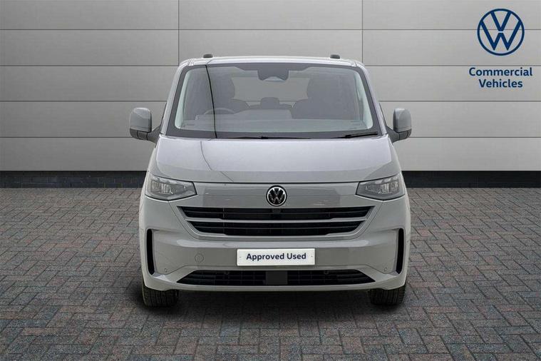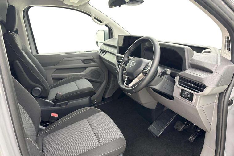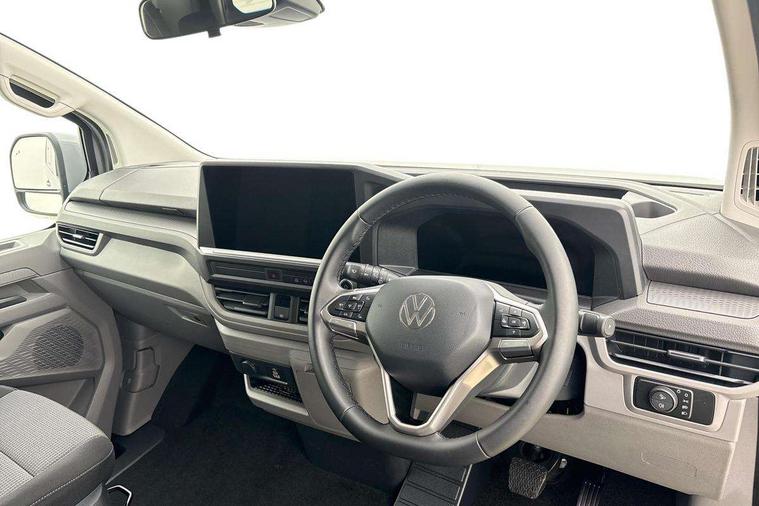 12" digital drivers display, 13" touchscreen infotainment display with wireless app connect and DAB radio, 5G Modem, Adaptive cruise control with predictive speed limiter and traffic jam assist, Dynamic road sign display, eCall emergency system, Front collision warning with braking, Identification label for N1 commercial vehicle registration, Lane assist with blind spot assist and exit warning system, PAS, Preparation of VW connect and connect plus, Wireless mobile phone charging, Wrong way driver warning, 6 speakers, Body colour bumpers front and rear, Body coloured add on parts, Body coloured door handles, Body coloured door mirrors, Body coloured radiator grille, Dual sliding doors with pop-out window vents (left and right) for 2nd row, Electrically heated, adjustable and folding door mirrors, Heat reflecting glass in front side windows, privacy glass in rear side windows and rear window, Heated rear window, Laminated windshield made of heat-reflecting glass, Mud flaps front and rear, Rear tailgate, Rear Transporter nameplate in black grained decorative trim, Rear window wiper with washer system, Sliding doors on driver and front passenger side, Vehicle opening configuration 1x 1st row of seats, 2x all doors, 12 pin terminal block, 12V outlet in centre console and 12V outlet on rear right D-pillar, 2 LED lights in roof of load compartment, 3 single seats in 2nd row, folding and tumbling, 2x isofix and top tether, 3x additional super bright LED lights in load compartment, 4 tie downs for securing goods in the passenger/load compartment, 4 way height and tilt adjustable head restraints, 7x USB in cab and 2x USB in passenger compartment, Black plastic scuff plate for sliding door in cargo, illuminated, Black plastic scuff plate in front without illumination, Covers in the bottom area of all side panels and doors in the load compartment, Dimming breakaway interior rear view mirror, Gear selector lever on steering wheel, Grab handle on A-pillar passenger side, Illuminated glove compartment with lockable lid, LED light units for cab and passenger compartment, Overhead storage compartment, Single driver and single passenger seat in cab, Striped fabric upholstery, Without bulkhead, Without floor covering in load compartment, Driver and front passenger airbag with front passenger airbag deactivation, Dual tone horn, Seat belt pretensioner for front seats, Side and curtain airbags in cab curtain airbags in passenger compartment, Anti theft alarm system with interior monitoring in cab, backup horn and towing protection, Anti-theft wheel bolts, Central locking, Preparation for alcohol ignition interlock, 5+ Promise, Alternator - 230A, Electromechanical brake booster, Electronic Stability Control (ESC),