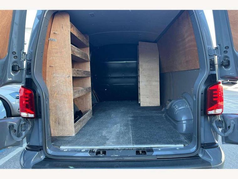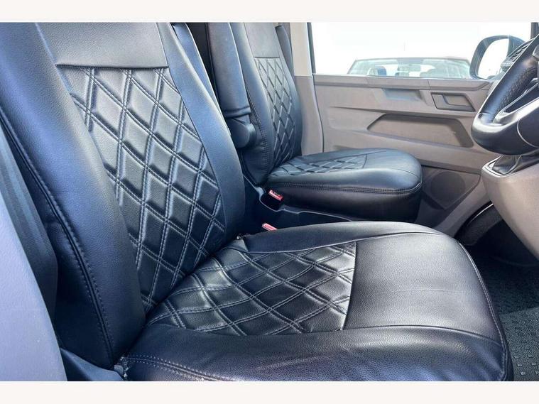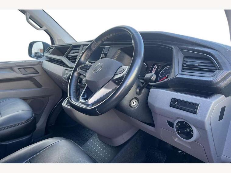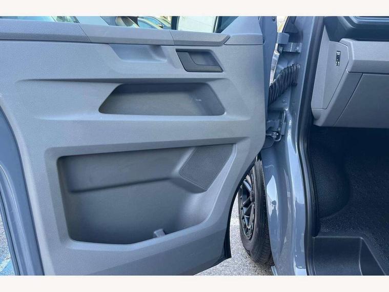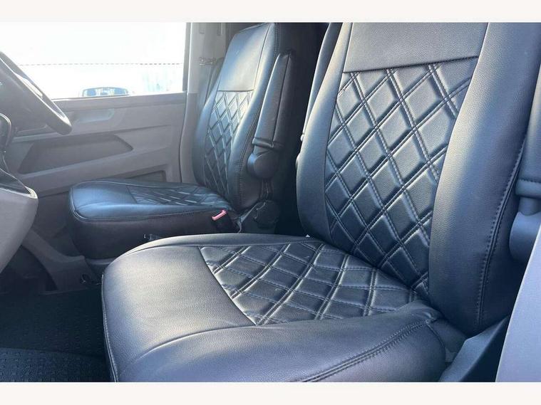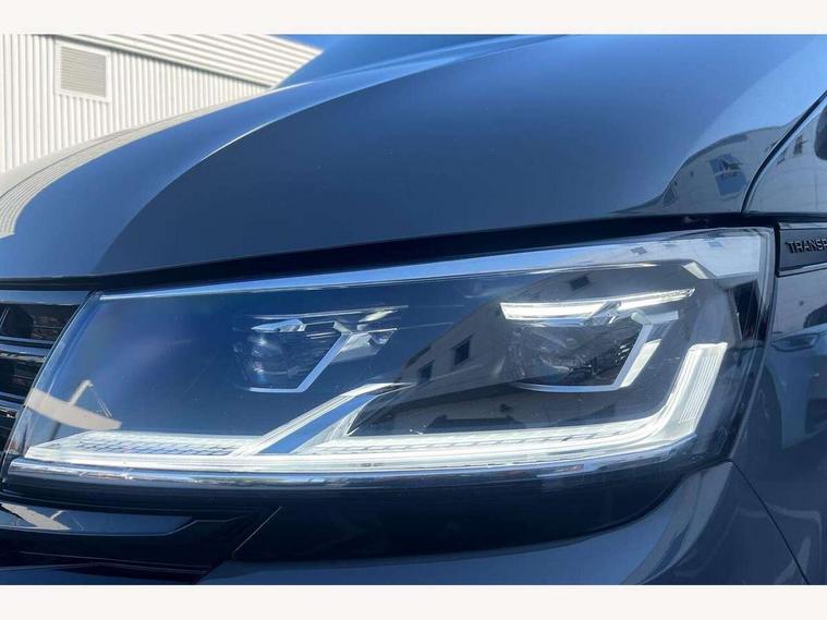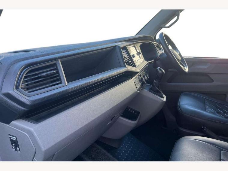 Adaptive cruise control, Cross wind assist, Dimmable illuminated instruments, Driver alert with Multi-function display plus, eCall emergency system, Electromechanical speed sensitive power steering, height and longitudinally adjustable steering column, Forward collision warning front assist with autonomous emergency braking, Mobile phone interface, Multi function display plus with black and white display, 2 USB interfaces type C in dashboard, 4 speakers with 2 tweeters and 2 woofers, Composition colour radio with 6.5" touchscreen, Digital radio reception (DAB+), Volkswagen app connect, Automatic headlight control, leaving home and manual coming home feature, Closing rear wing door with unlatching from the inside, Front fog lamps with cornering light, Heat insulating glass (green) in cab and passenger/load compartment, Heated front windscreen, Left convex exterior mirror, Power folding adjustable door mirrors with separately heated, Radiator grille with 2 chrome trims, Rear wing doors without window apertures, Right convex exterior mirror, Transporter nameplate on the rear fender, Windshield wiper intermittent control with rain sensor for windshield wipers, 3 spoke leather wrapped multi function steering wheel, Auto dimming breakaway interior rear view mirror, Comfort headliner in cab, hardboard roof trim in passenger and load compartment, Dust/pollen filter, Front and rear left without window closed side panel in load compartment, Front seats on the right in 1st row of seat, Glove compartment with illumination, Heavy duty tool kit and jack, High partition, Interior plastic loading edge protection, LED Interior lighting in load and passenger compartment, Manual adjustable lumbar support for right single seat in 1st row seats, Refrigerant R134a, Standard lower part dashboard in palladium, Storage compartments on cab seats and reading light, Without right side window apertures in passenger and load compartment, Comfort pack - Transporter, Exterior pack without fog light- Transporter, Non smoker pack - Transporter, 3 point height adjustable seat belts on outer seats cab with electric pretensioners, Driver and front passenger airbag with front passenger airbag deactivation, Warning buzzer and light for driver and front passenger seat belt not fastened, Without child safety lock in passenger compartment, Anti theft alarm system with interior monitoring in cab, backup horn and towing protection, Lockable wheel bolts, 16" chassis with 16" brake system, Additional 12V socket, Diesel particulate filter, Electronic stability control, ABS, ASR with deactivation button, hill start assist and brake assist system, Start/stop system with regenerative breaking, 16" Clayton alloy wheels,