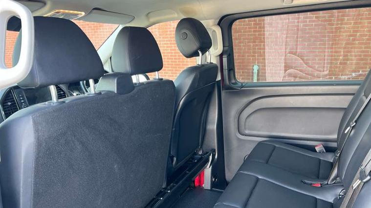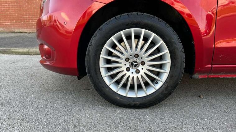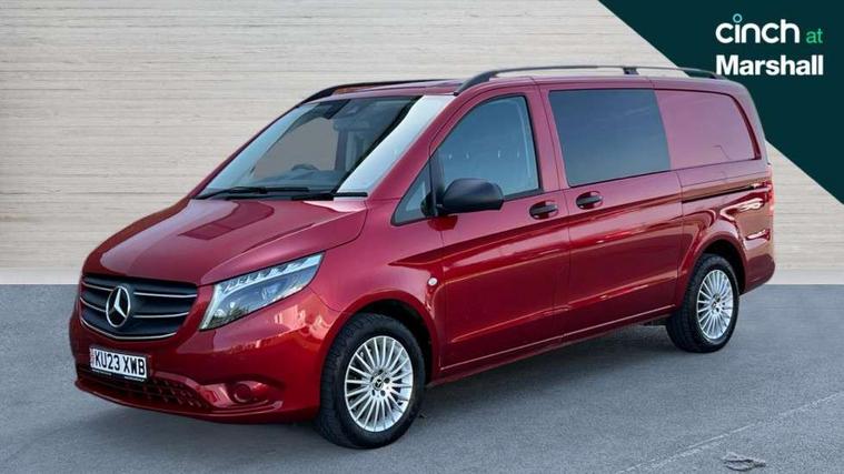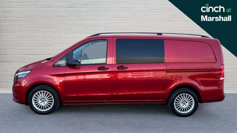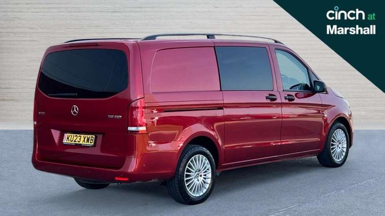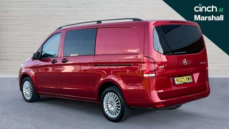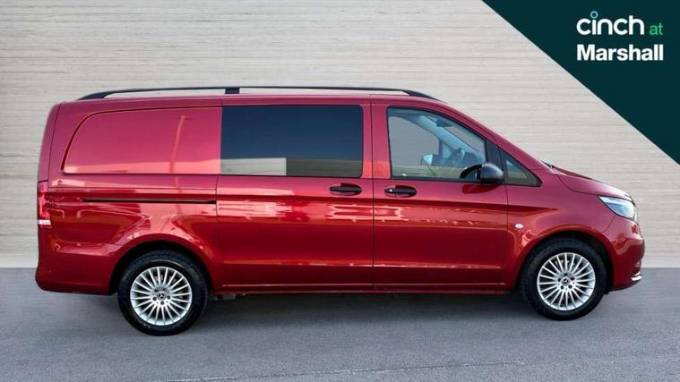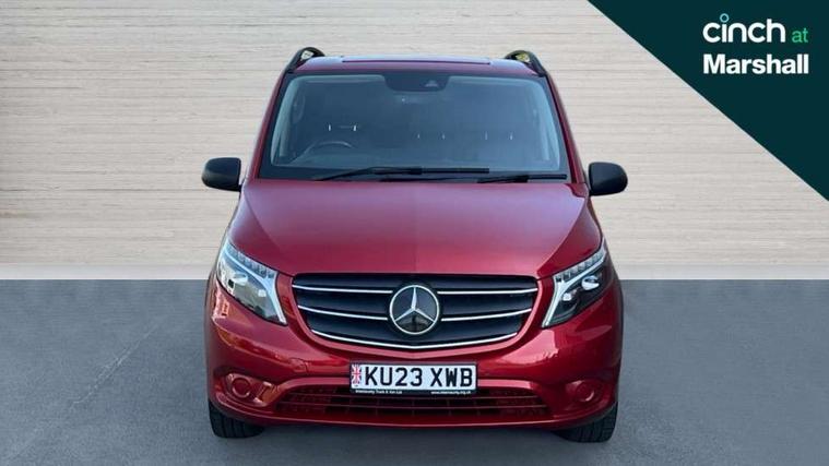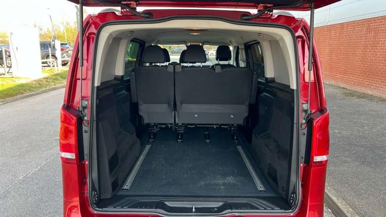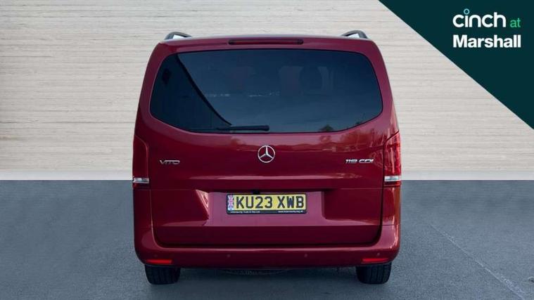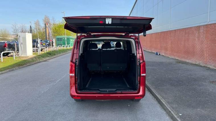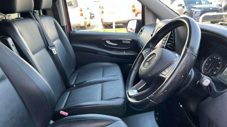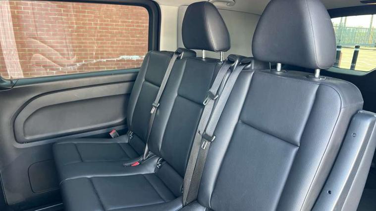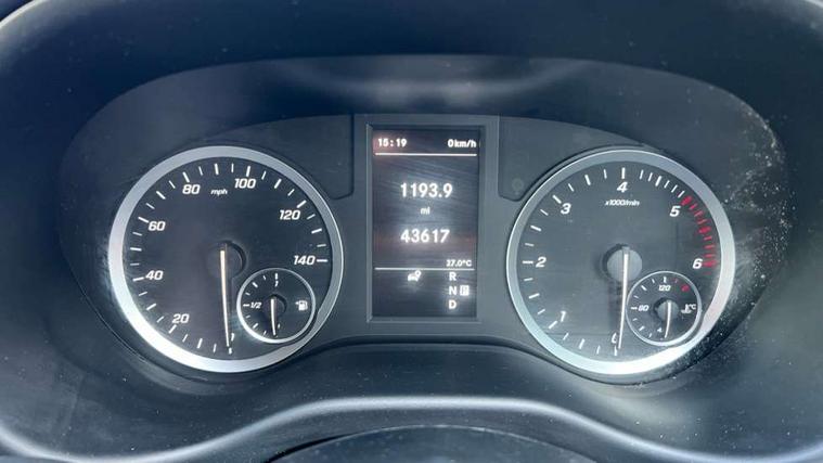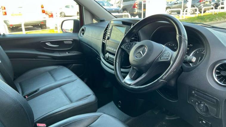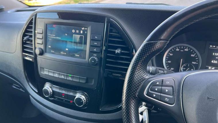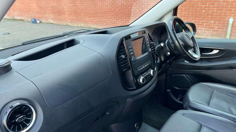 Chrome instrument cluster, Comfort overhead control panel, Digital clock, Headlight range control, Low fuel warning light, Parktronic system, PAS, Reversing camera, Seatbelt warning indicator, Warning lights, Wireless tyre pressure monitoring, Adaptive brake lights, Black tinted windows in rear, Chrome radiator grille, Colour coded front and rear bumpers, Daytime running lights, Electrically heated and adjustable wing mirrors, Front fog lights, Heat insulating glass, Tailgate with window, Third rear brake light, Ashtray, Cigarette lighter, Comfort eight way adjustable driver's seat, Driver's seat lumbar support, Electrical component for trailer socket, Front door storage pockets, Height and rake adjustable steering wheel, Locking glove compartment, Multifunctional steering wheel, Velour floor mats, Ventilation nozzles, Wood load flooring, Anti theft protection pack - Vito, 3 point seatbelts for all seats, Accident recovery management, Attention assist, Co-driver airbag, Crosswind assist, Driver's airbag, Central locking with remote control, Double locking, Electronic immobiliser, 24 litre larger AdBlue tanks, 9G tronic automatic gearbox, ABS/ESP/ASR, Active brake assist, Diesel particulate filter, EBV and BAS, Hill start assist, Mechanical parking brake, Traction control,