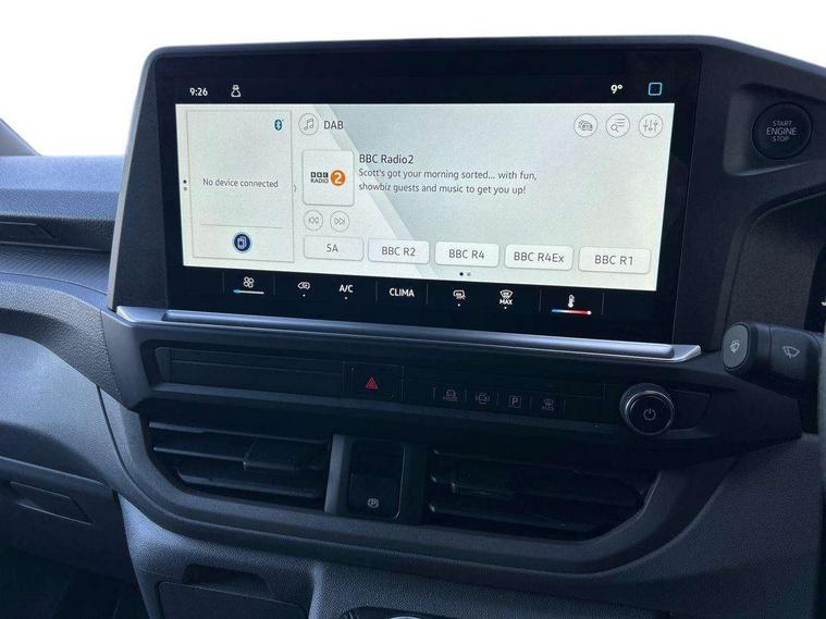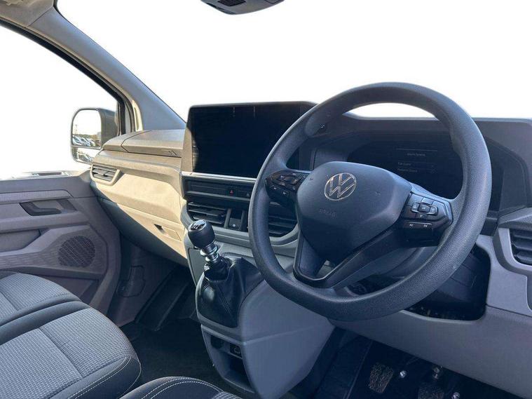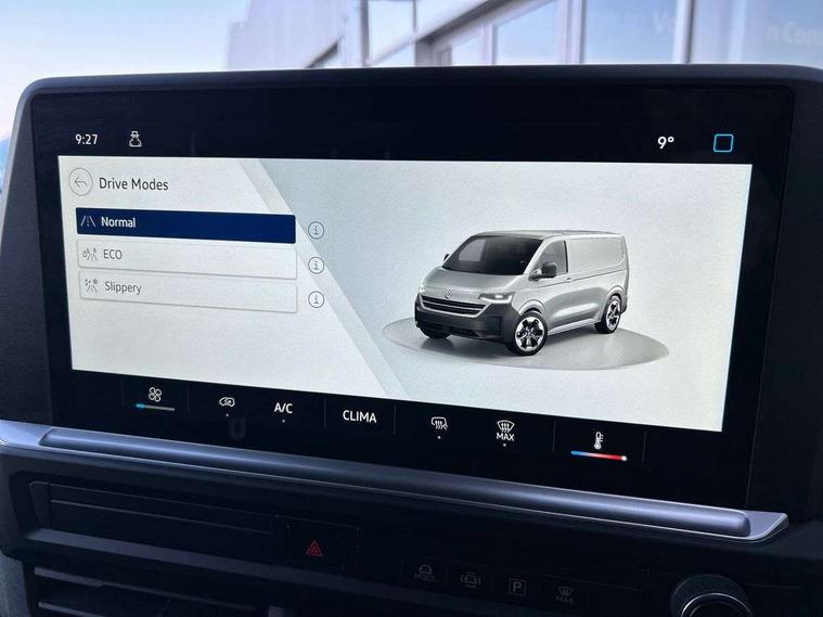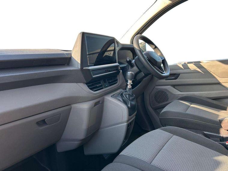 12" digital drivers display, 13" touchscreen infotainment display with wireless app connect and DAB radio, 5G Modem, Apple CarPlay and Android Auto, Cruise control, Dynamic road sign display, eCall emergency system, Electromechanical speed sensitive power steering, height and longitudinally adjustable steering column, Lane assist, Preparation of VW connect and connect plus, Wrong way driver warning, 4 speakers - 2x dashboard, 2x cab doors, Grained black door handles, Heat reflecting side window glass, High beam control, Laminated windshield made of heat-reflecting glass, LED rear combination lamps, Rear Transporter nameplate in black grained decorative trim, Vehicle opening configuration 1x 1st row of seats, 2x all doors, 2x 15-W USB data/charging ports in dashboard and 1x USB-C, 1x USB-A center bottom, 2x LED lights in load compartment, 4 way height and tilt adjustable head restraints, Black plastic scuff plate for sliding door in cargo without illumination, Cabin interior lighting, Lashing rings for reinforced floor covering, Narrow centre console with cup holder and compartment for mobile phone, Overhead storage compartment, Plastic gear lever, Roof grab handle on front passenger side, Rubber floor covering in cab, Standard glove compartment, Striped fabric upholstery, Without passenger seats in load compartment, Exterior pack 1 - Transporter, Interior trim pack - Transporter, Driver and front passenger airbag with front passenger airbag deactivation, Dual tone horn, Front and curtain airbags for driver and front passenger, Seat belt pretensioner for driver seat, Electronic immobiliser, Preparation for alcohol ignition interlock, 5+ Promise, Alternator - 230A, Electronic stability control, ABS, ASR with deactivation button, hill start assist and brake assist system,