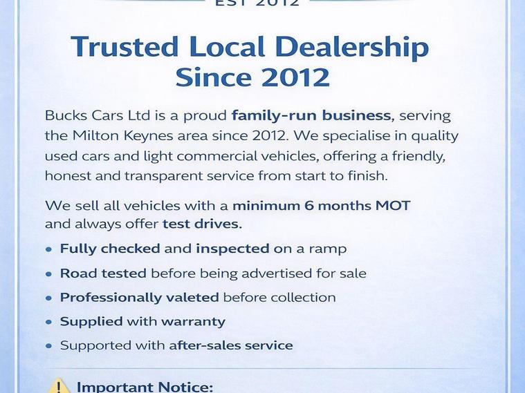 FULL SERVICE HISTORY-ONE OWNER -MOT valid until 11 March 2027---AIR CONDITION-? Bucks Cars Ltd? Unit 4, Dawson RoadGrove Ash, MK1 1BZ, Bletchley? Tel: 01908906961? Open:Monday –Friday:9:30am – 6:00pmSaturday: 10:00am – 2:00pm✅ Hpi Clear , ? Tel: 01908906961, ? WhatsApp: 01908906961 ? dealer's website 3 months warranty..