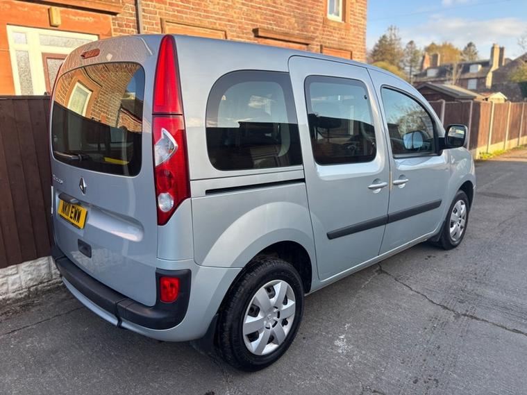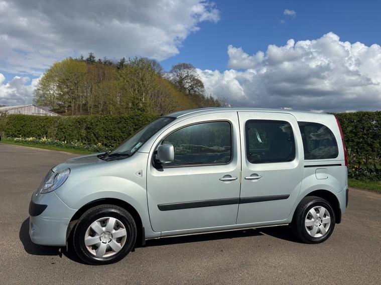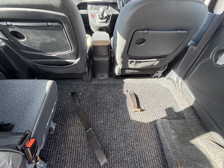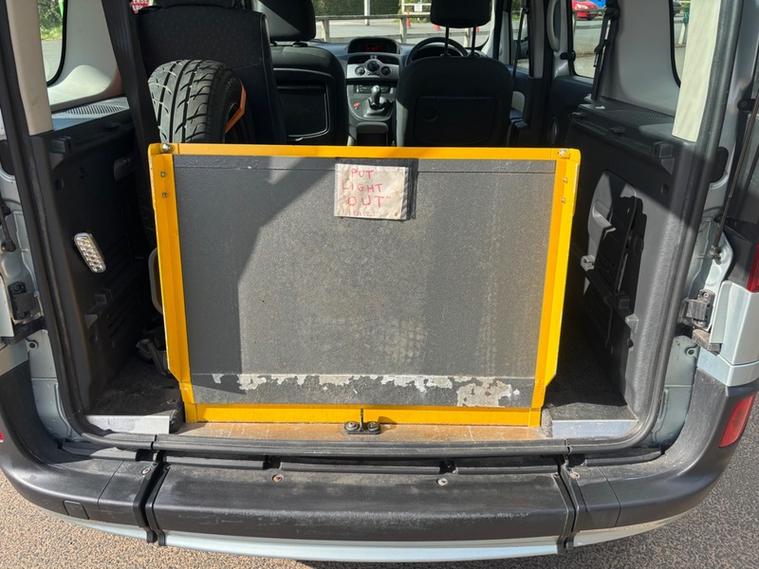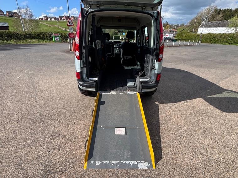 Wheelchair access vehicle with ramp and associated belts to secure a chair. Single seat to one side in the rear, two up front.