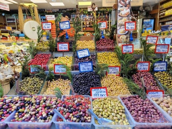 Dan lopen we door de straten met de vele kraampjes verse vis, fruit en groenten. In een prachtige winkel kopen we het lekkerste Turks fruit en eten wij gebakjes.