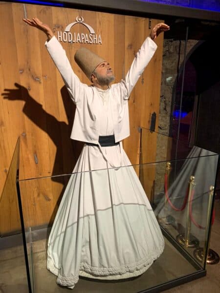 Mama had ergens een poster gezien van Derwisj en wil daar graag naartoe. En onze fantastische gids Mesut heeft dat geregeld voor vanavond. Het is een bijzondere voorstelling van dansende oftewel draaiende Derwisjen, die volgens een heel ritueel tranceachtige draaiende bewegingen maken. Het is een mystieke ervaring om de mannen (Islamitische geestelijken) in witte rokken verbazingwekkend snel om hun as te zien wervelen op de meegaande muziek.