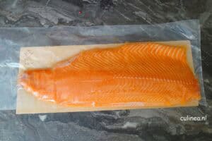 - Dep de zalm droog met keukenpapier en leg de zalm met velkant naar onderen op de houten plank.